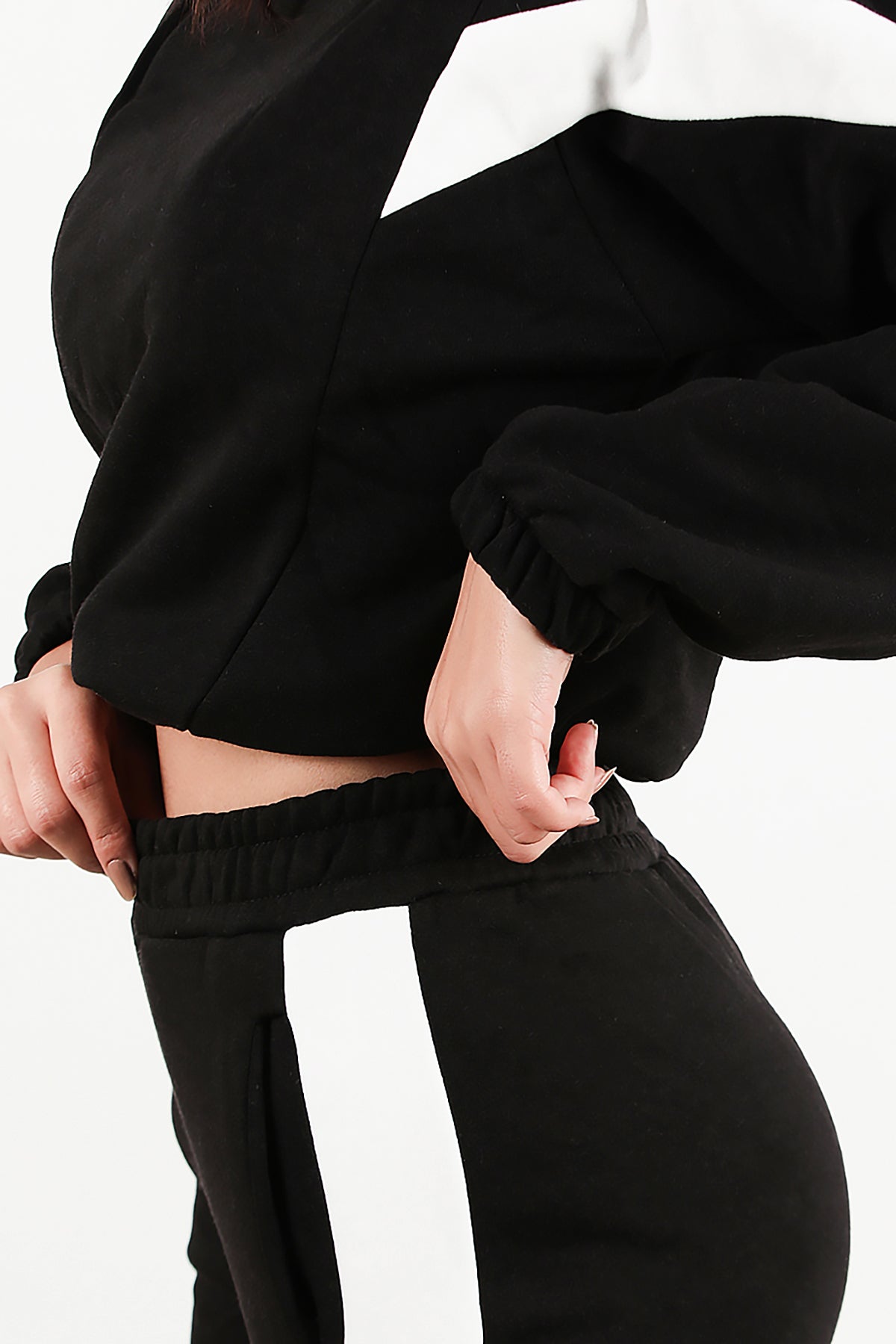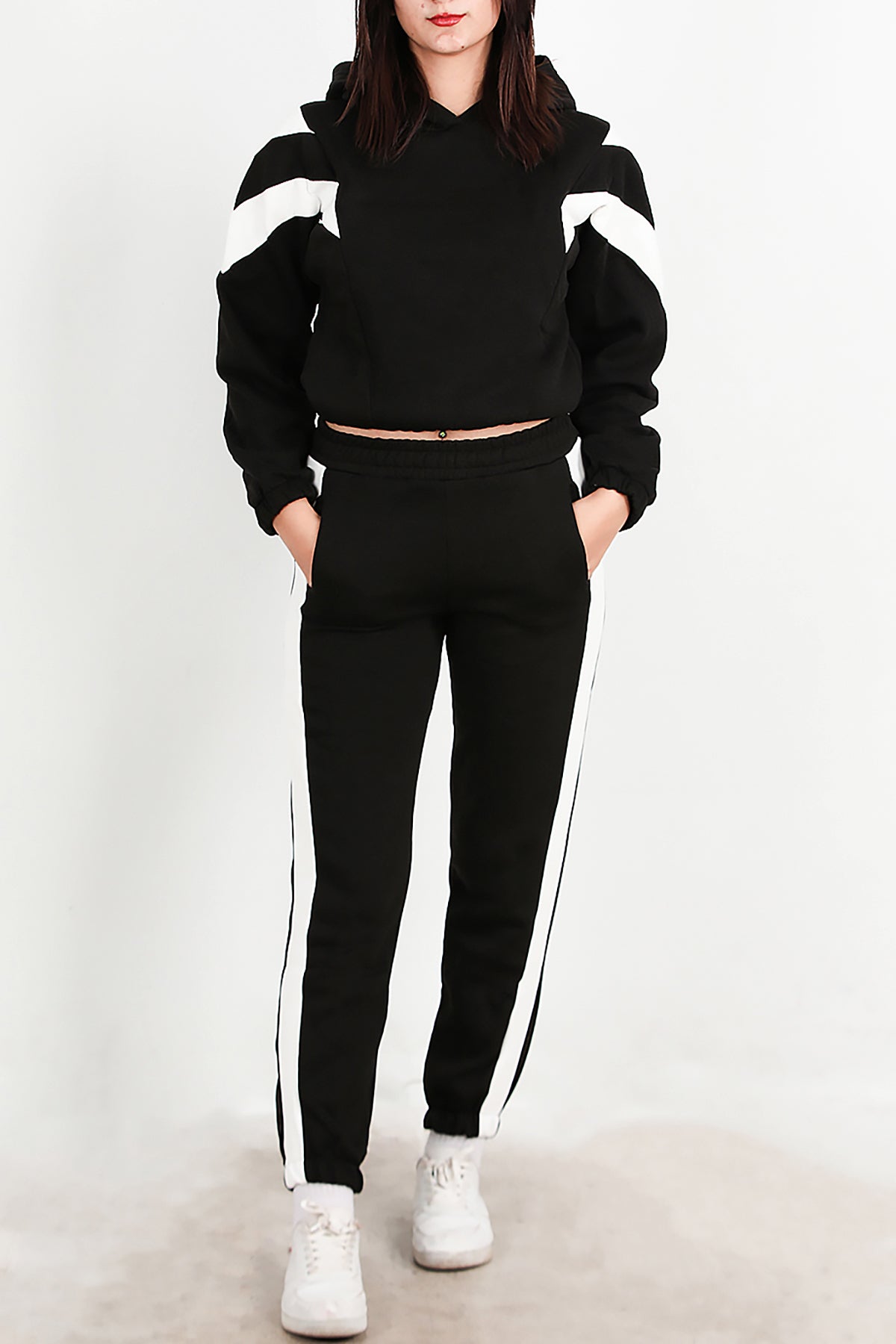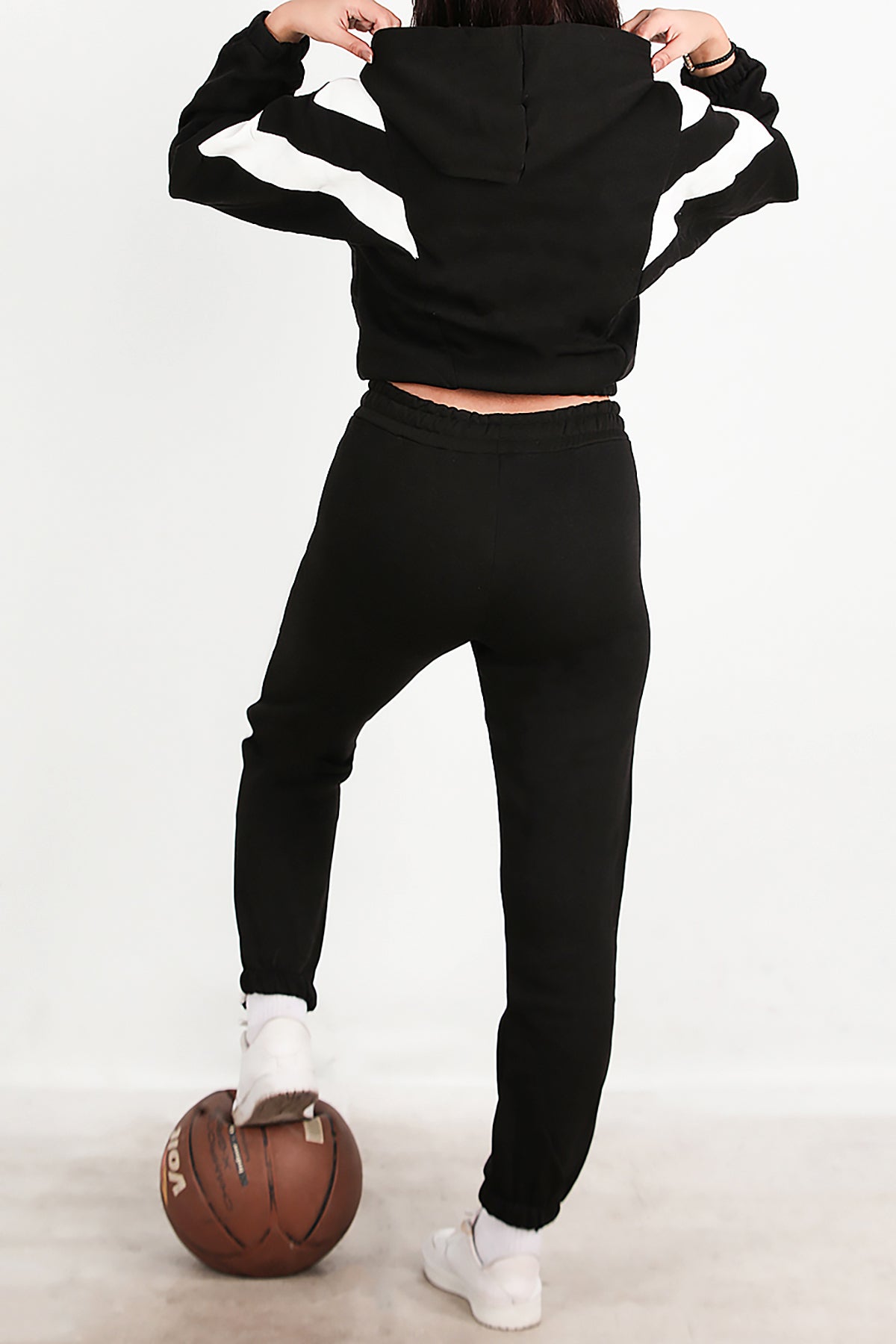 Kadın Şeritli Kapşonlu Eşofman Takımı Siyah