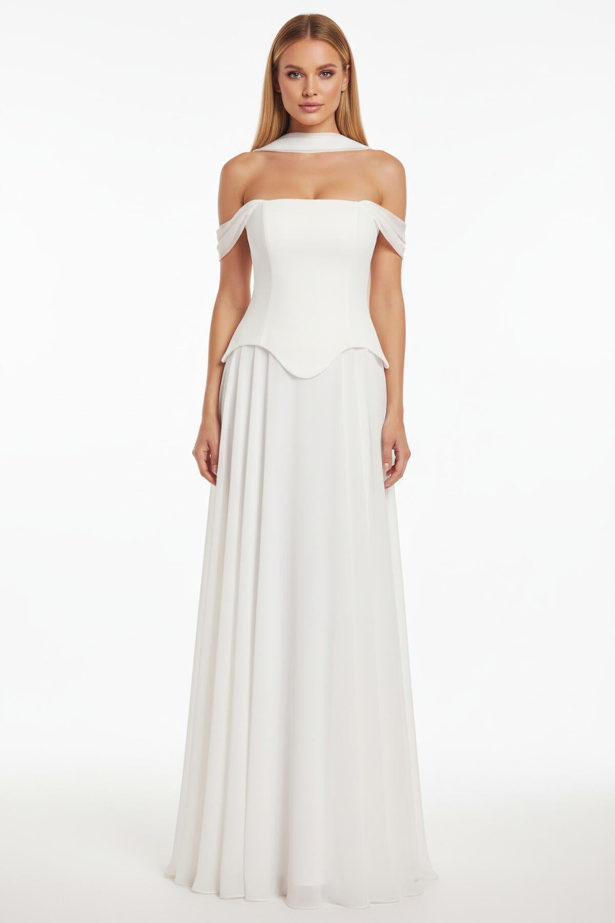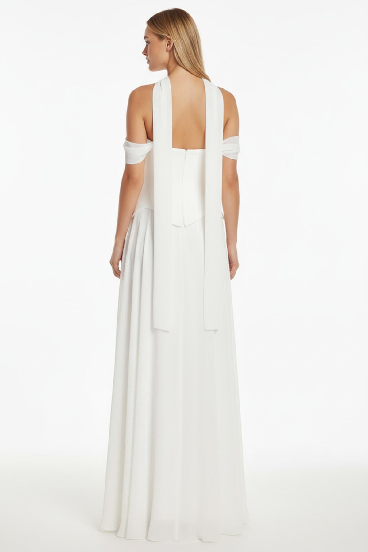 Kadın Şifon Dabl Uzun Abiye Ekru