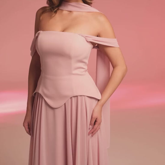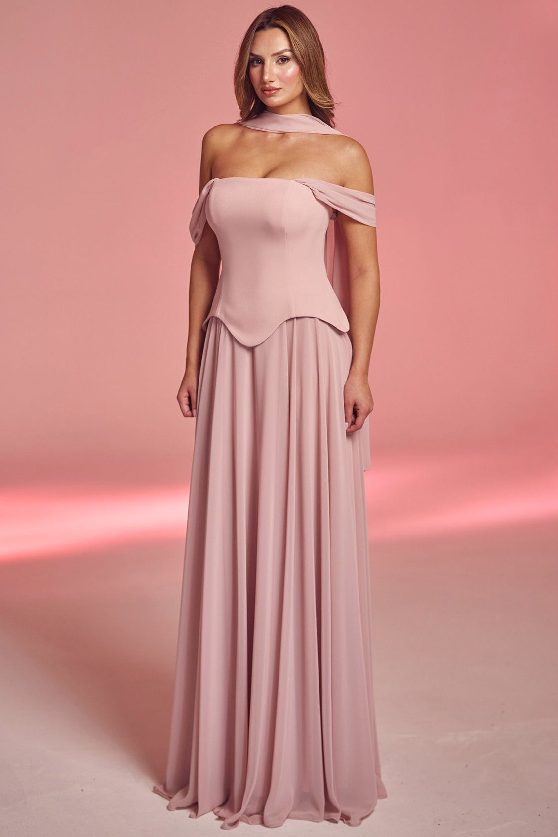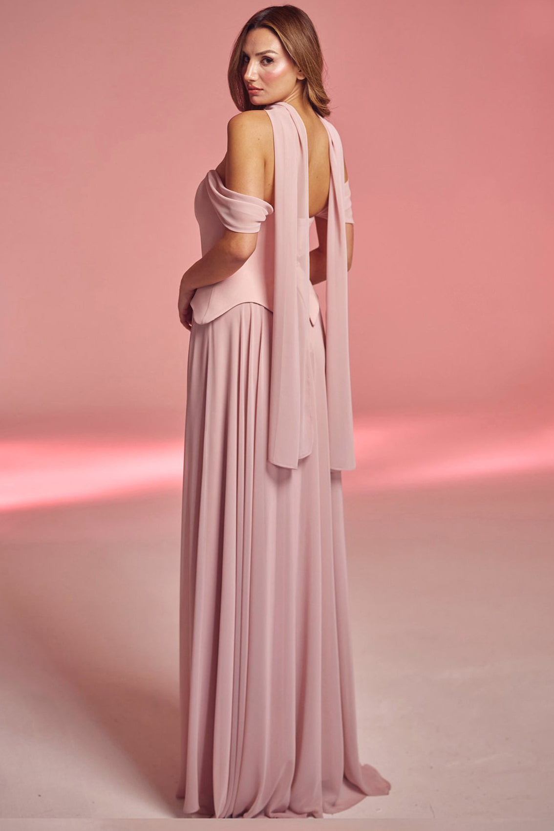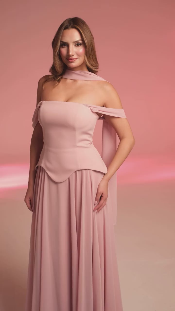 Kadın Şifon Dabl Uzun Abiye Pudra