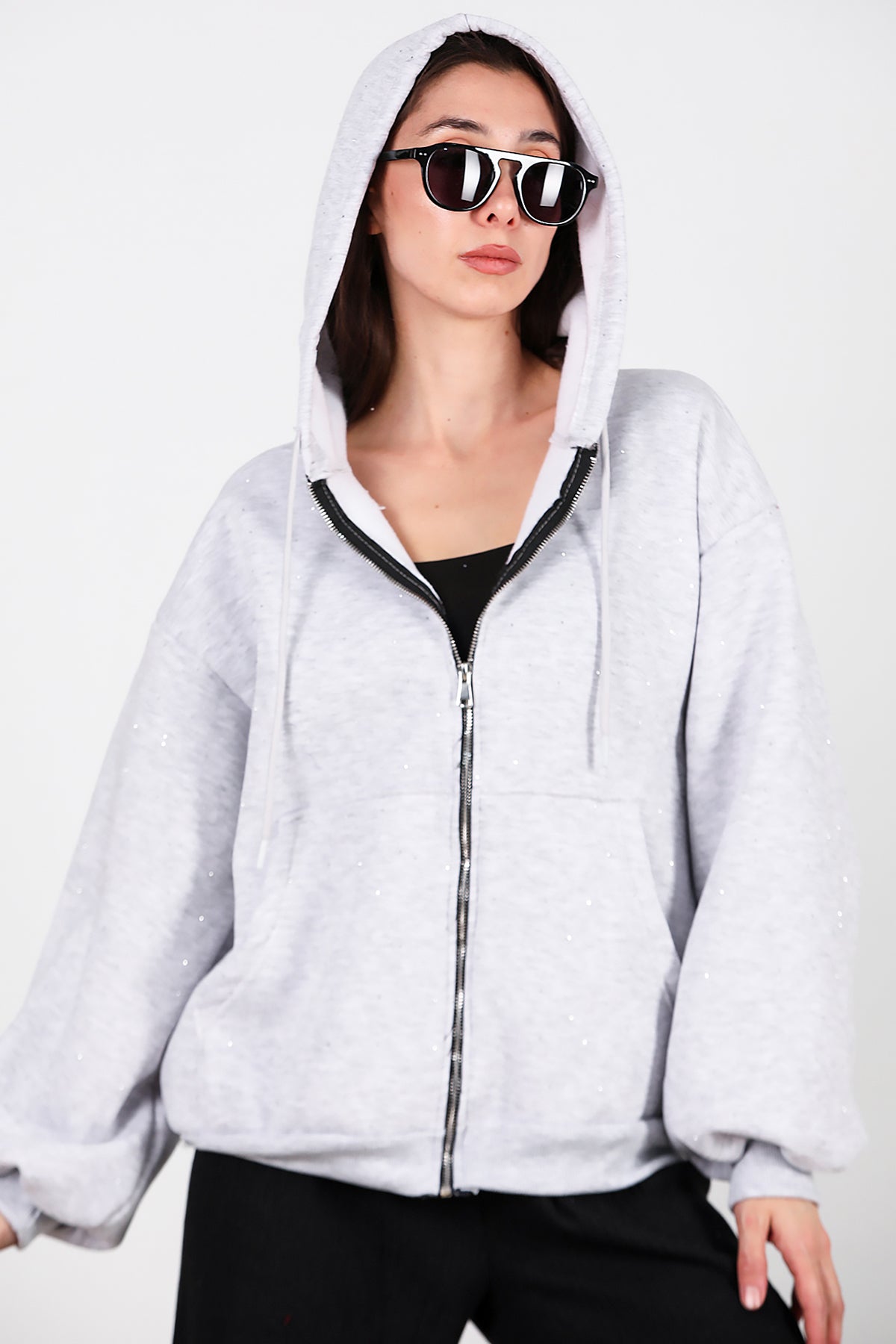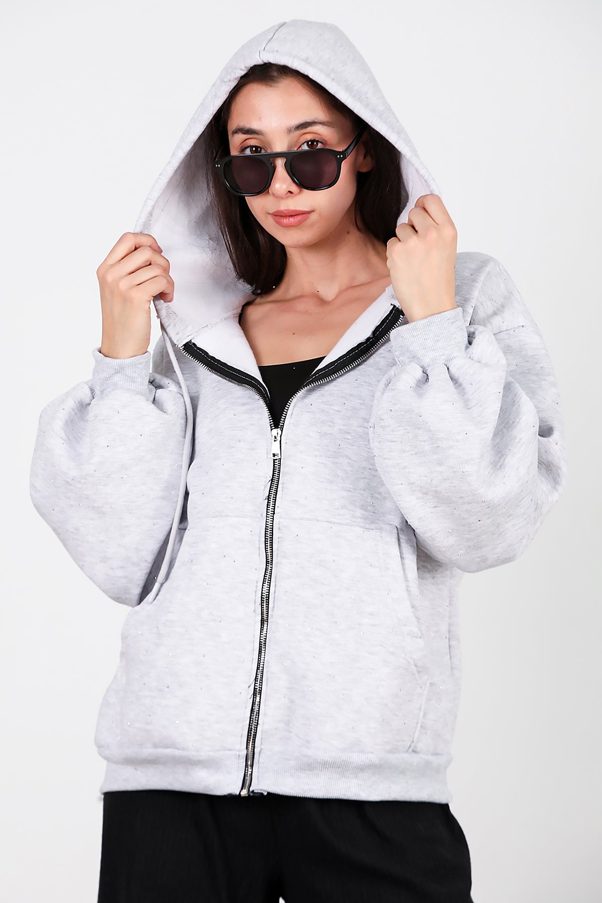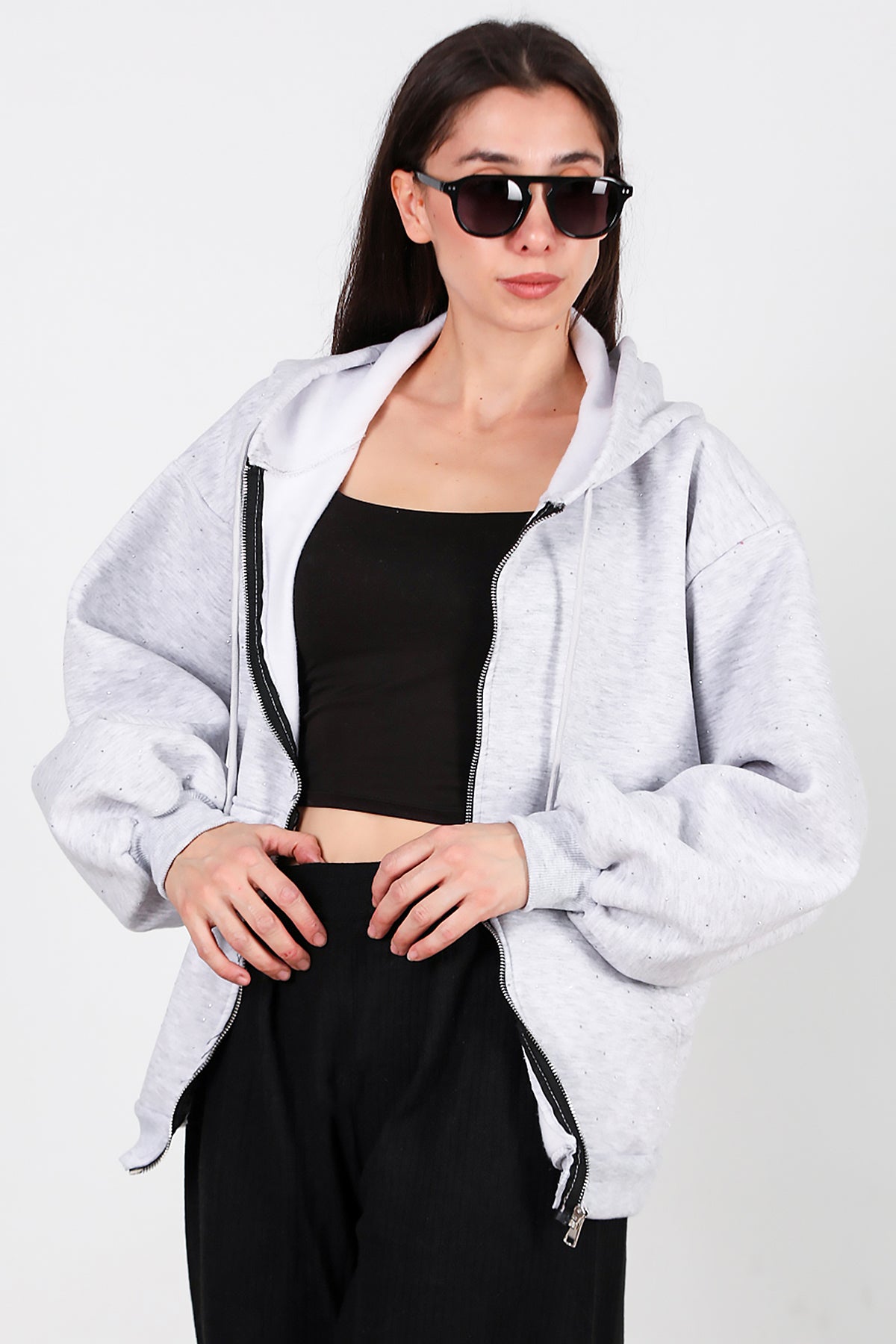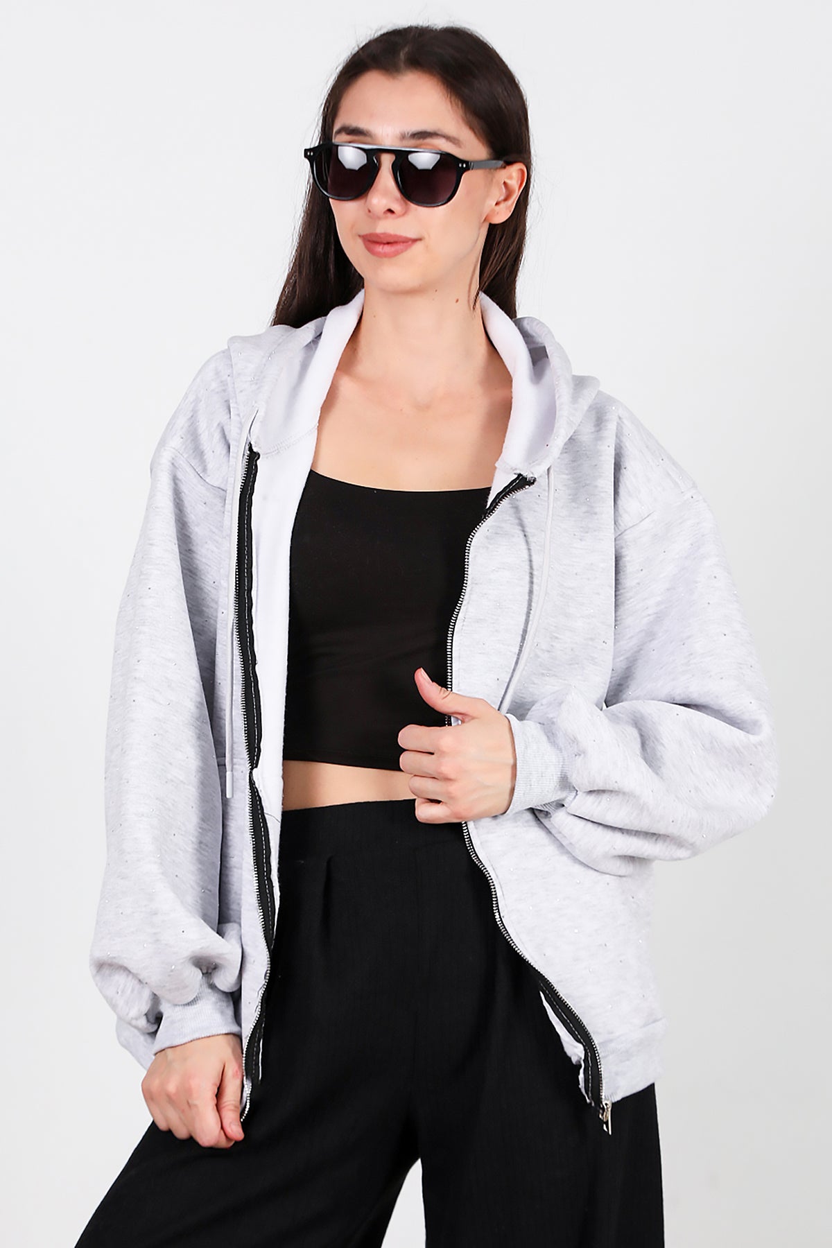 Kadın Taş Detay Kapşonlu Önü Fermuarlı Ceket Gri