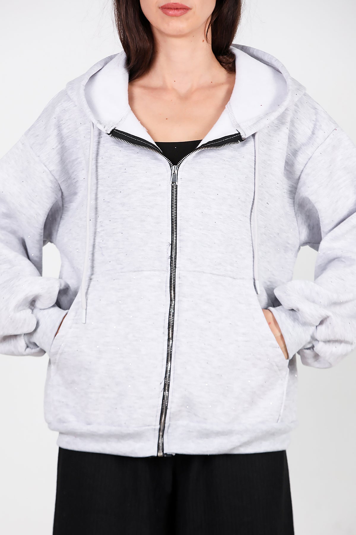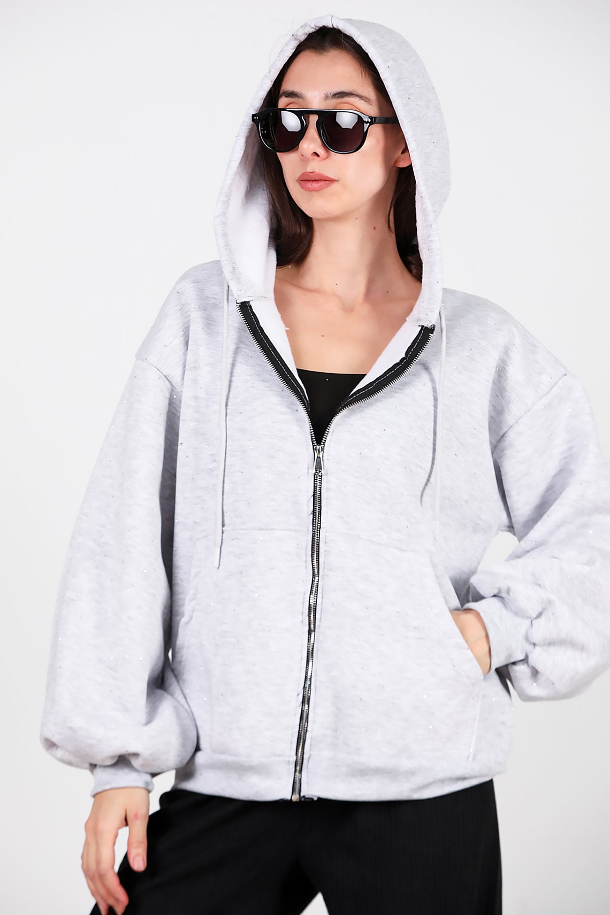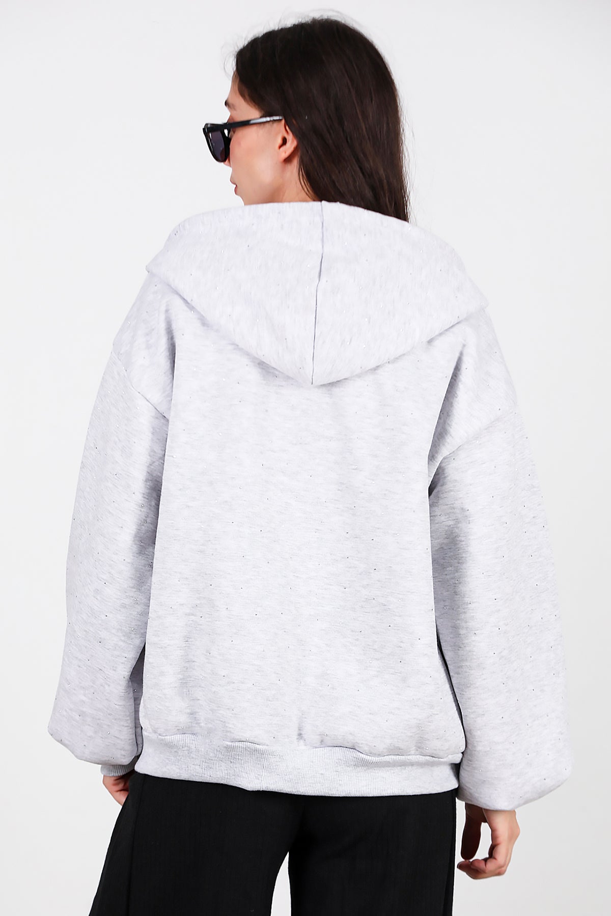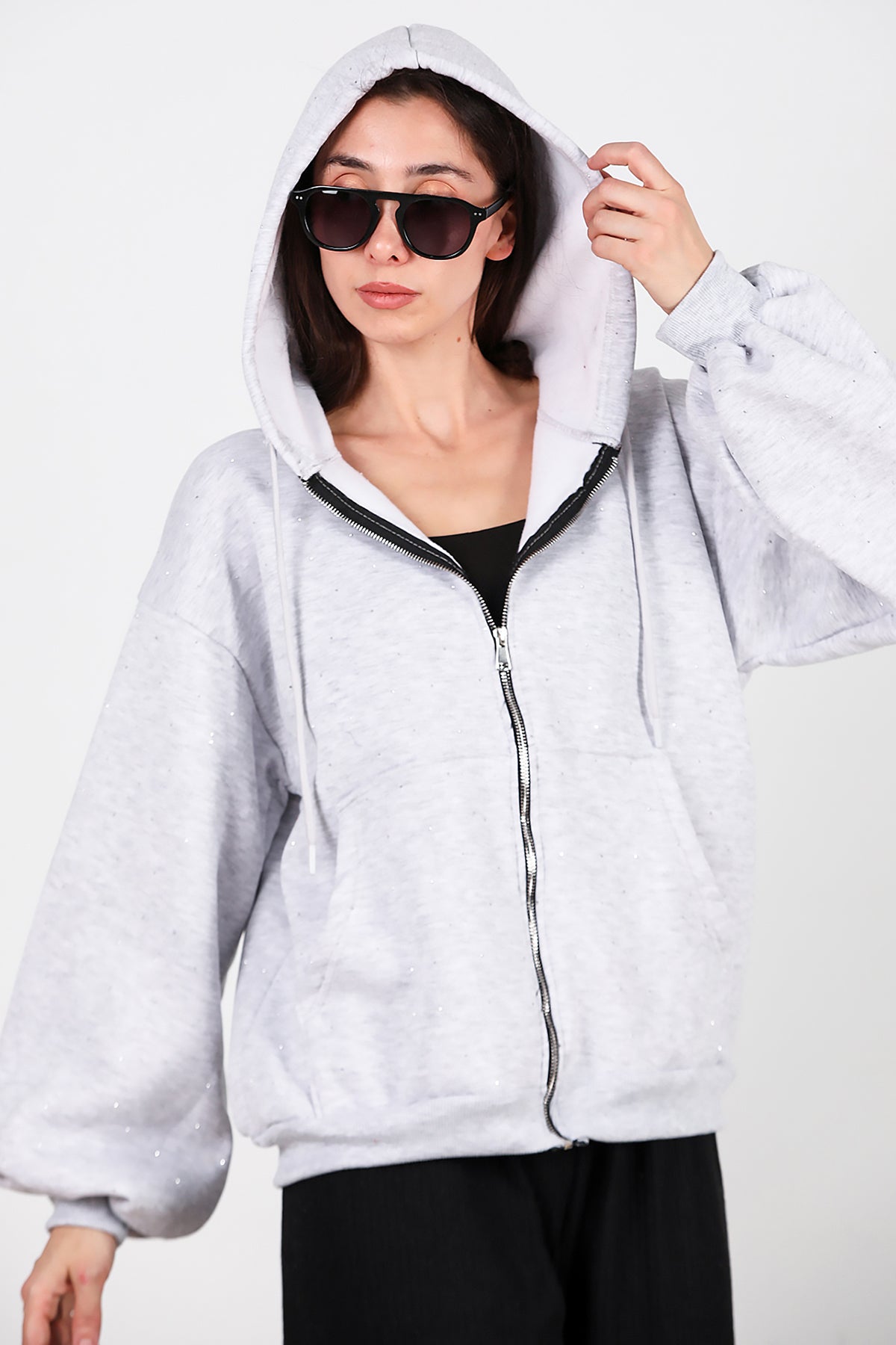Kadın Taş Detay Kapşonlu Önü Fermuarlı Ceket Gri
