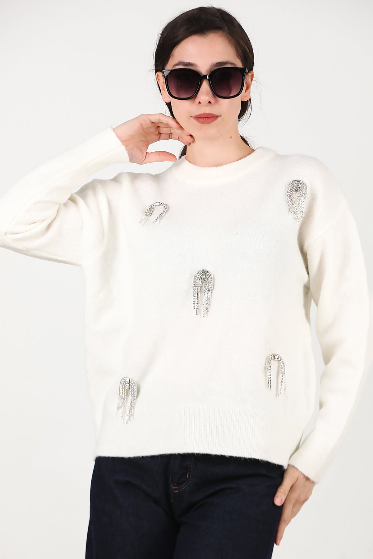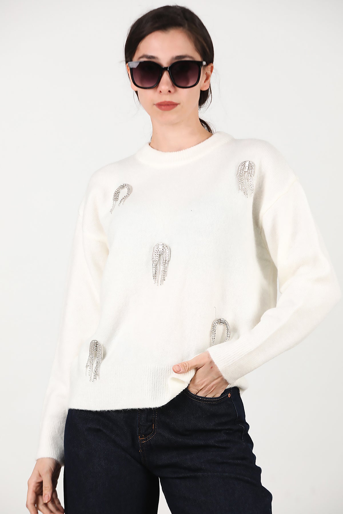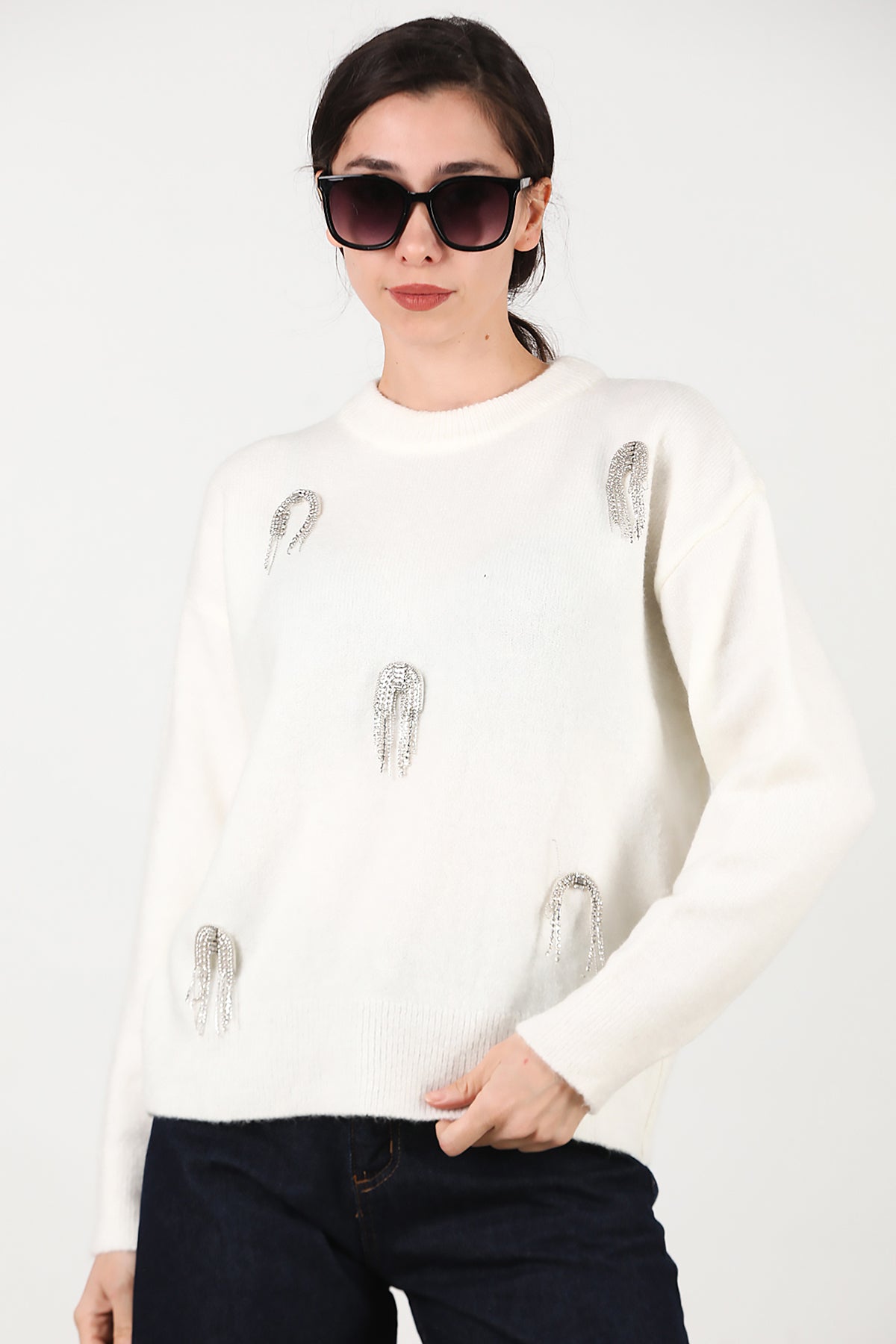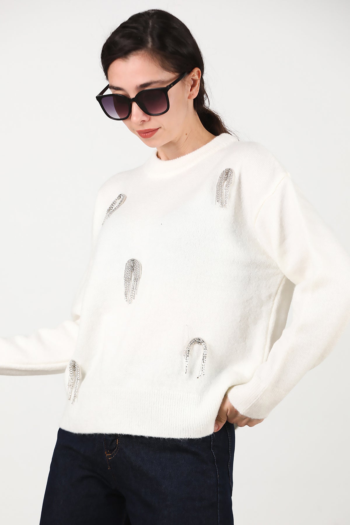 Kadın Taş Detay Kazak Ekru