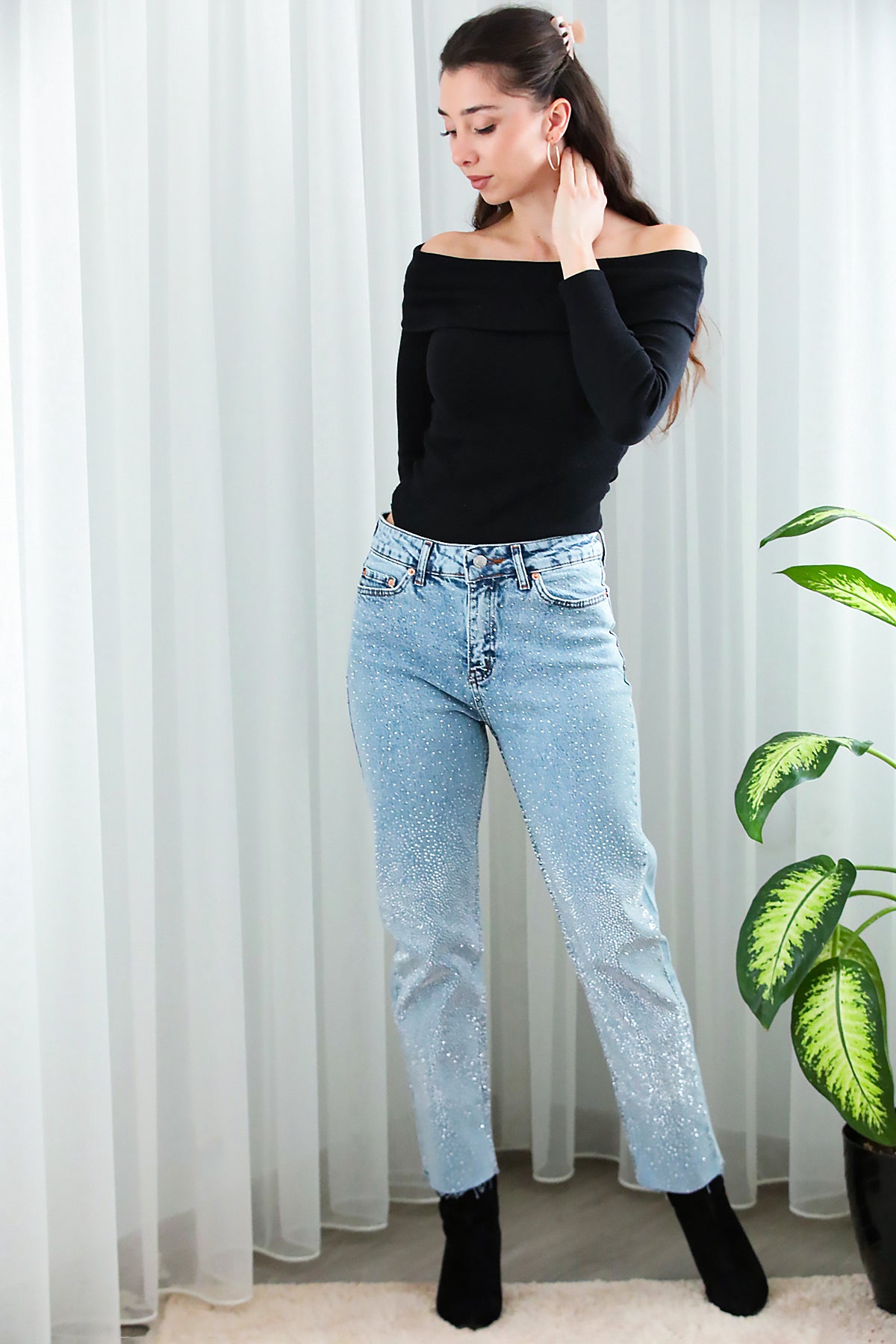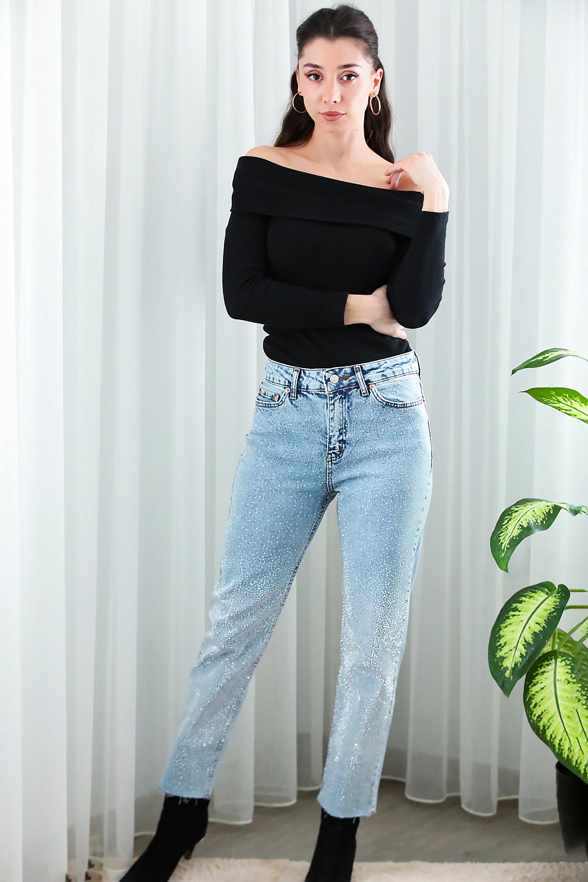 Kadın Taş Kaplama Kot Pantolon Mavi
