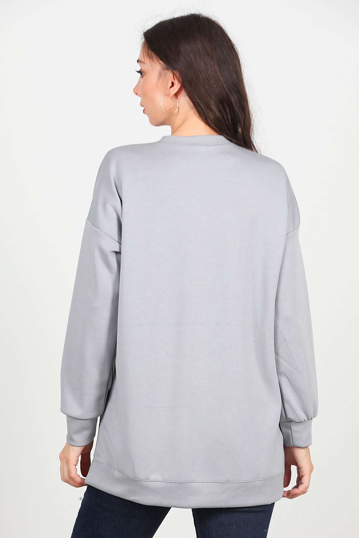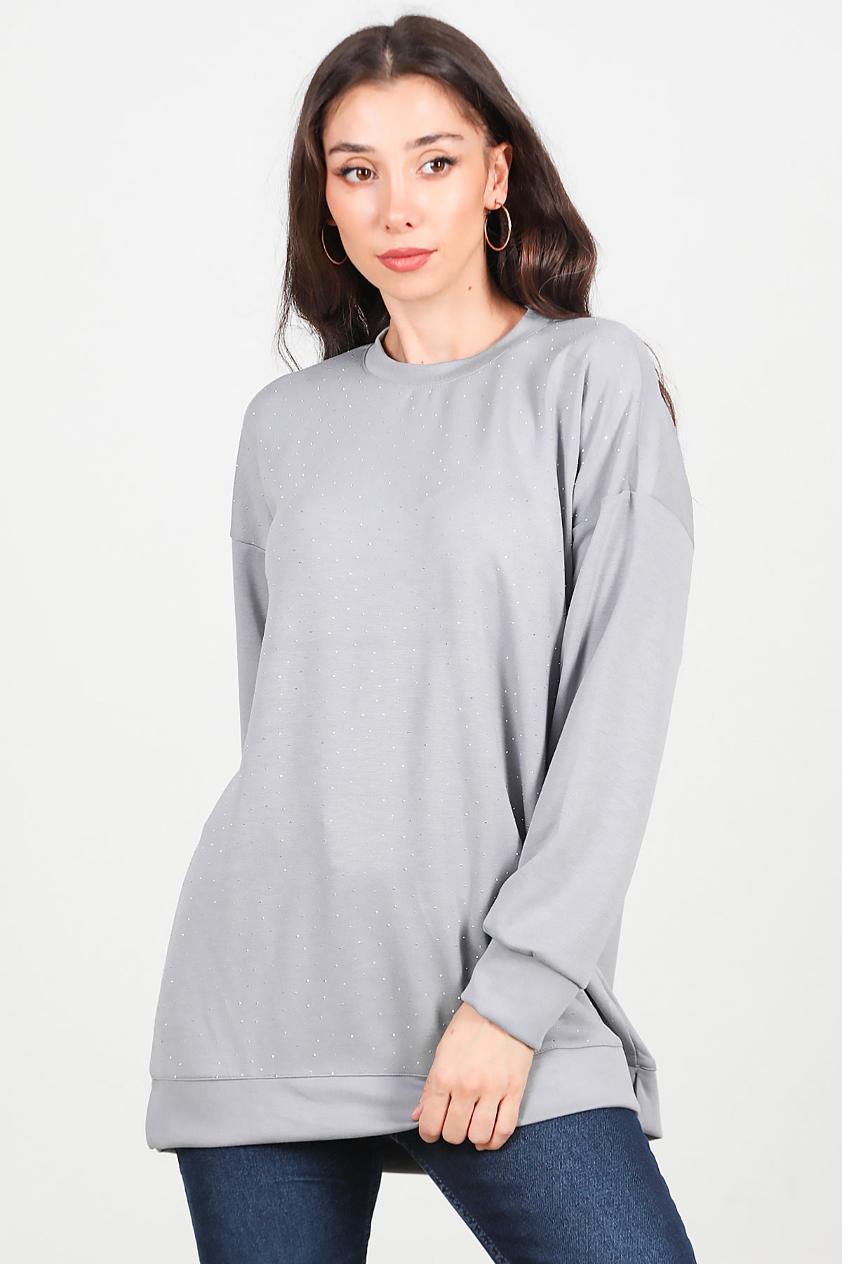 Kadın Taşlı Bisiklet Yaka Sweat Gri