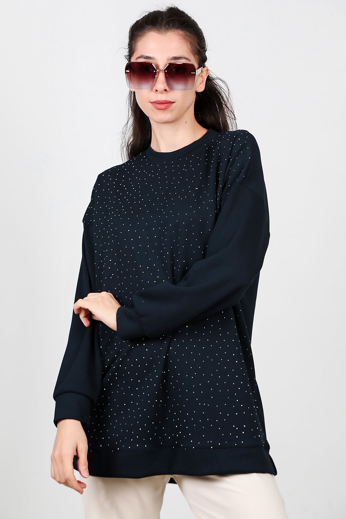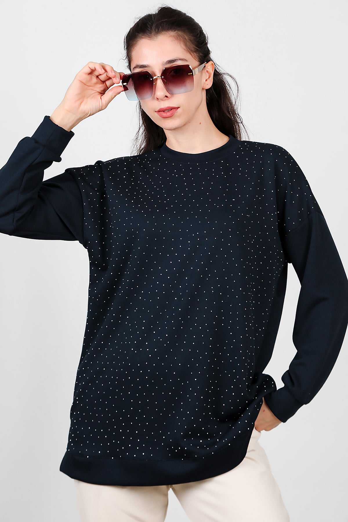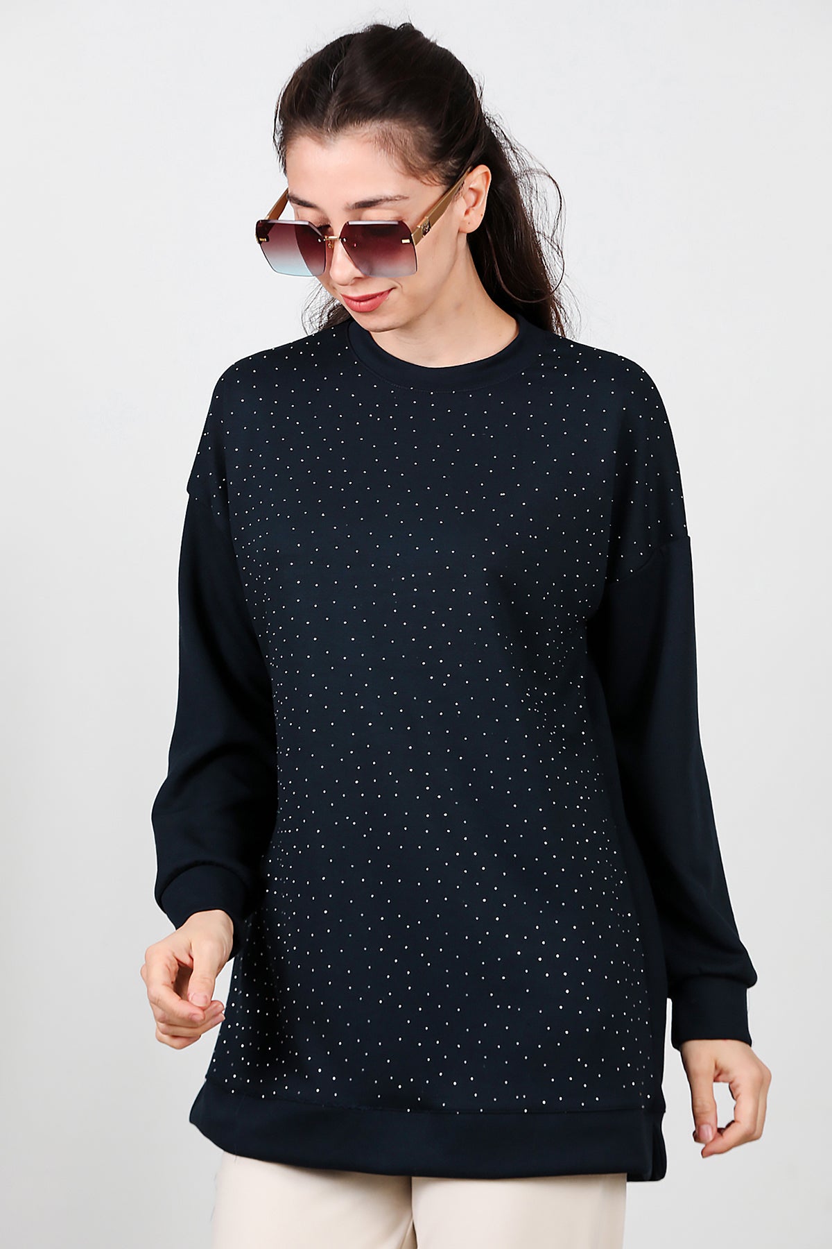 Kadın Taşlı Bisiklet Yaka Sweat Lacivert