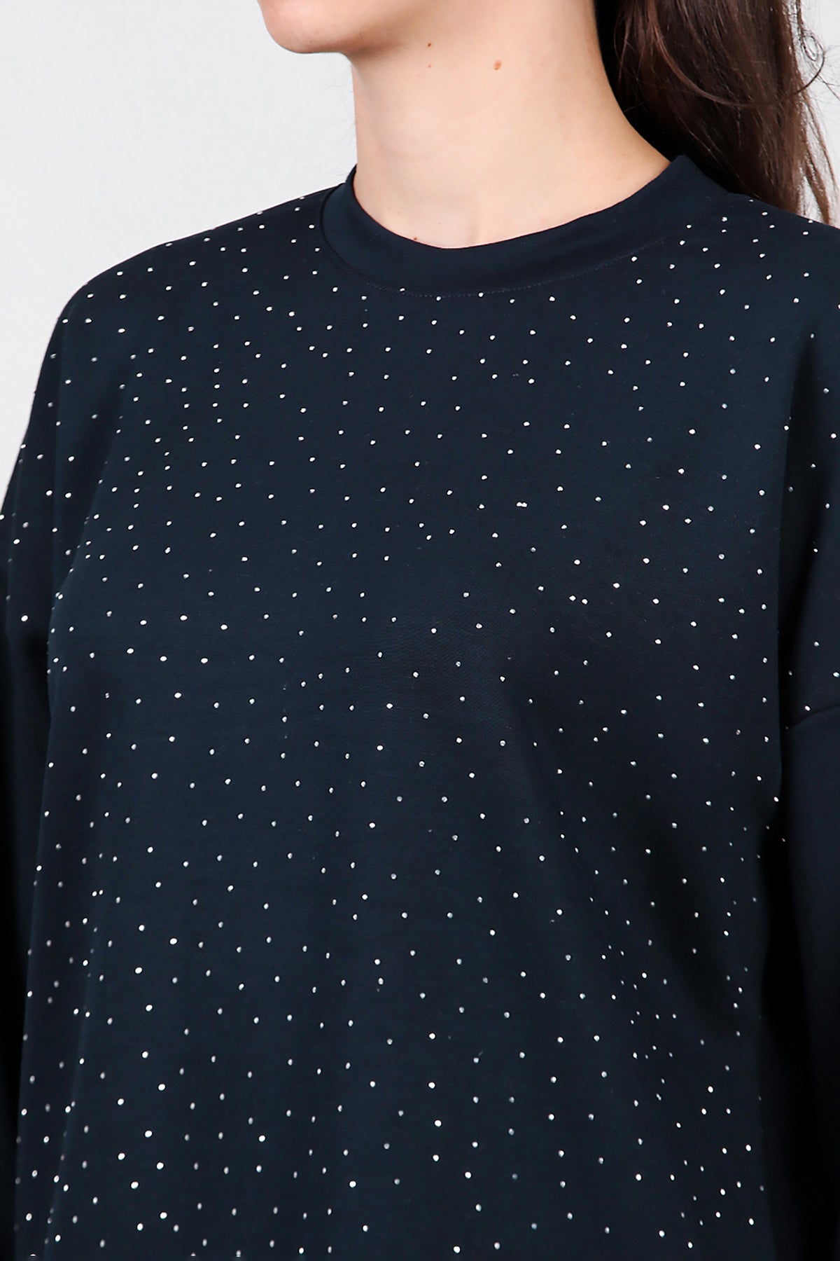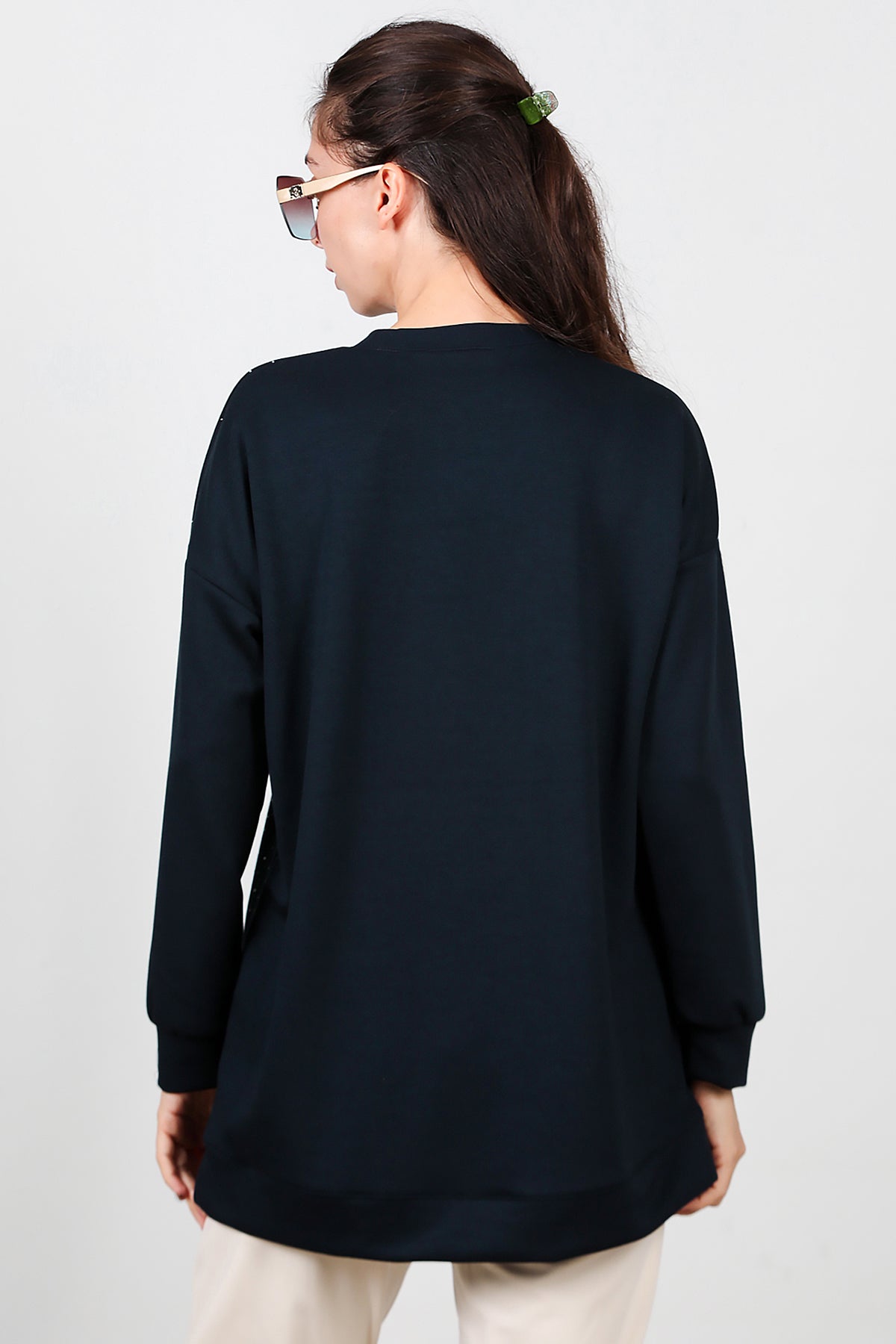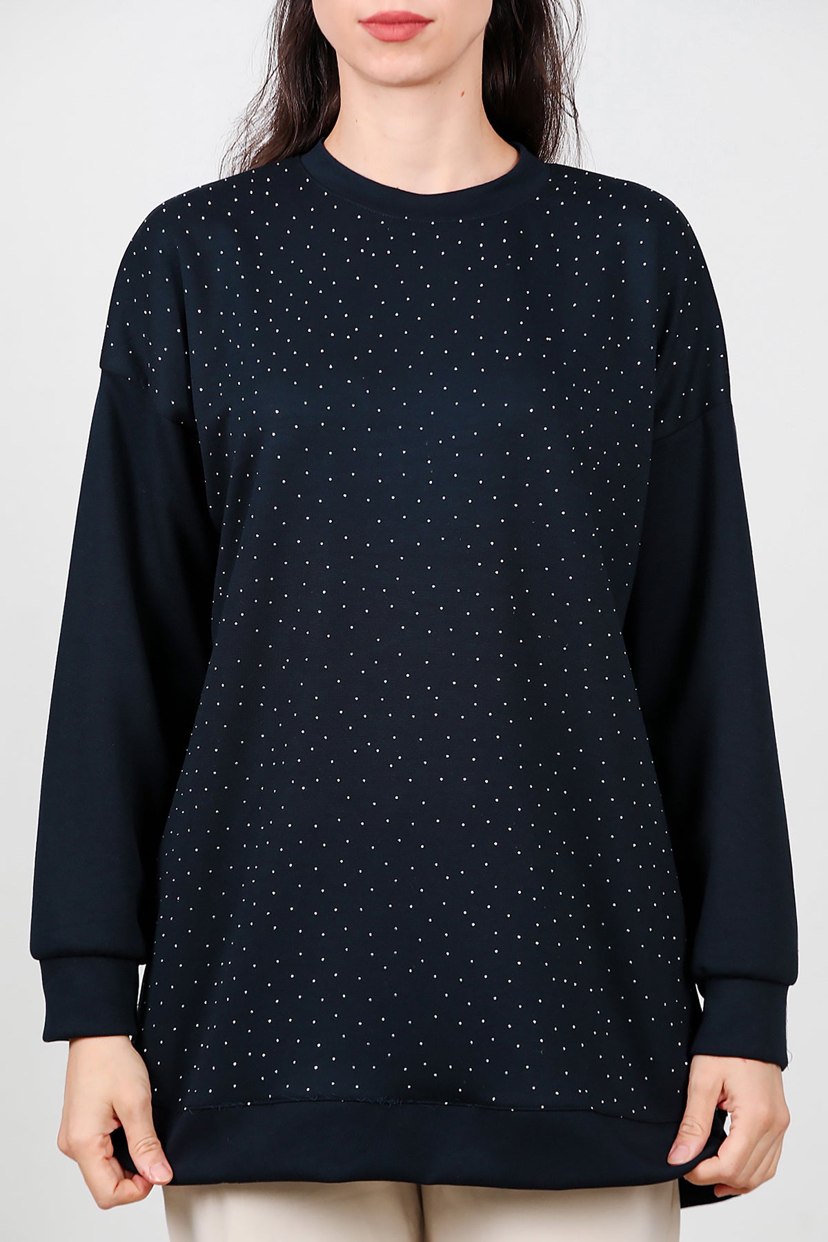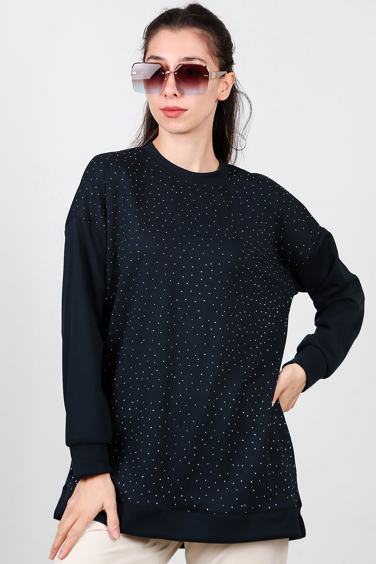 Kadın Taşlı Bisiklet Yaka Sweat Lacivert