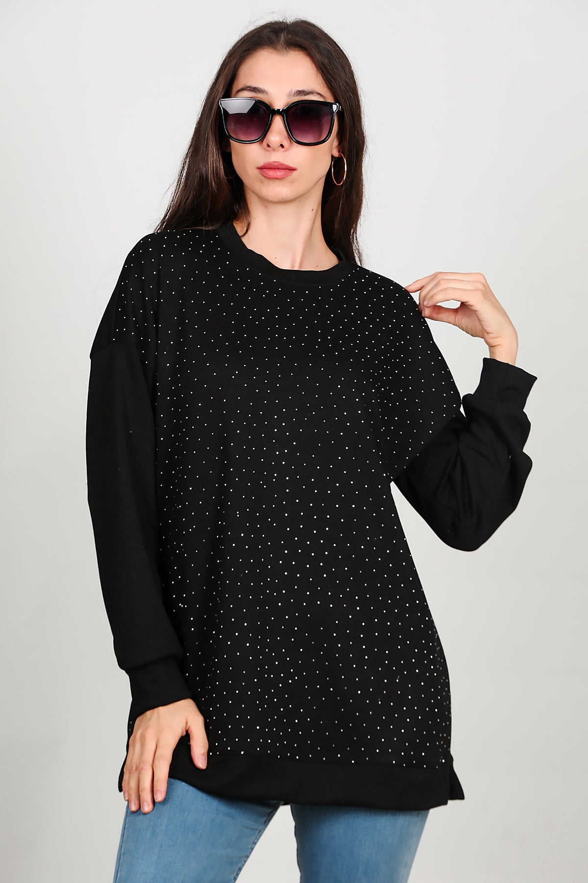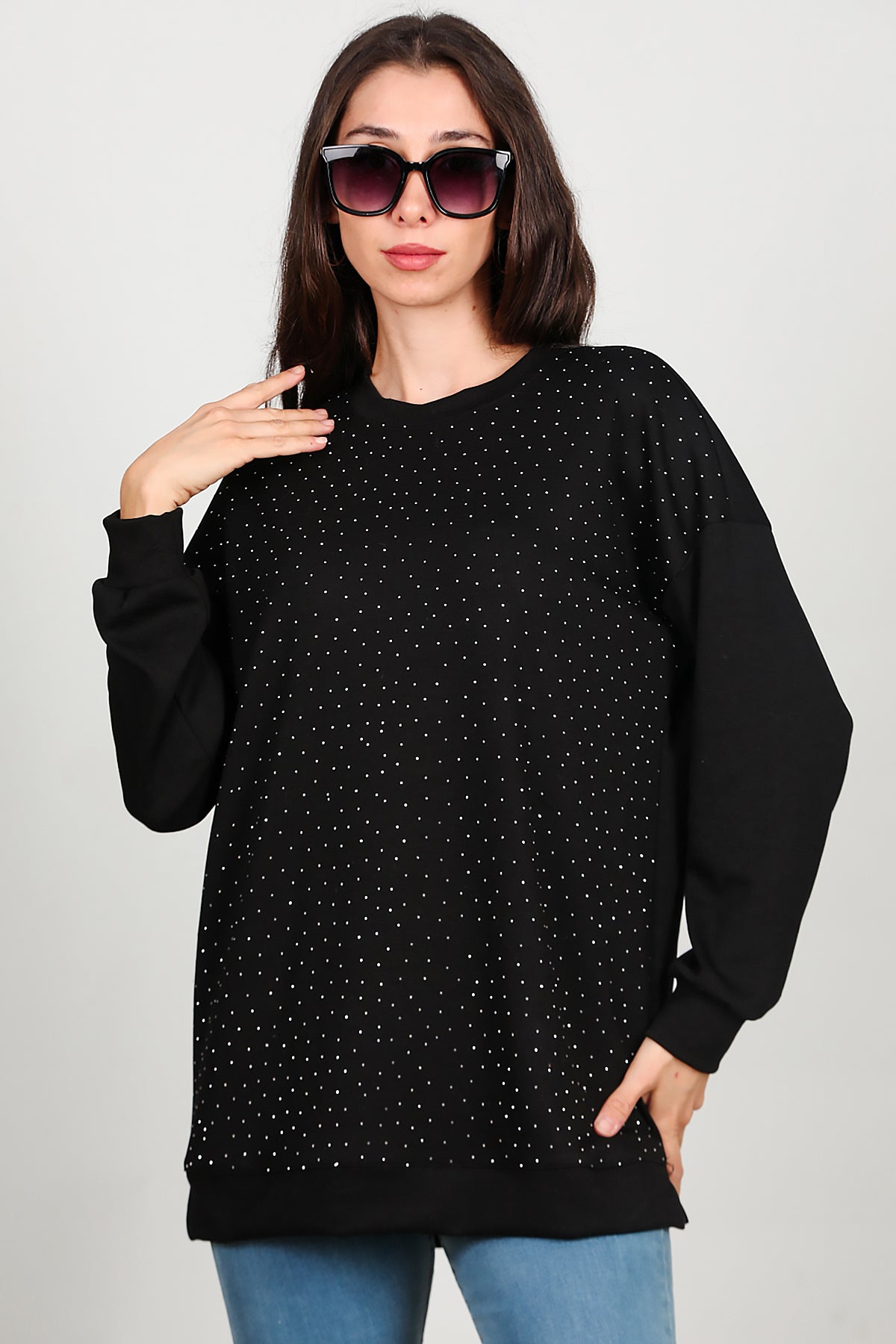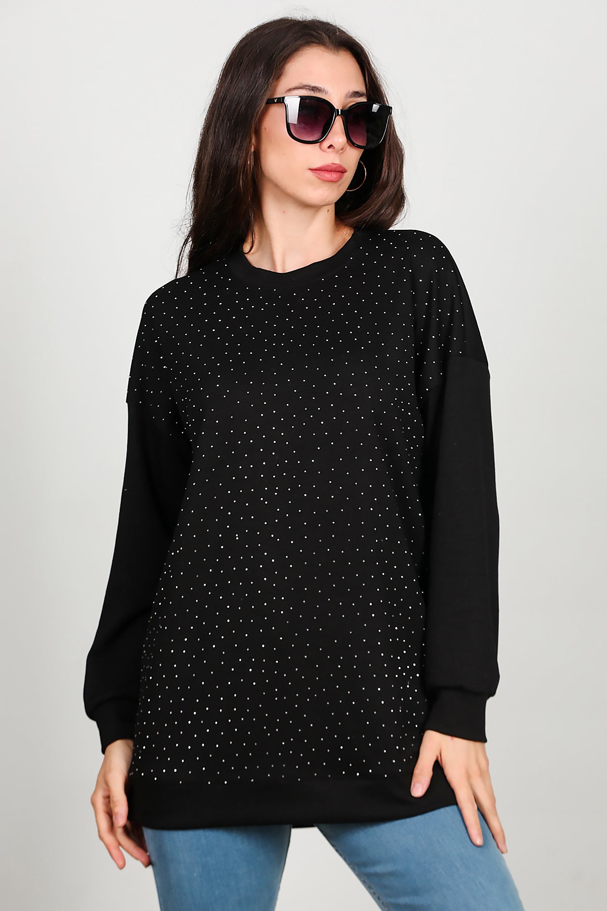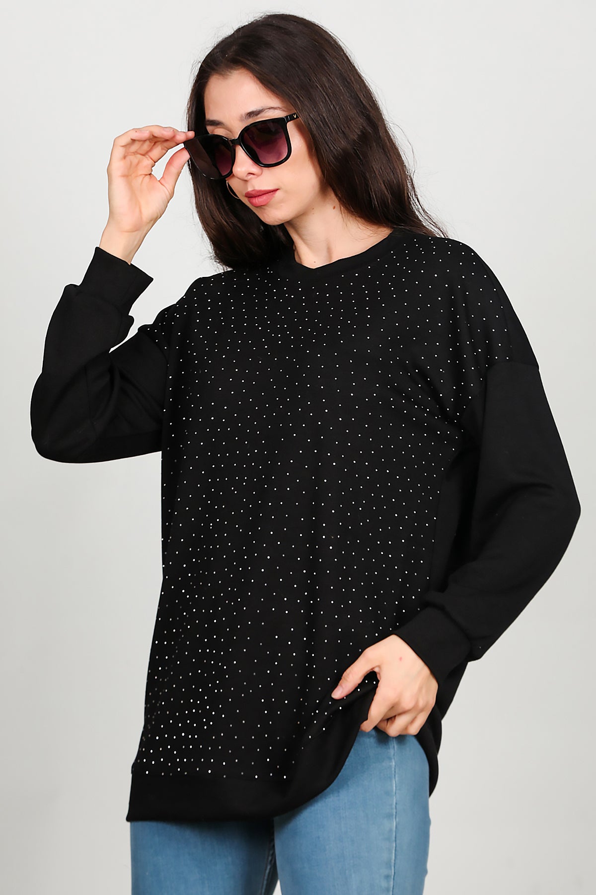 Kadın Taşlı Bisiklet Yaka Sweat Siyah