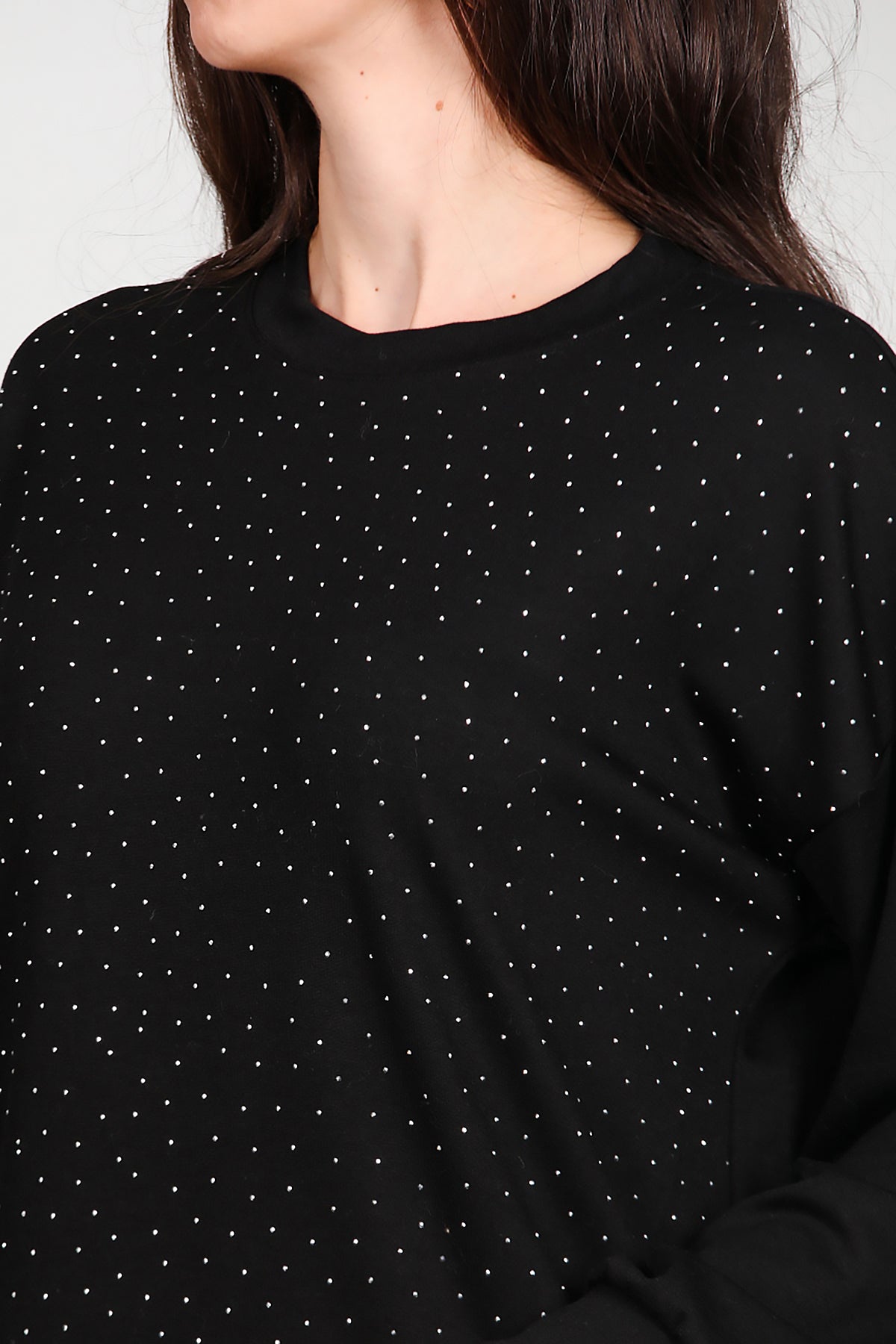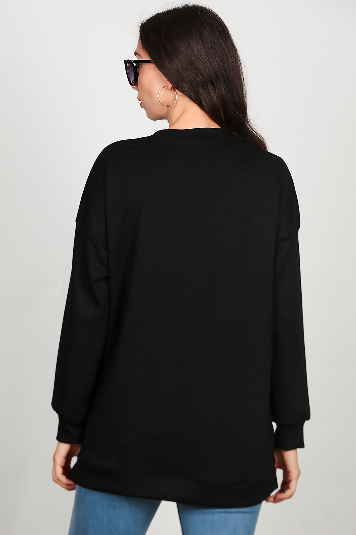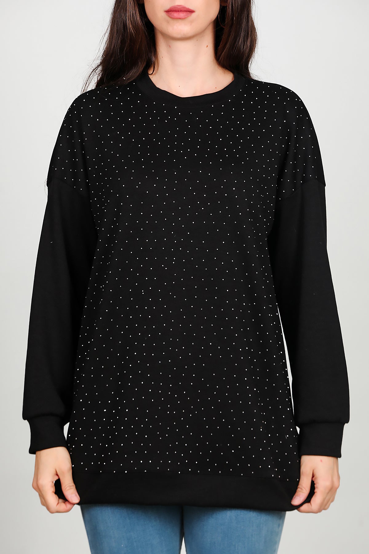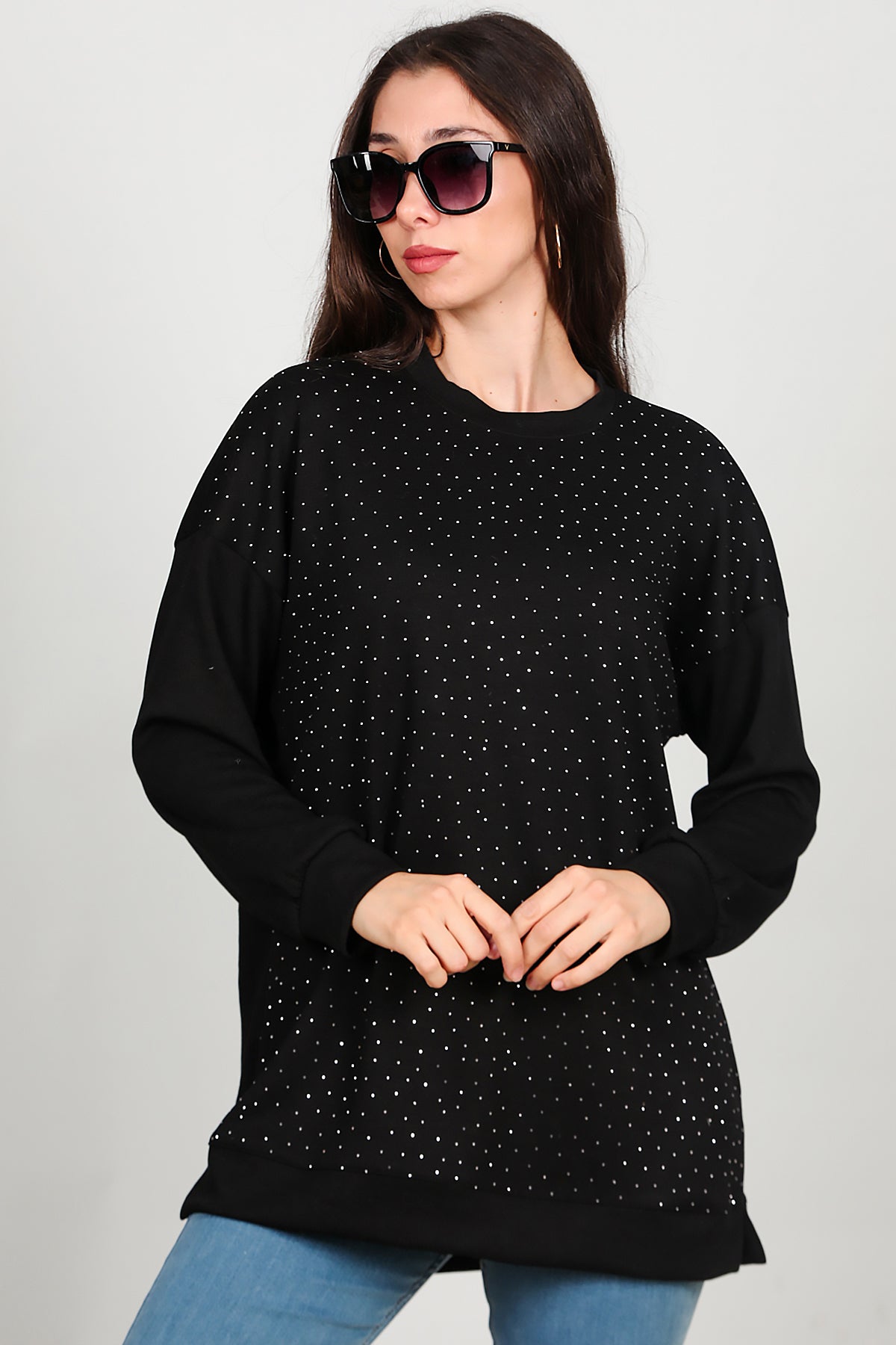 Kadın Taşlı Bisiklet Yaka Sweat Siyah