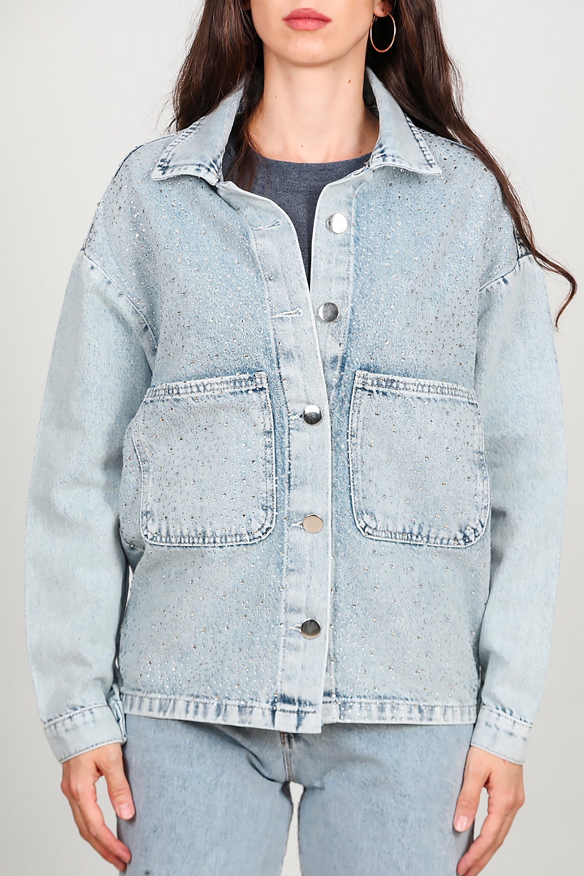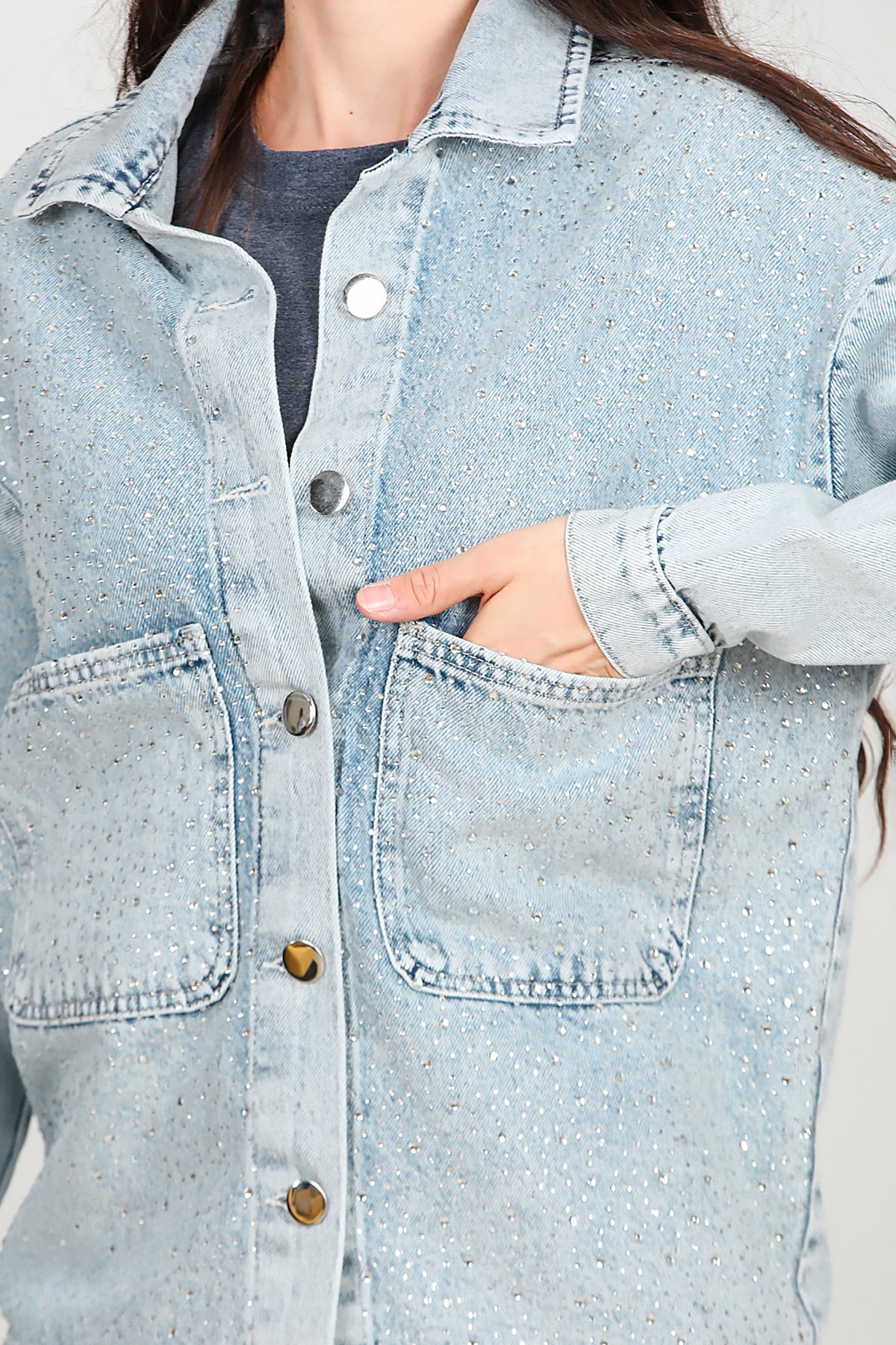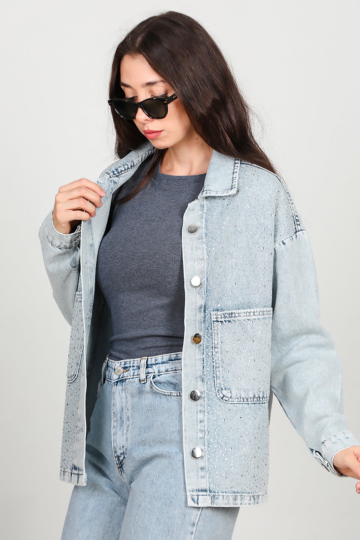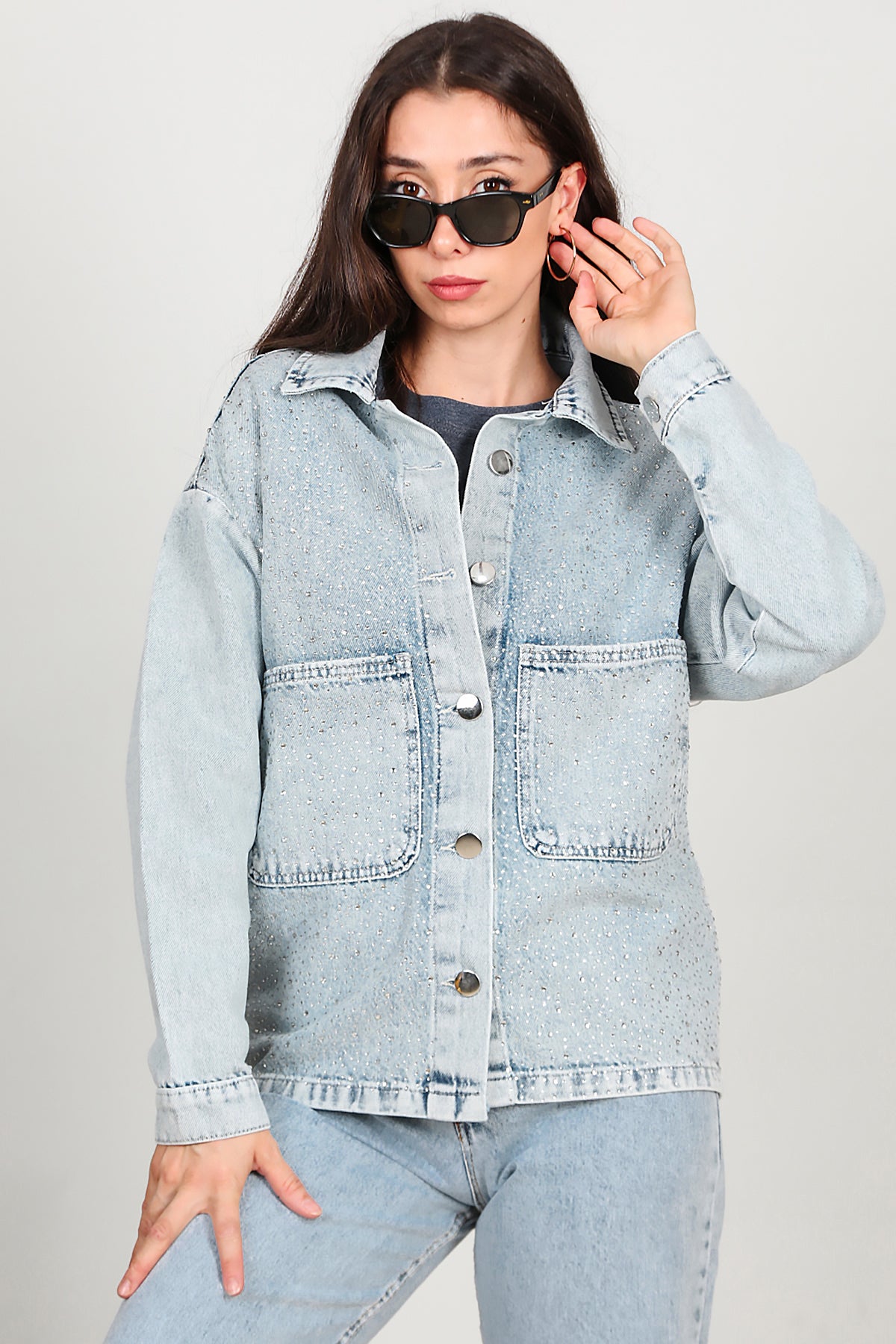 Kadın Taşlı Kar Yıkamalı Kot Ceket Mavi