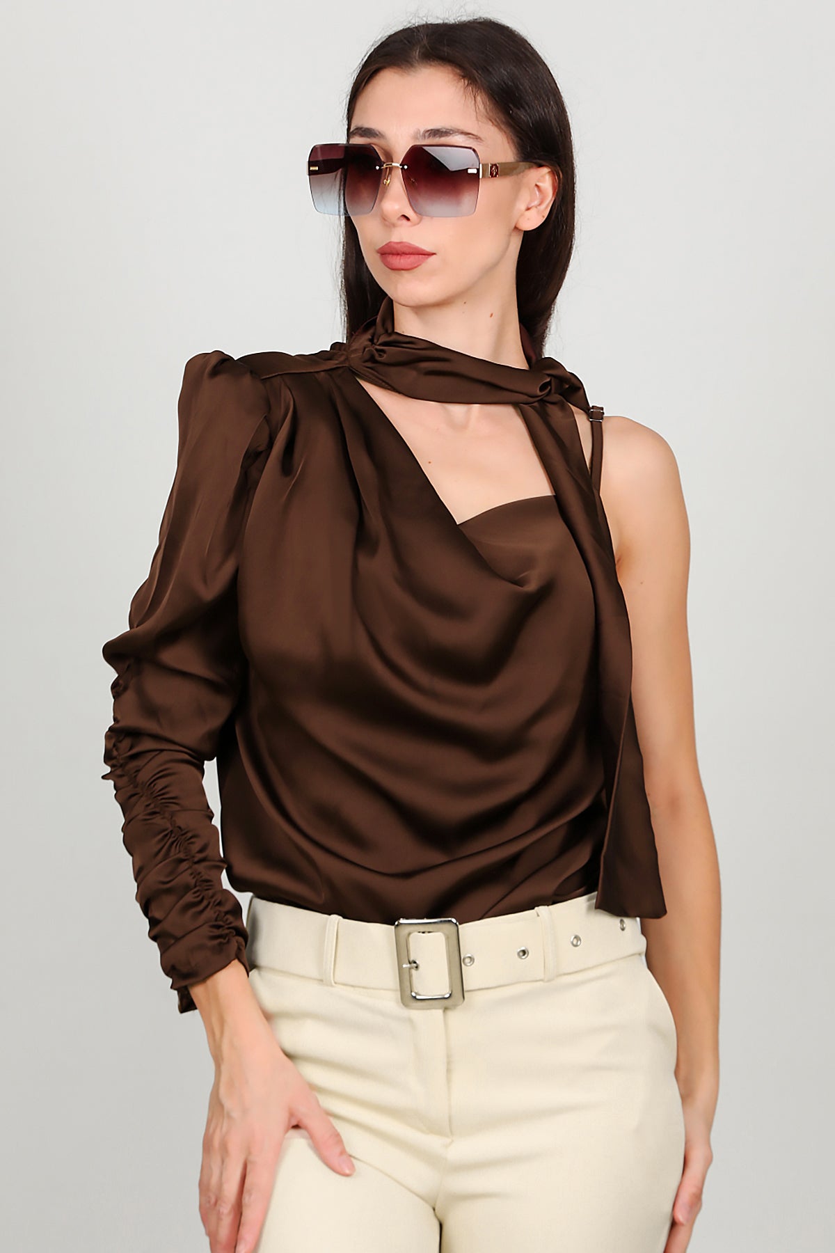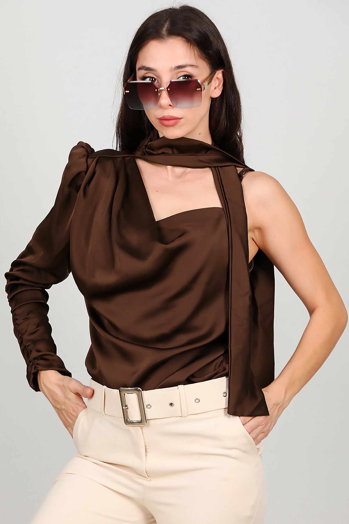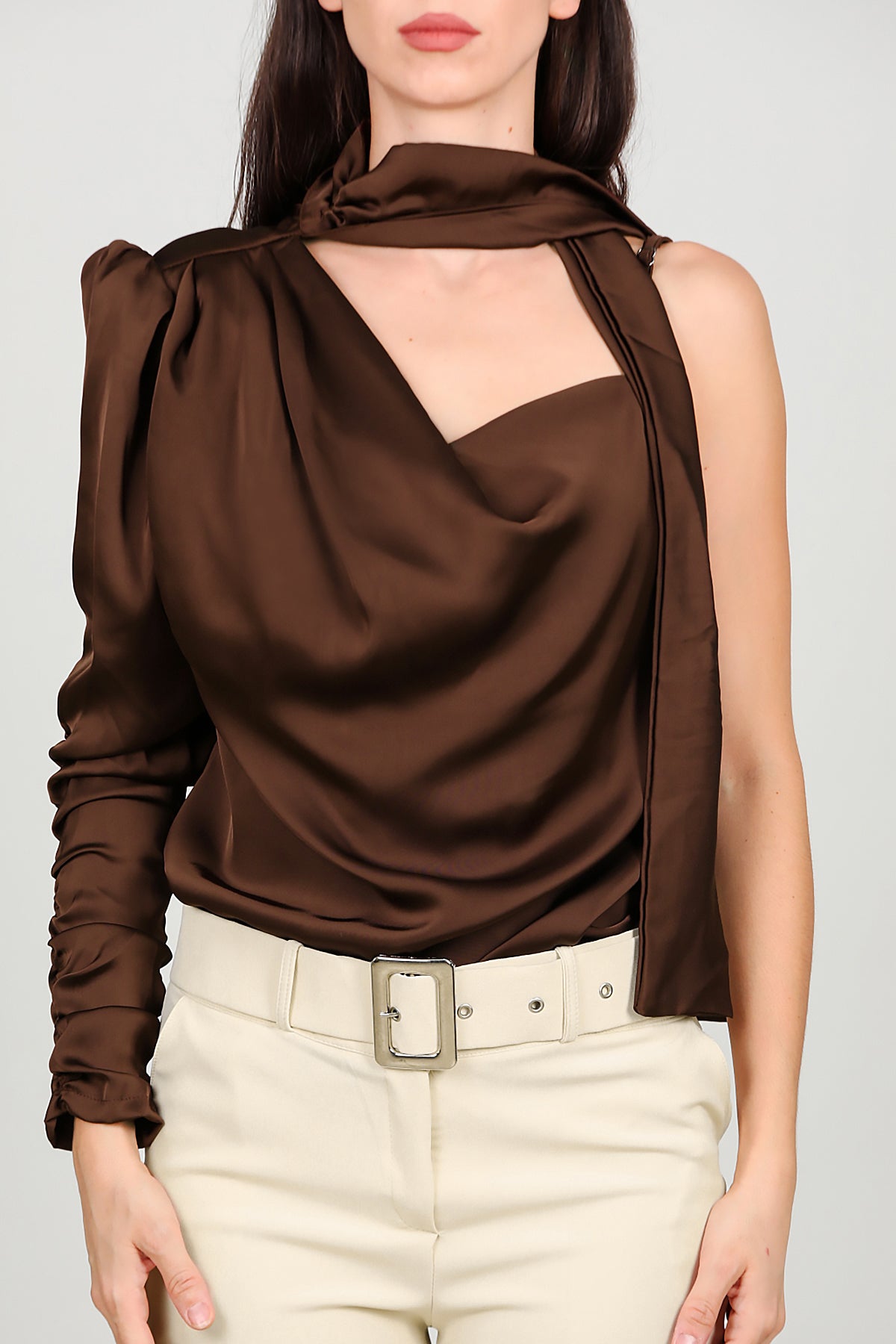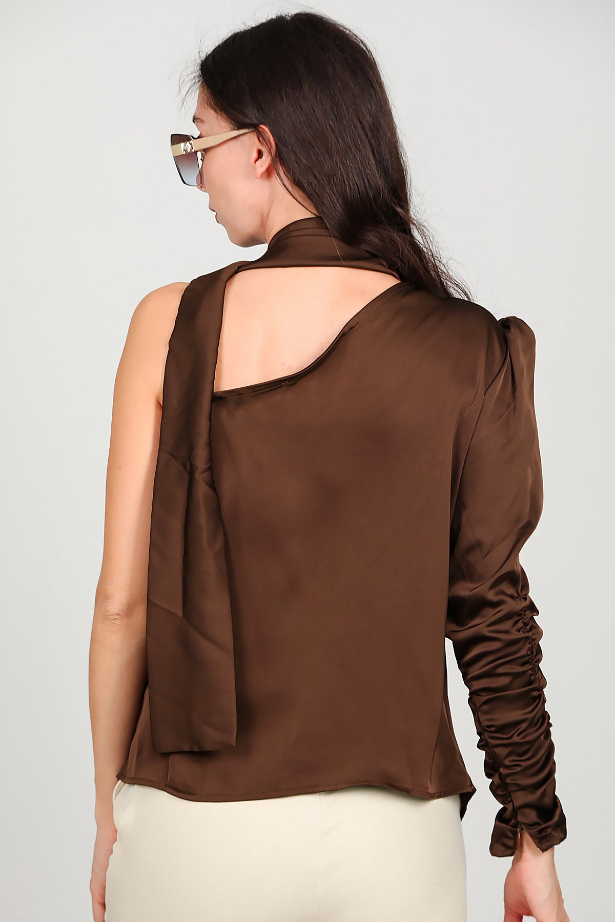 Kadın Tek Omuz Saten Bluz Kahverengi