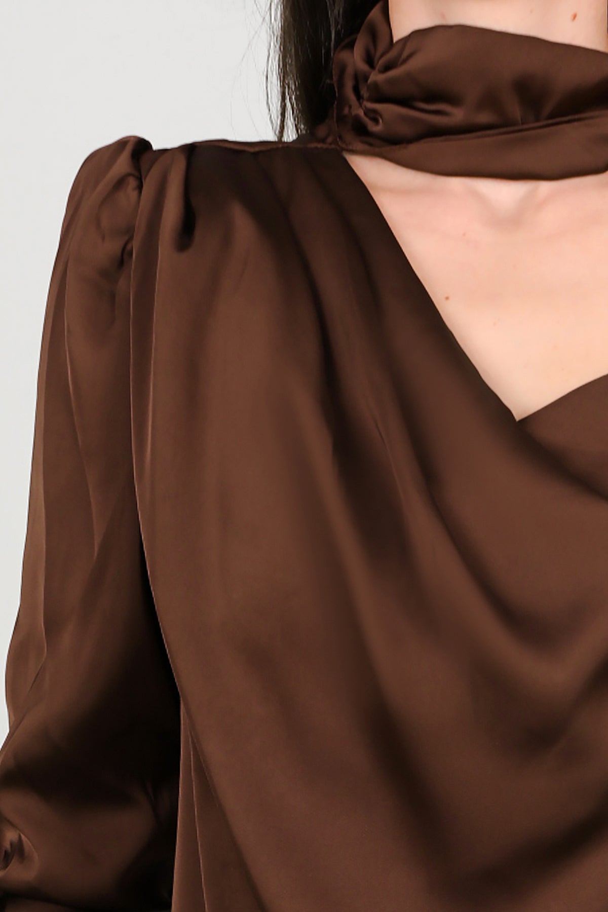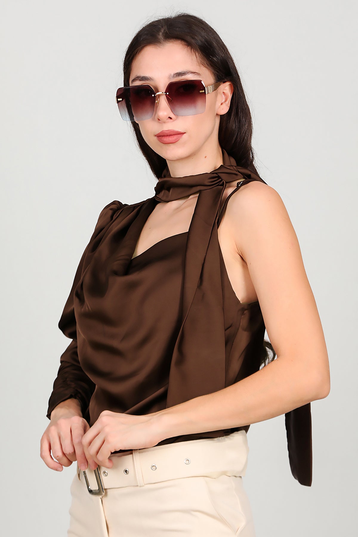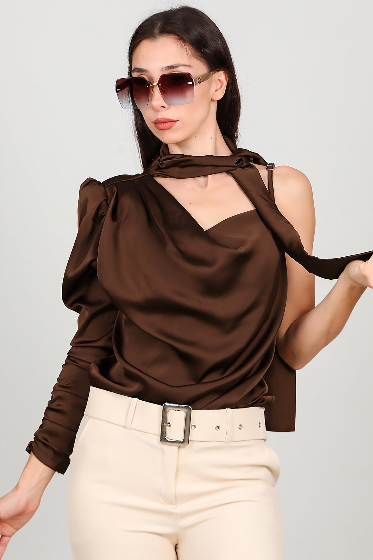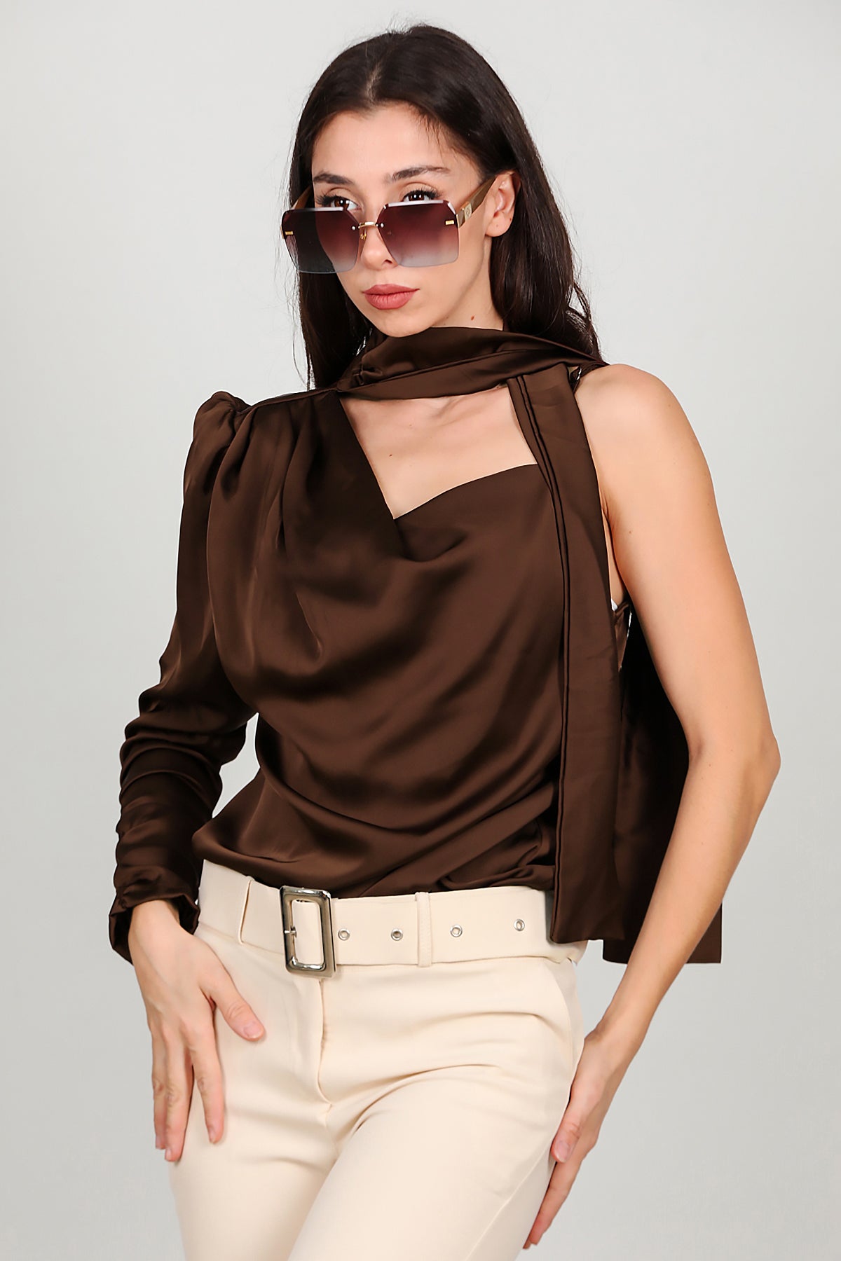 Kadın Tek Omuz Saten Bluz Kahverengi