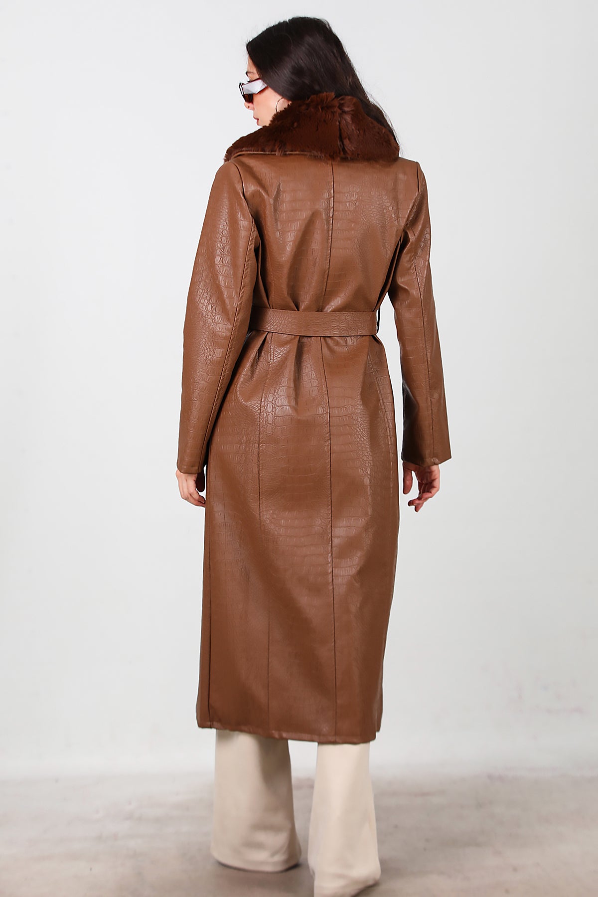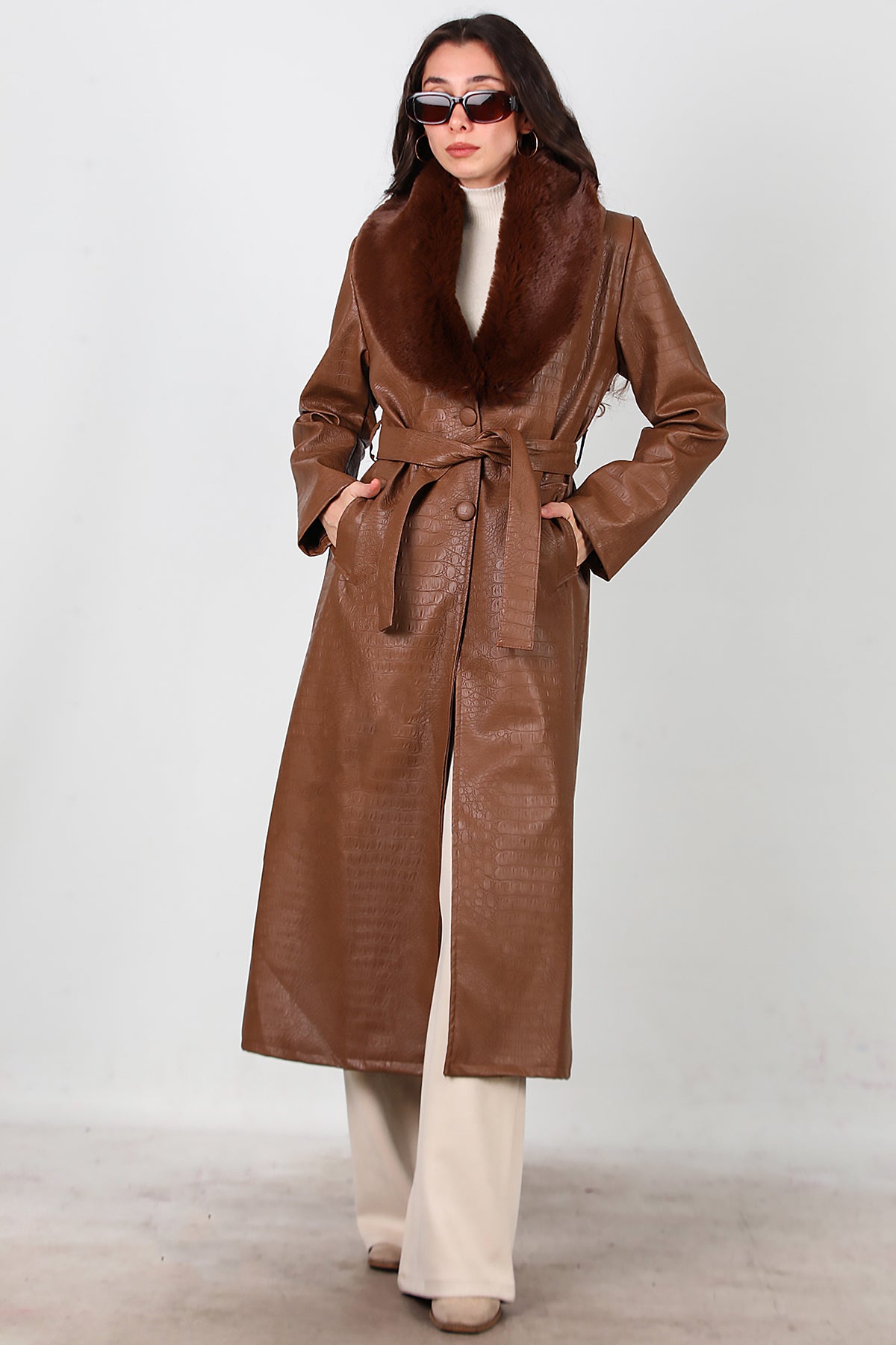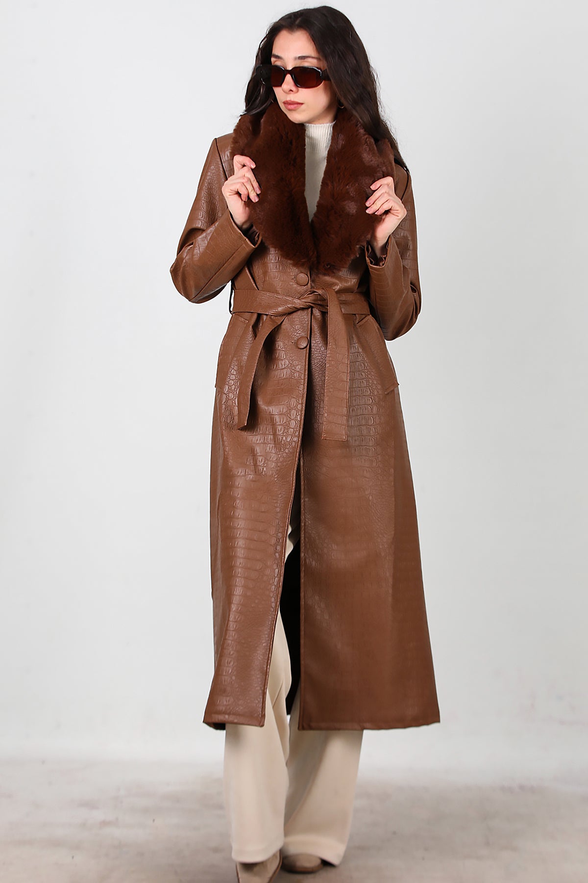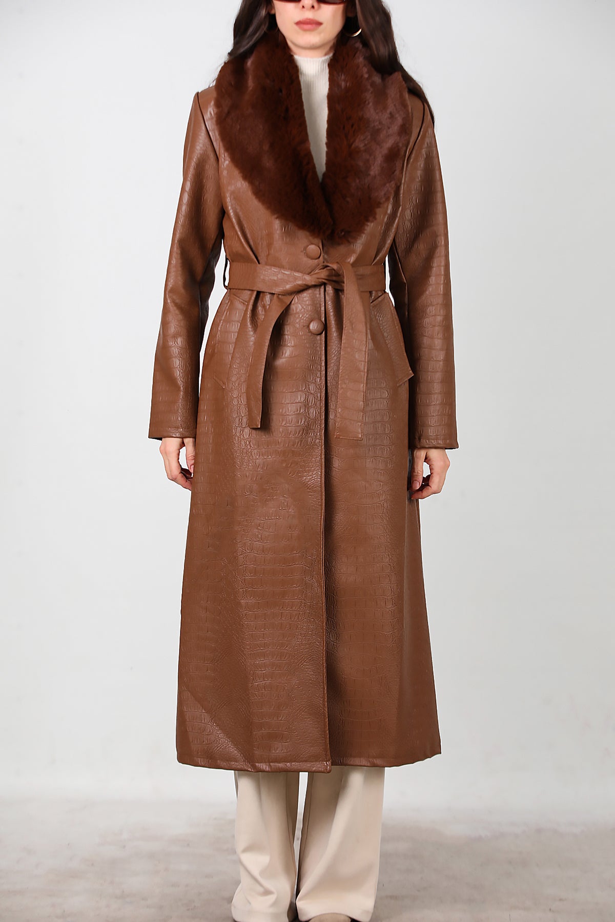 Kadın Timsah Desen Yakası Kürklü Uzun Deri Kaban Kahverengi