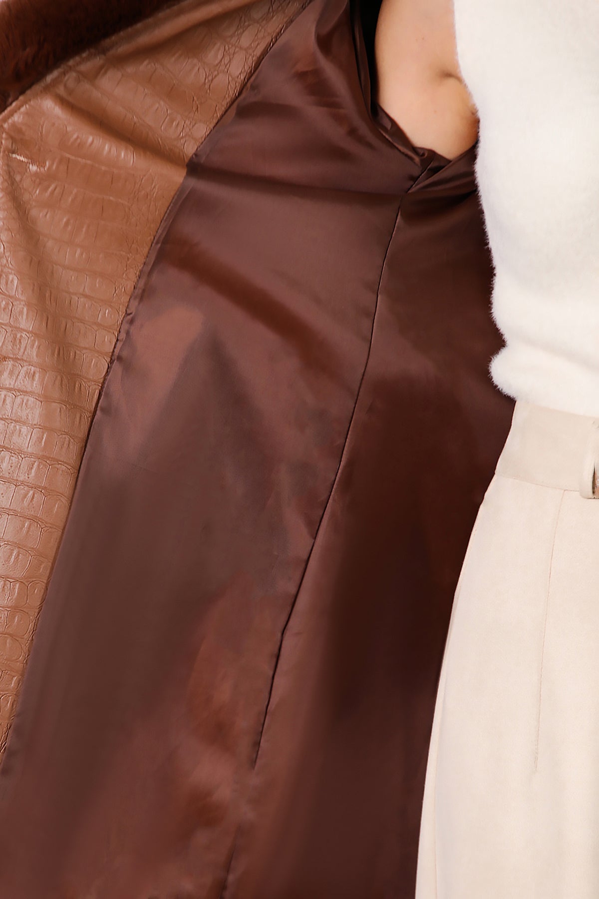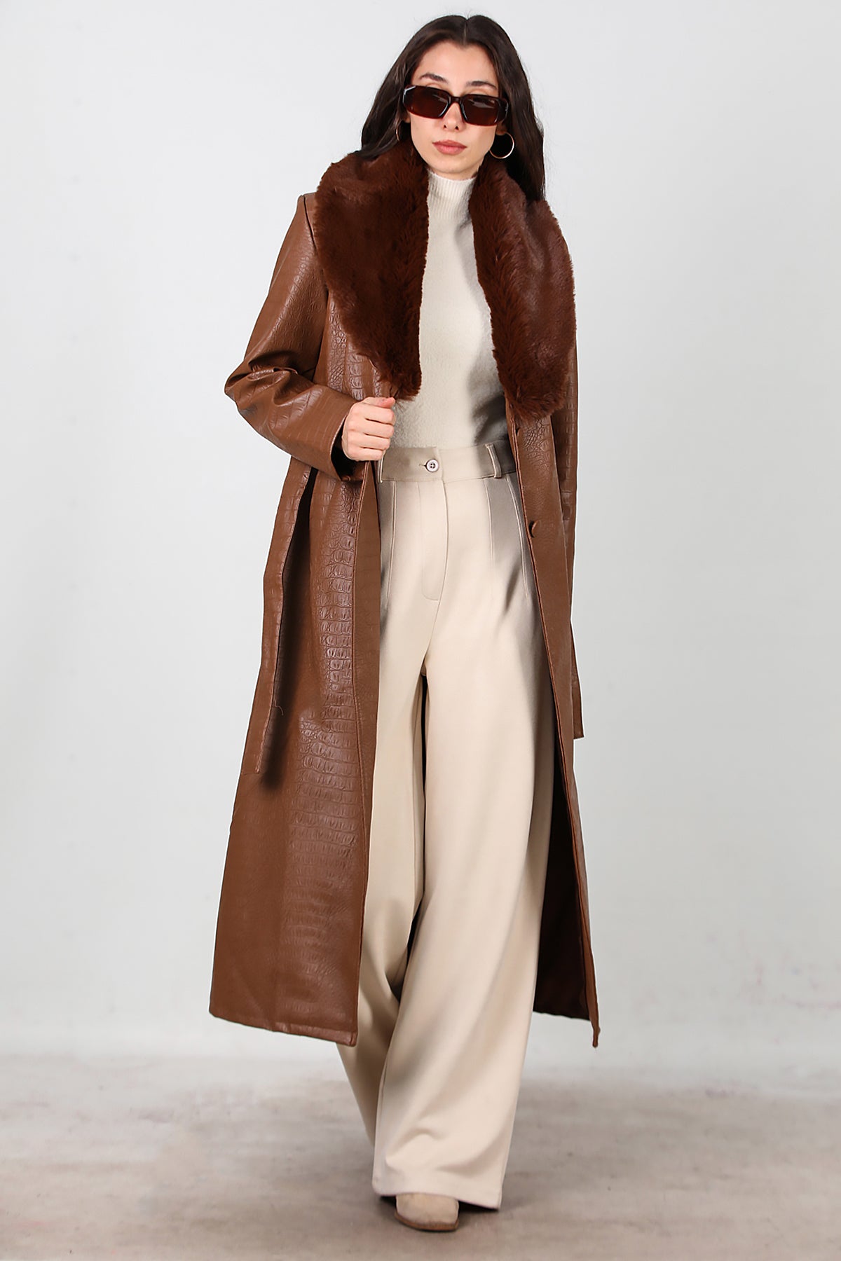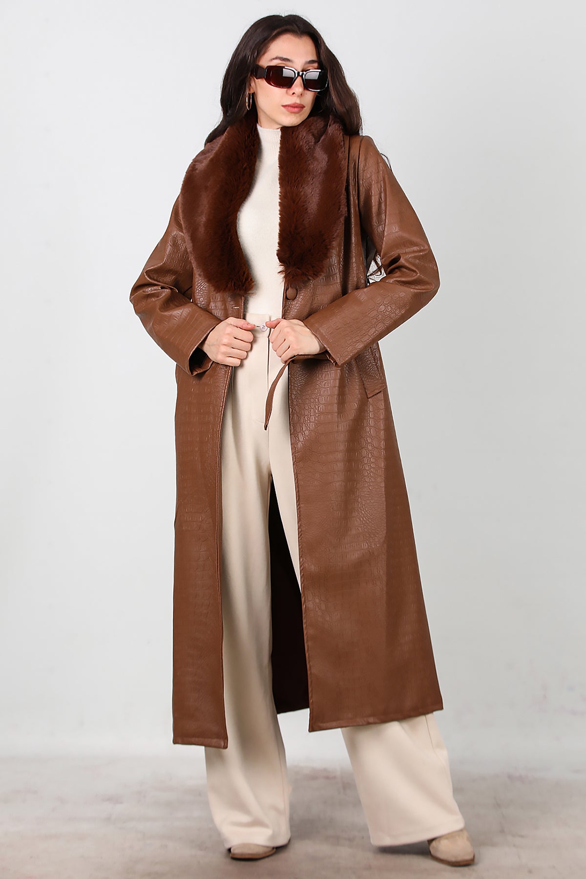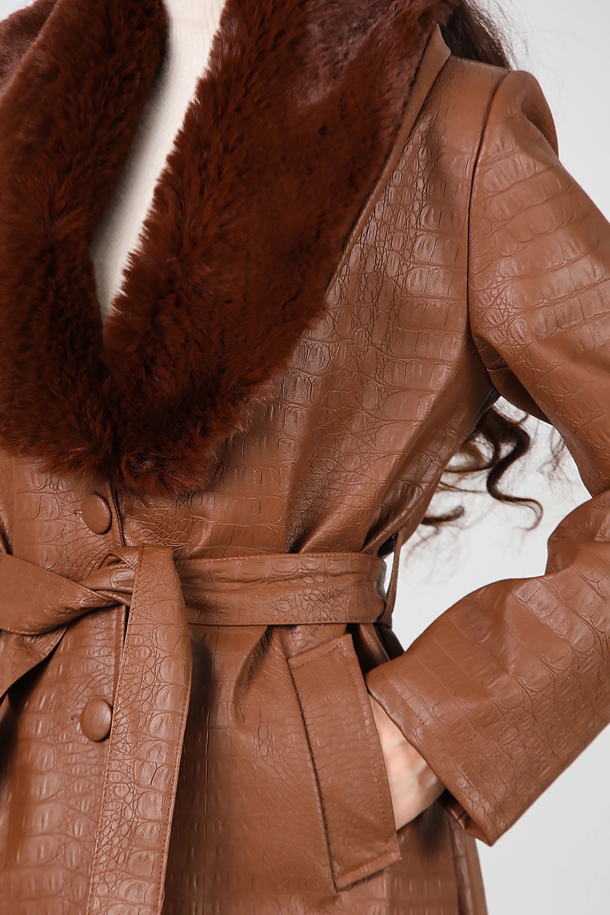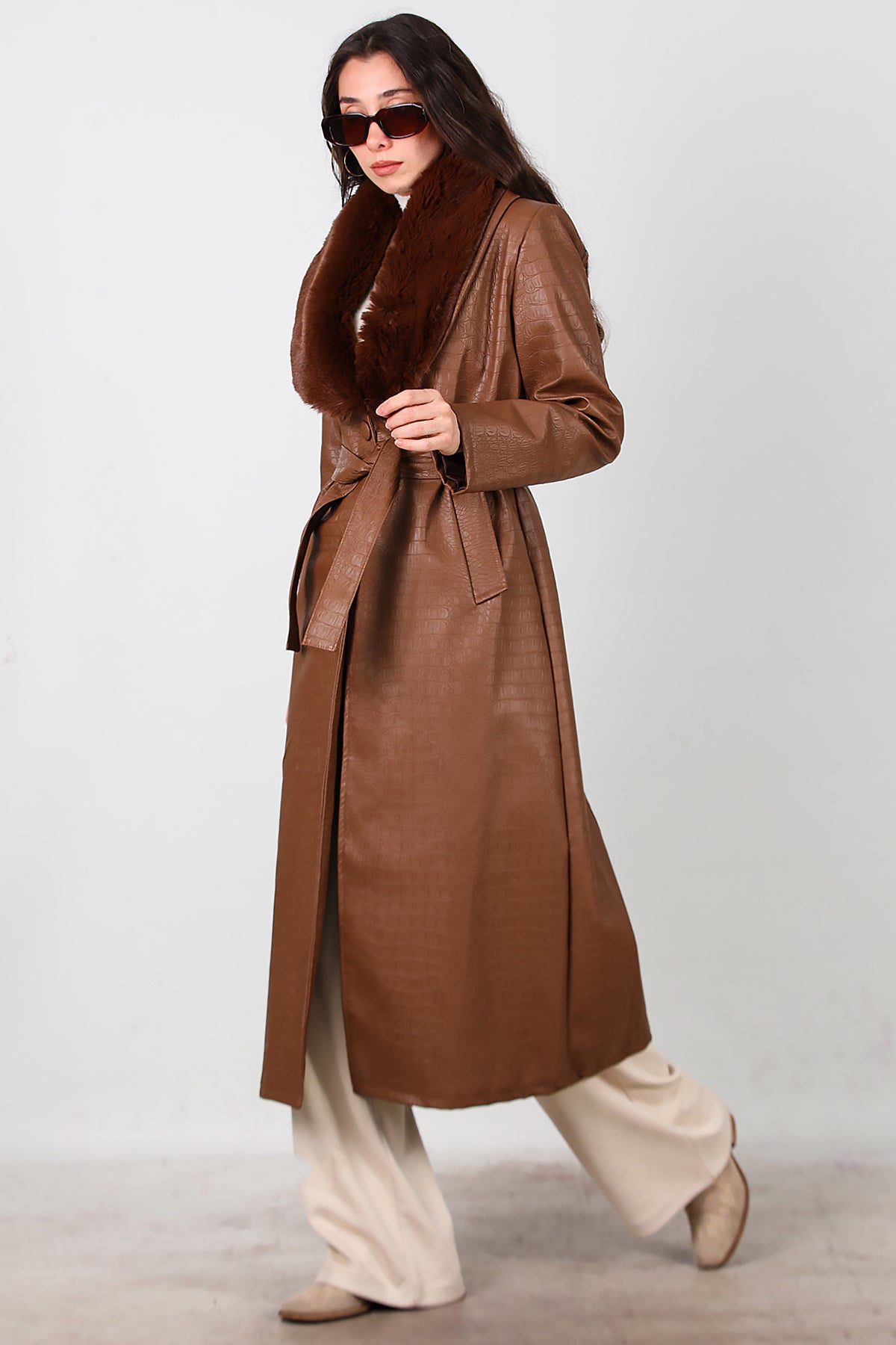 Kadın Timsah Desen Yakası Kürklü Uzun Deri Kaban Kahverengi