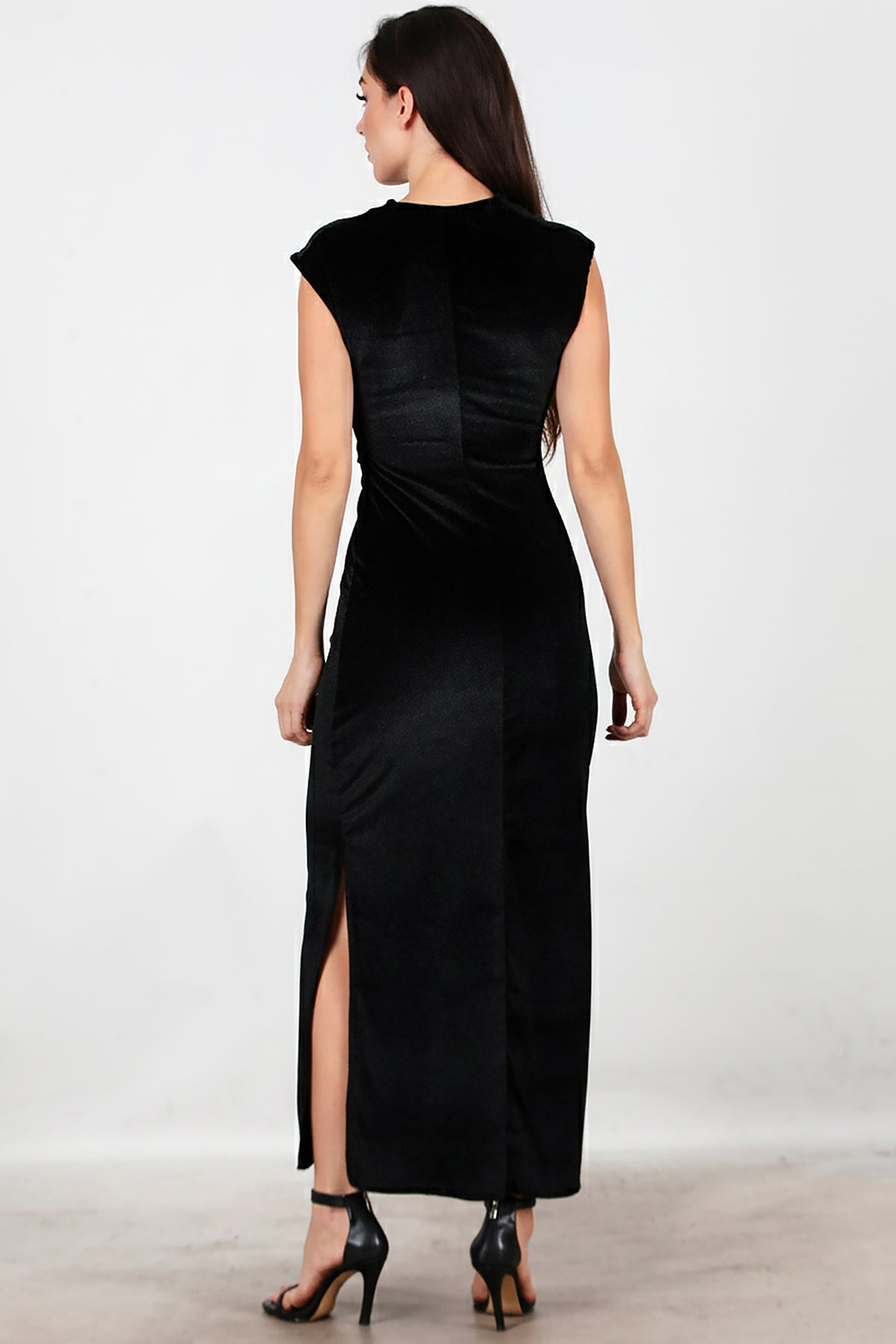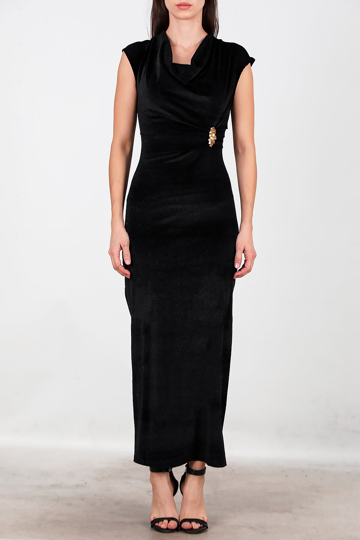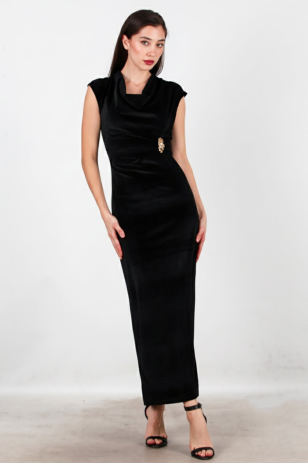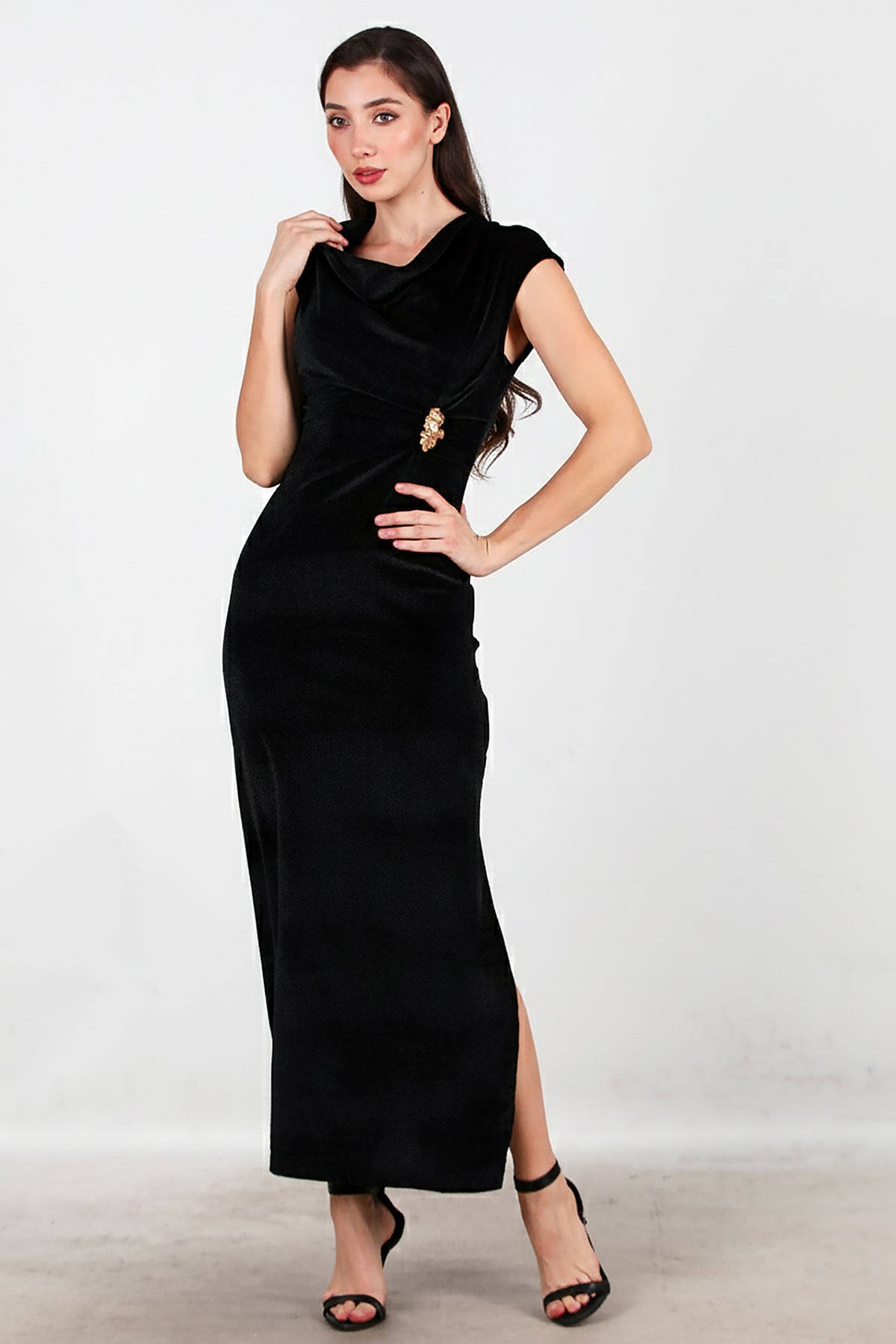 Kadın Toka Detaylı Uzun Kadife Elbise Siyah