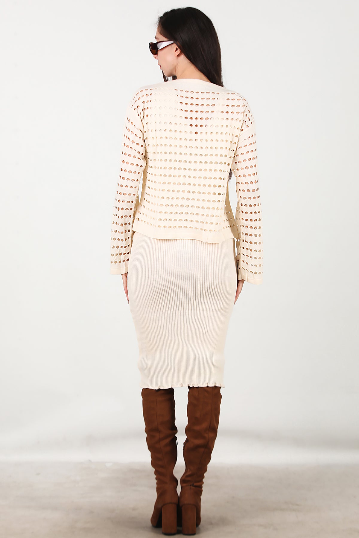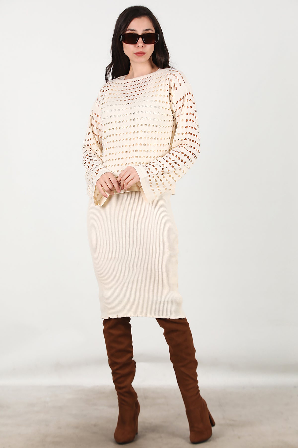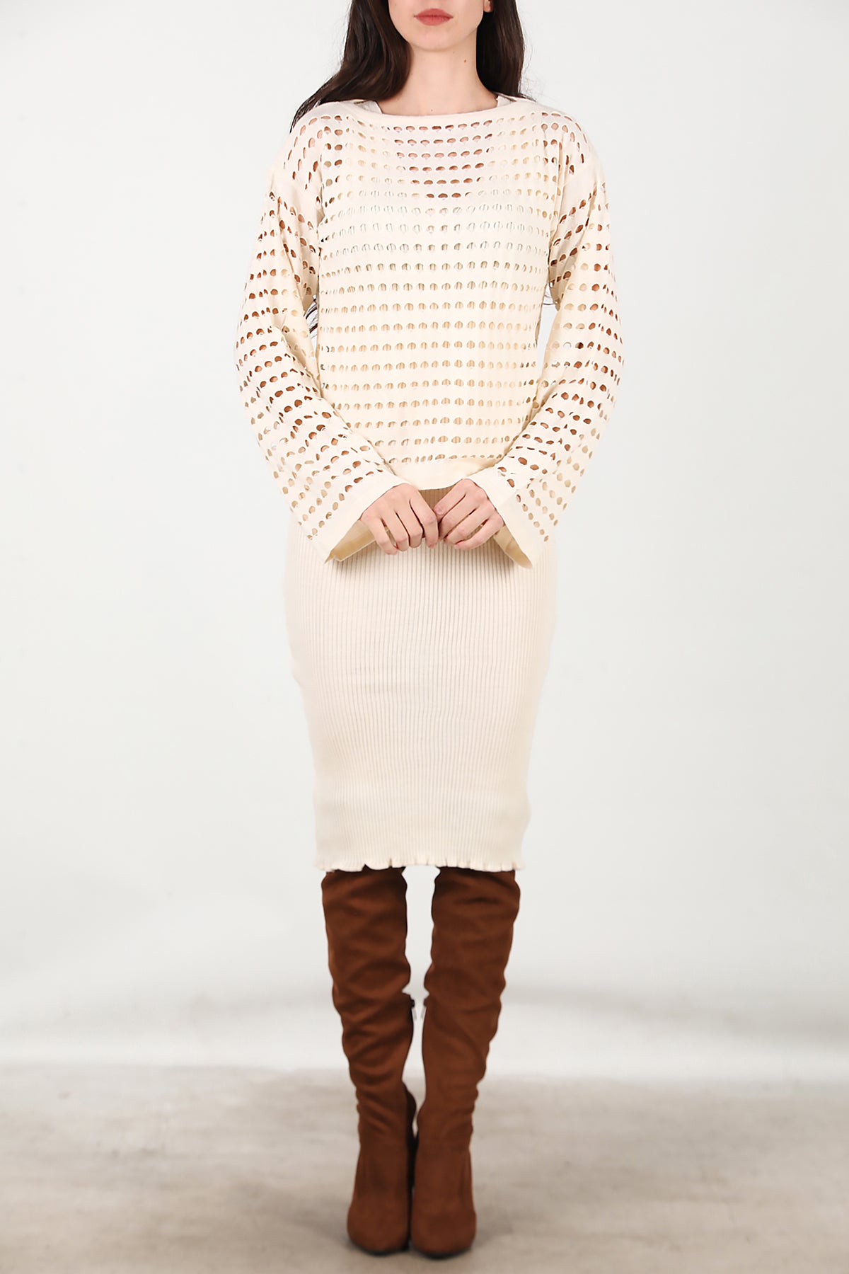 Kadın Triko Elbise İkili Takım Krem