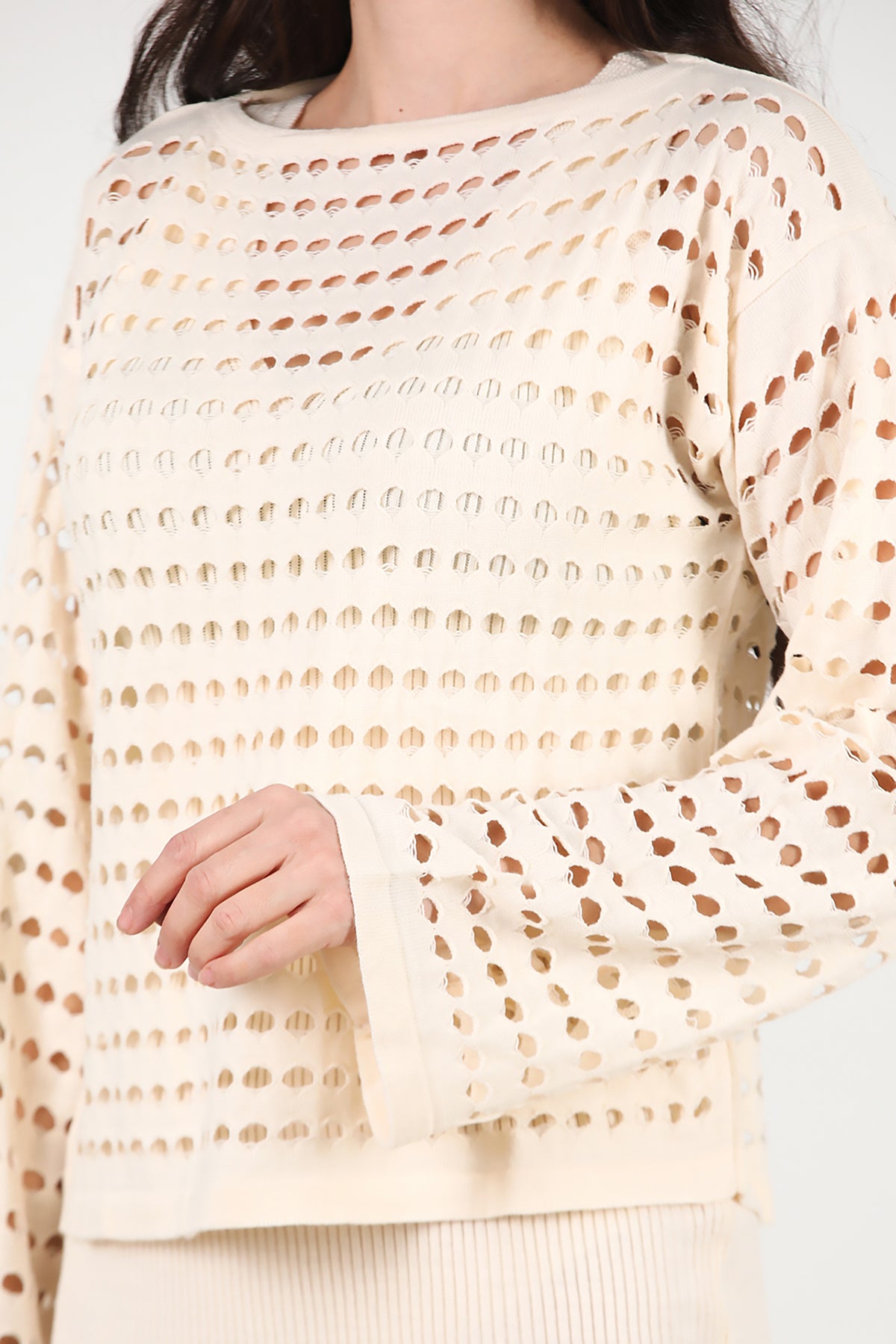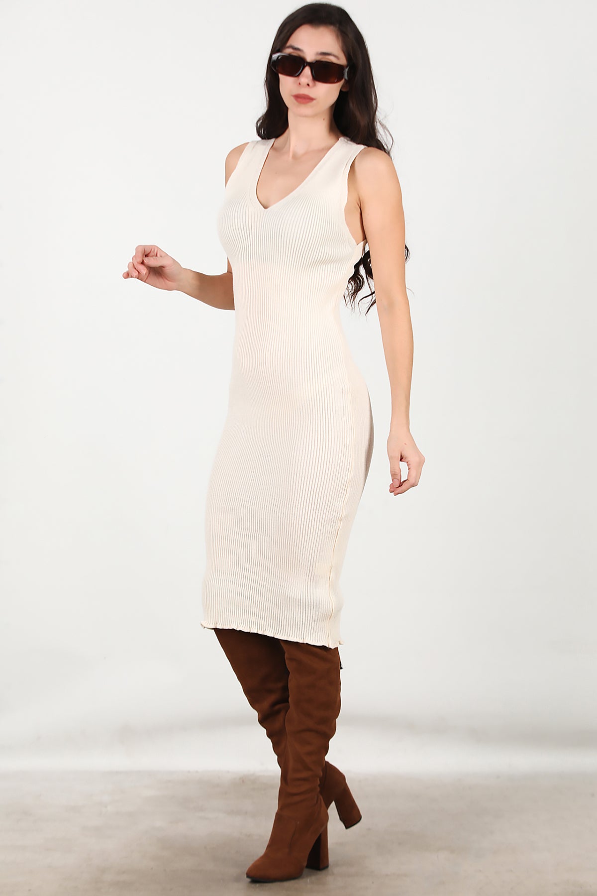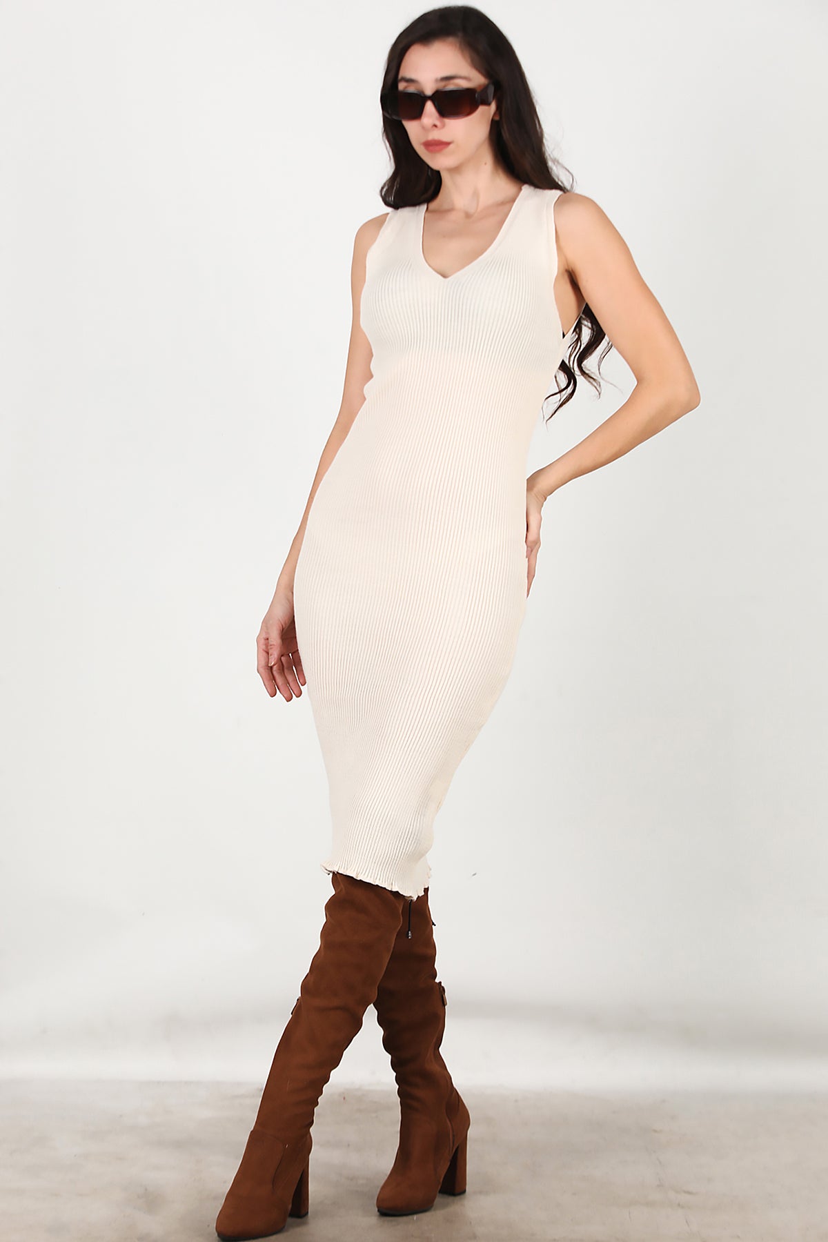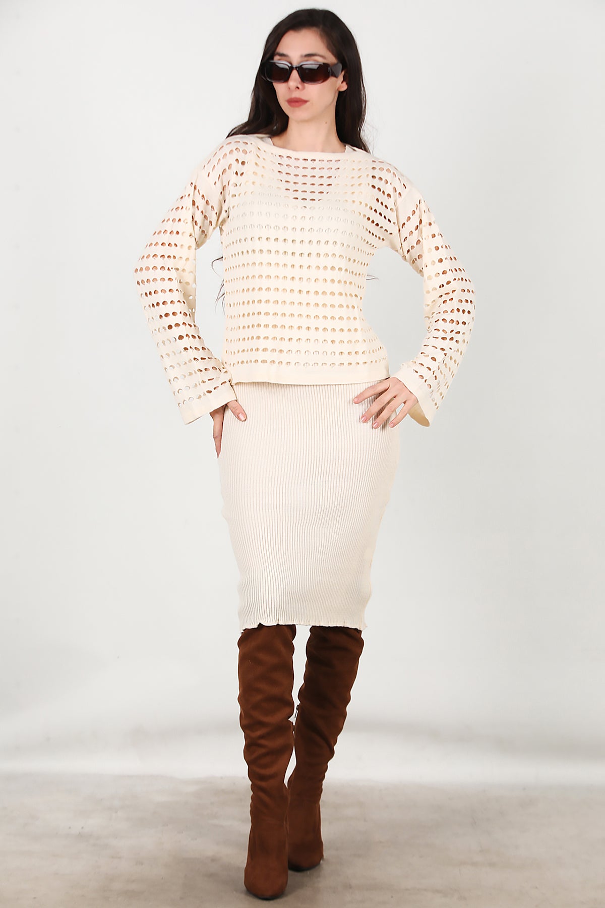 Kadın Triko Elbise İkili Takım Krem