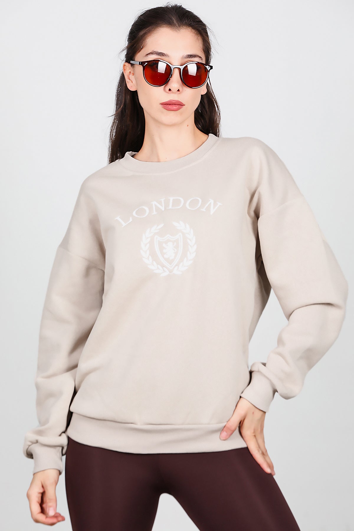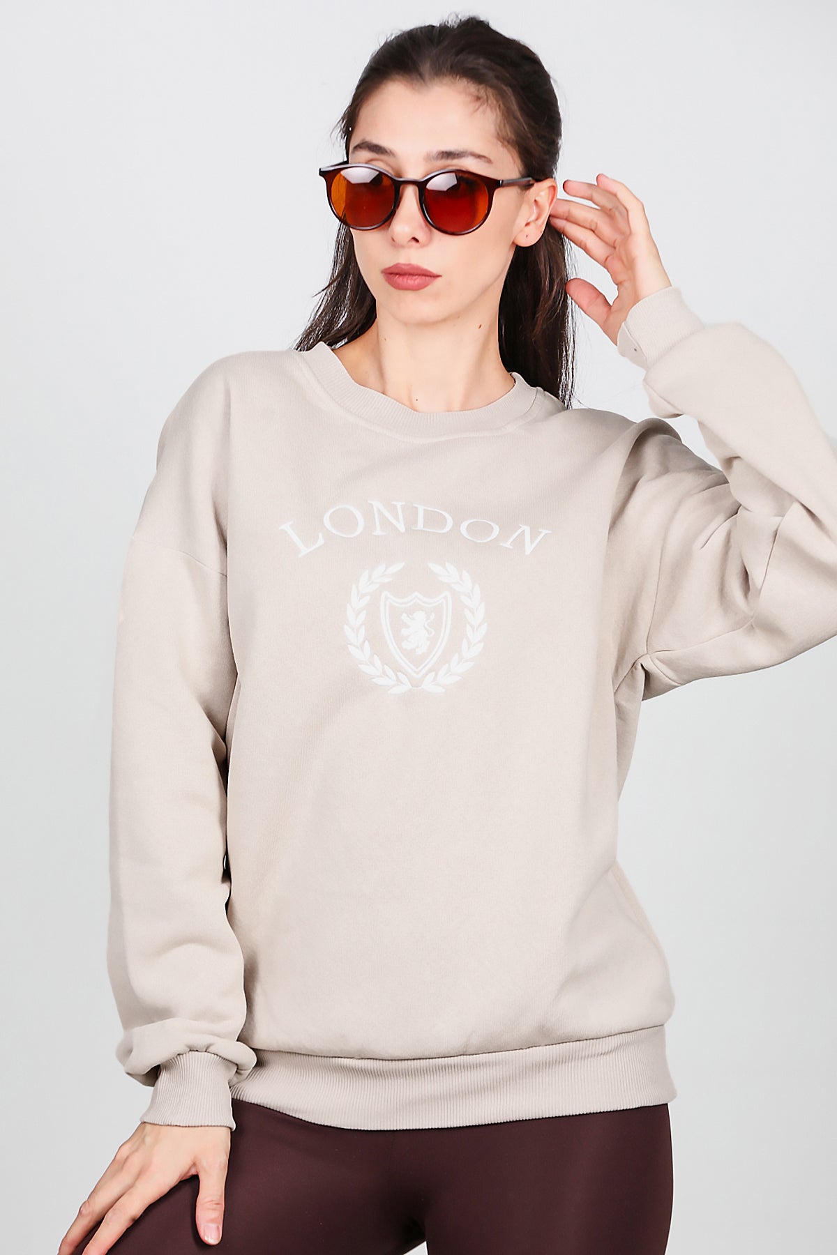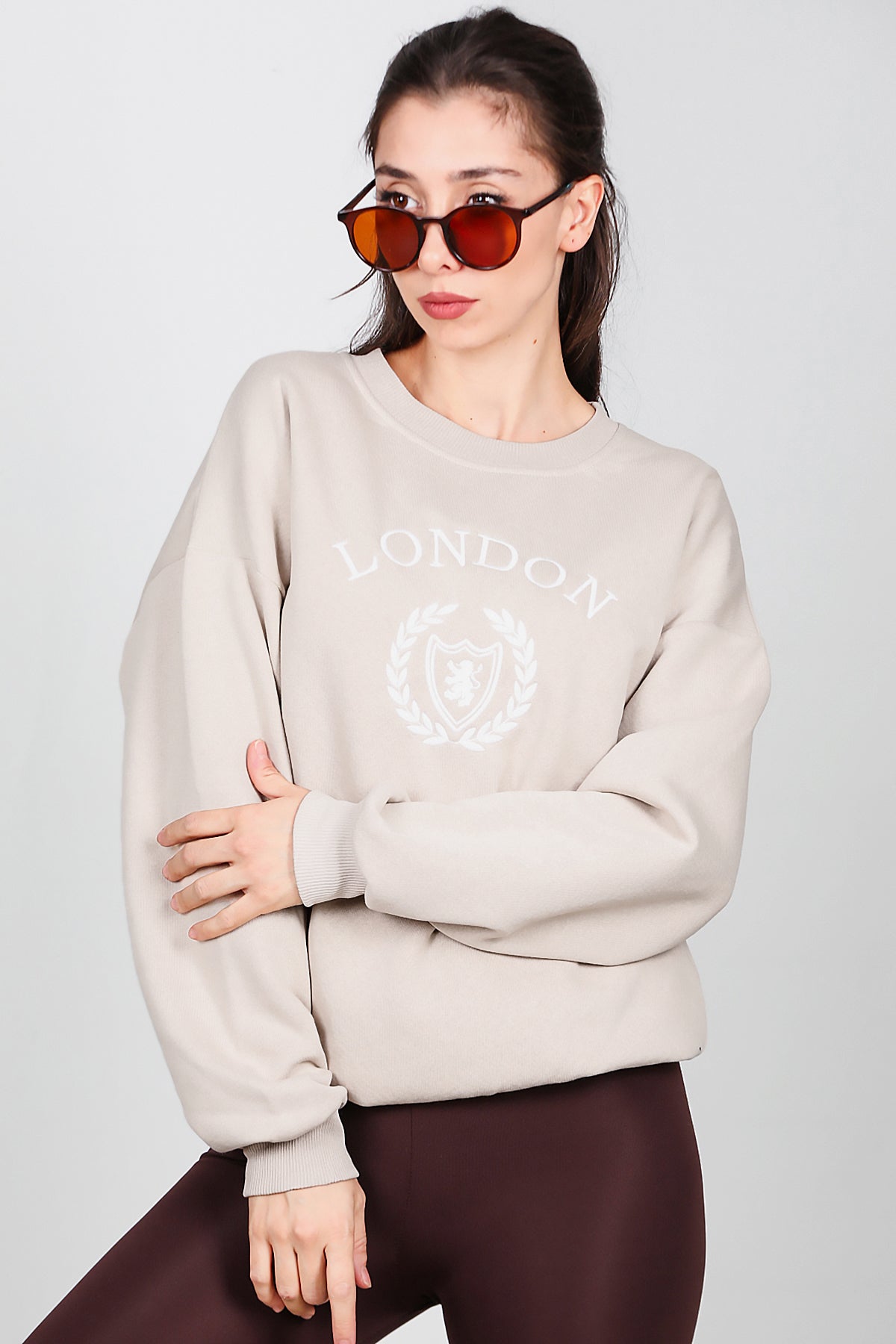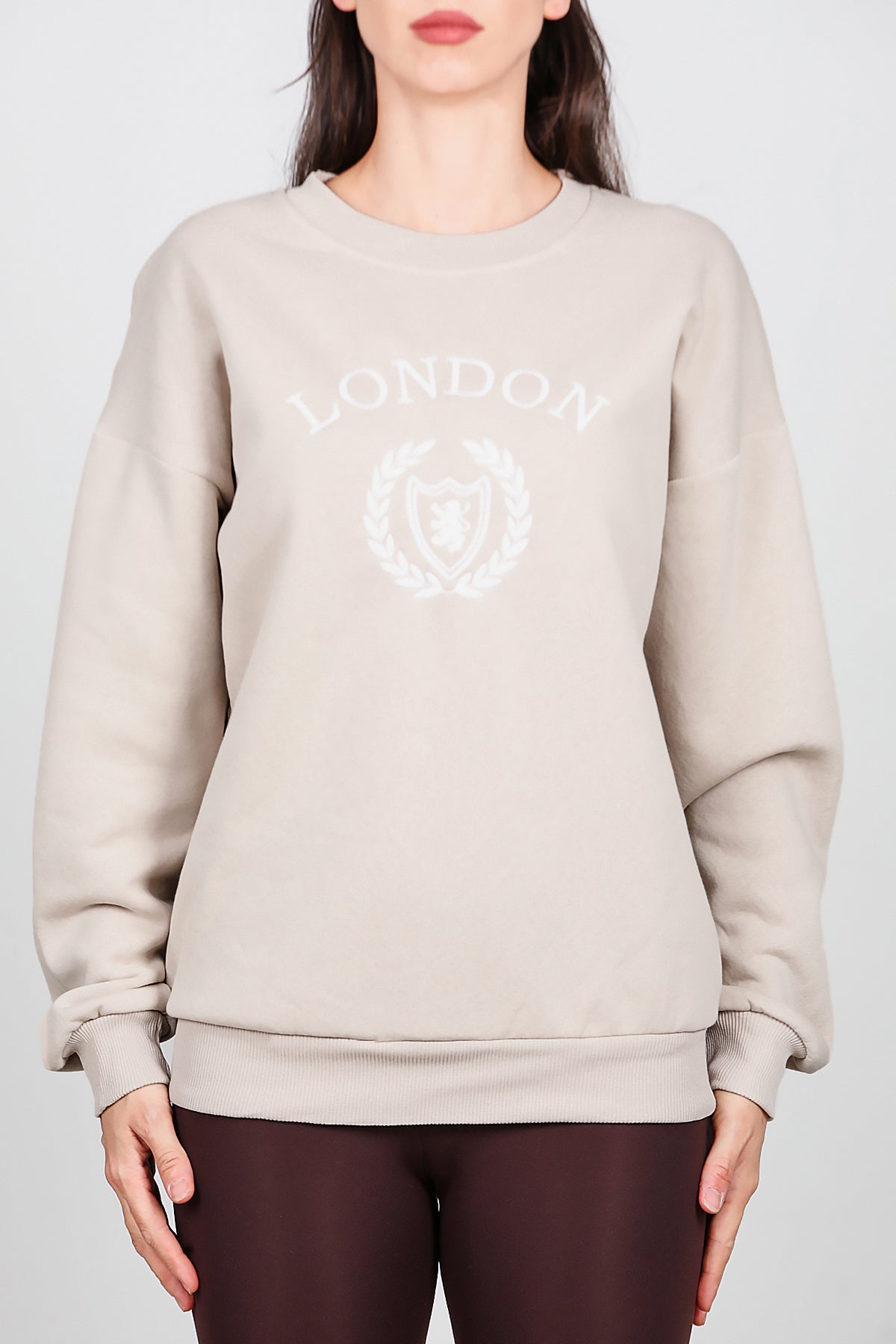 Kadın Üç İplik Bisiklet Yaka Sweat Bej