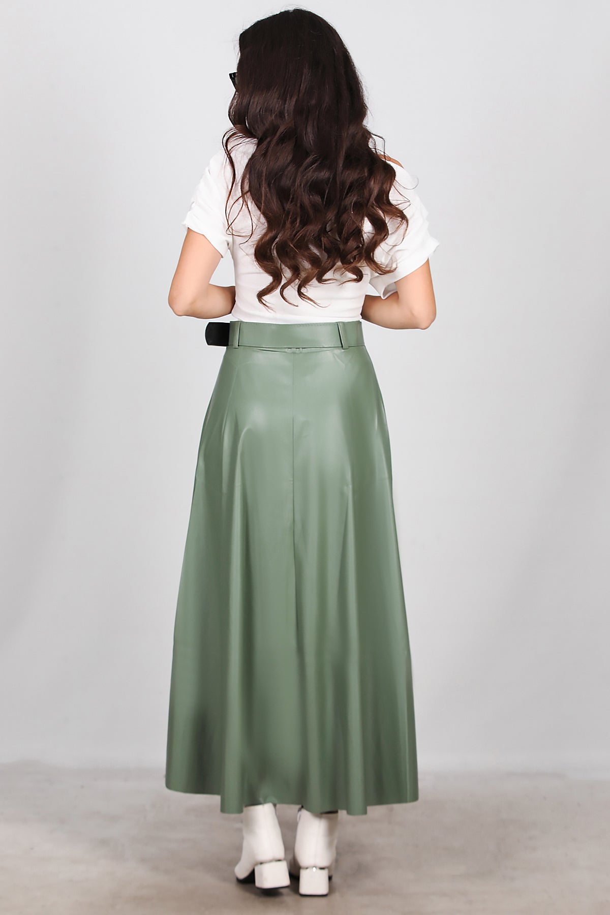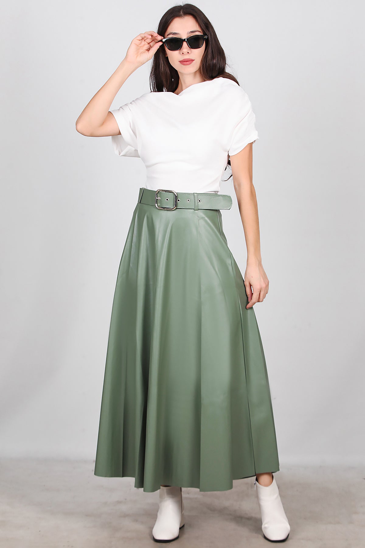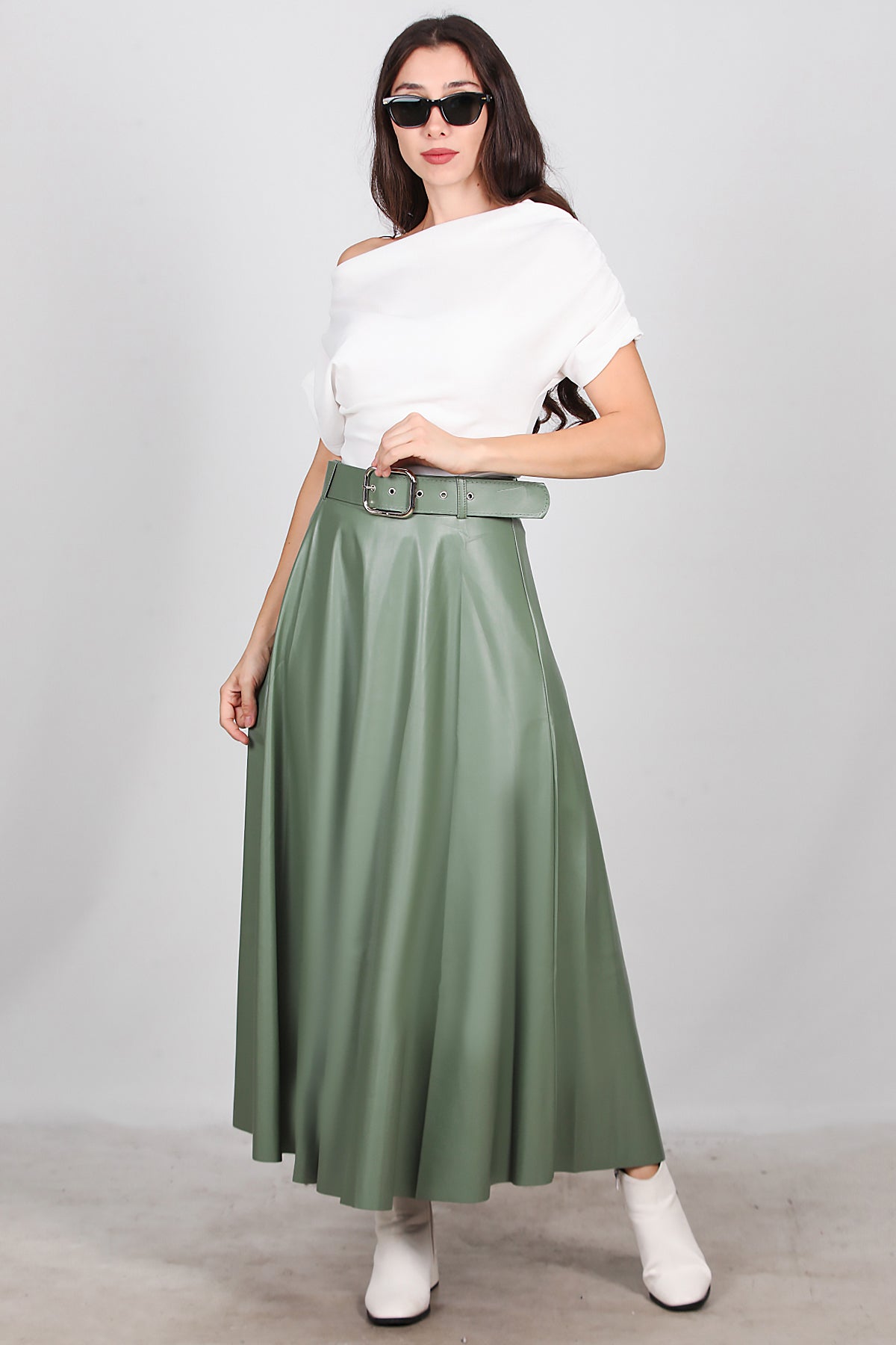 Kadın Uzun Kemerli Deri Etek Yeşil