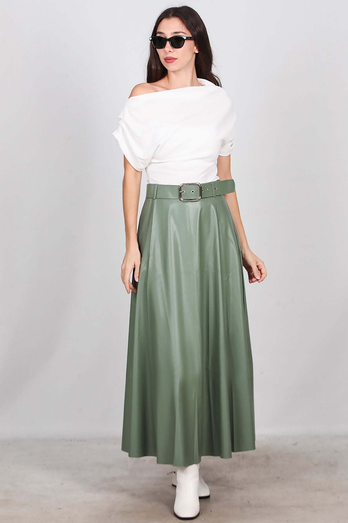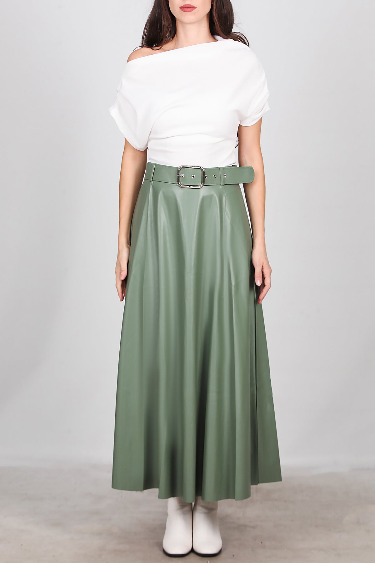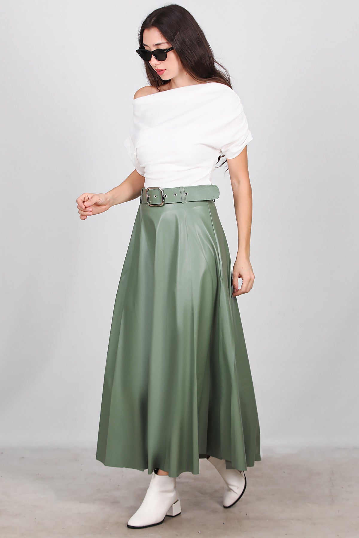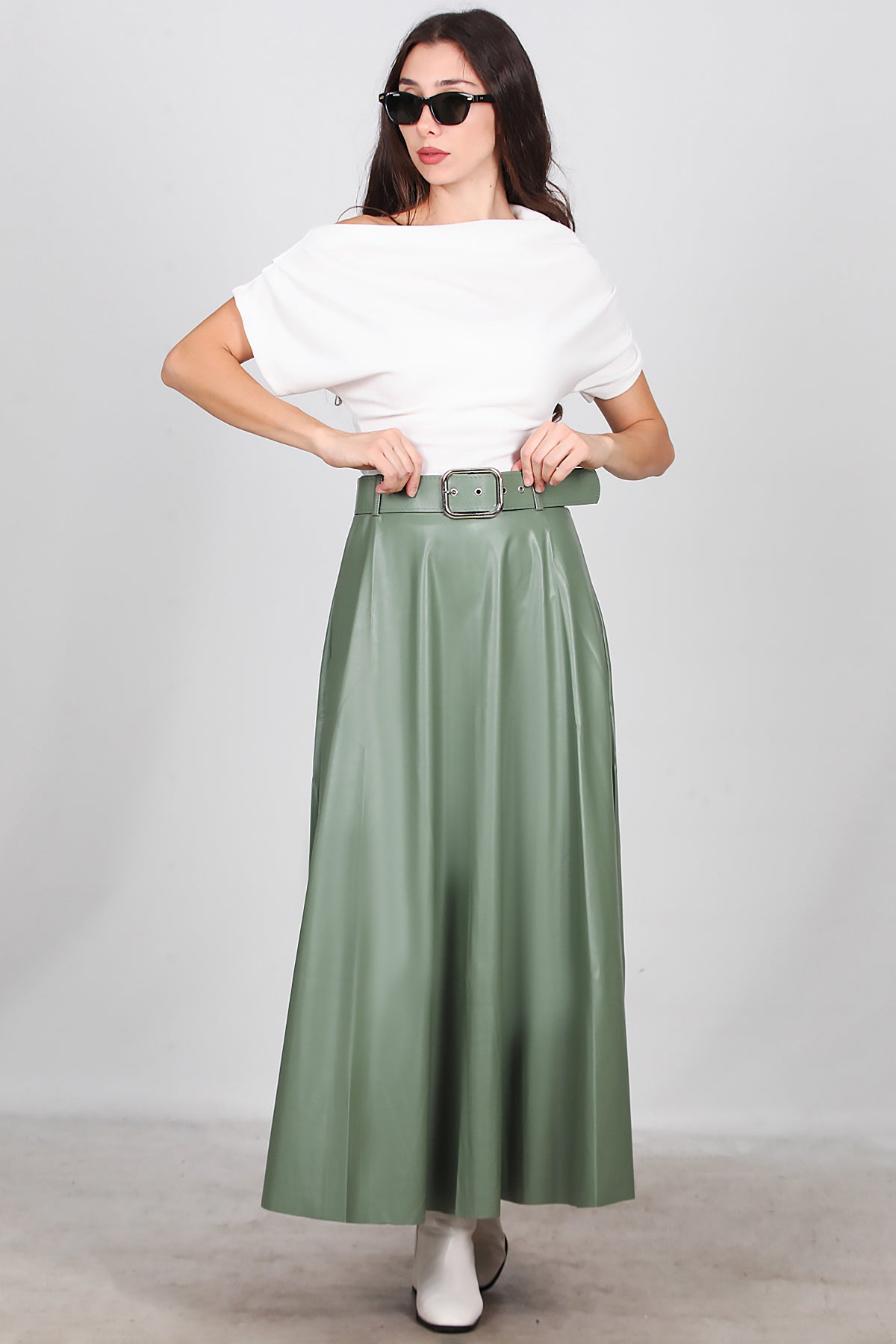 Kadın Uzun Kemerli Deri Etek Yeşil
