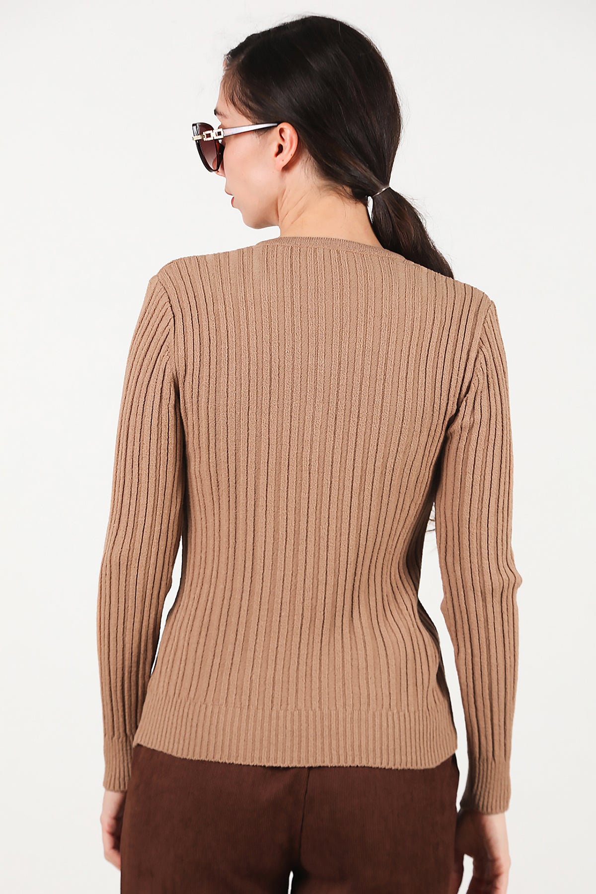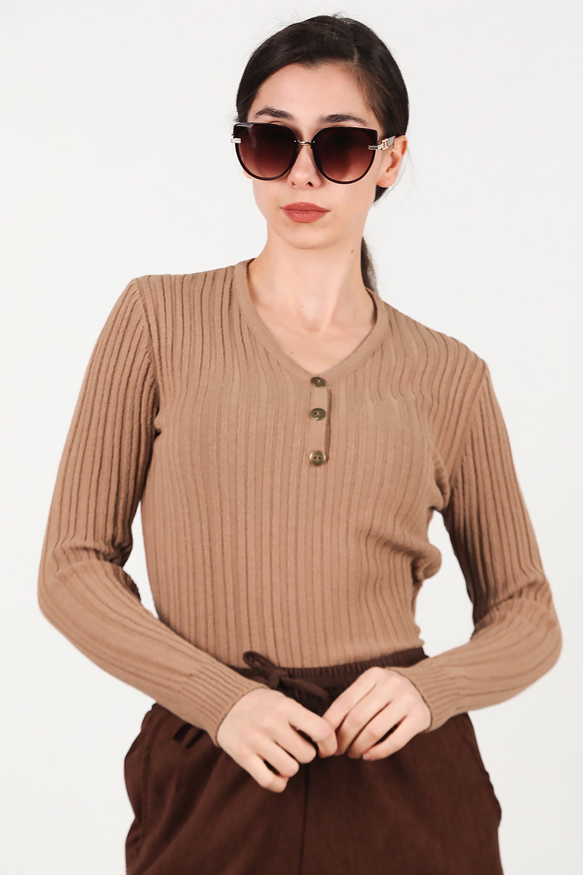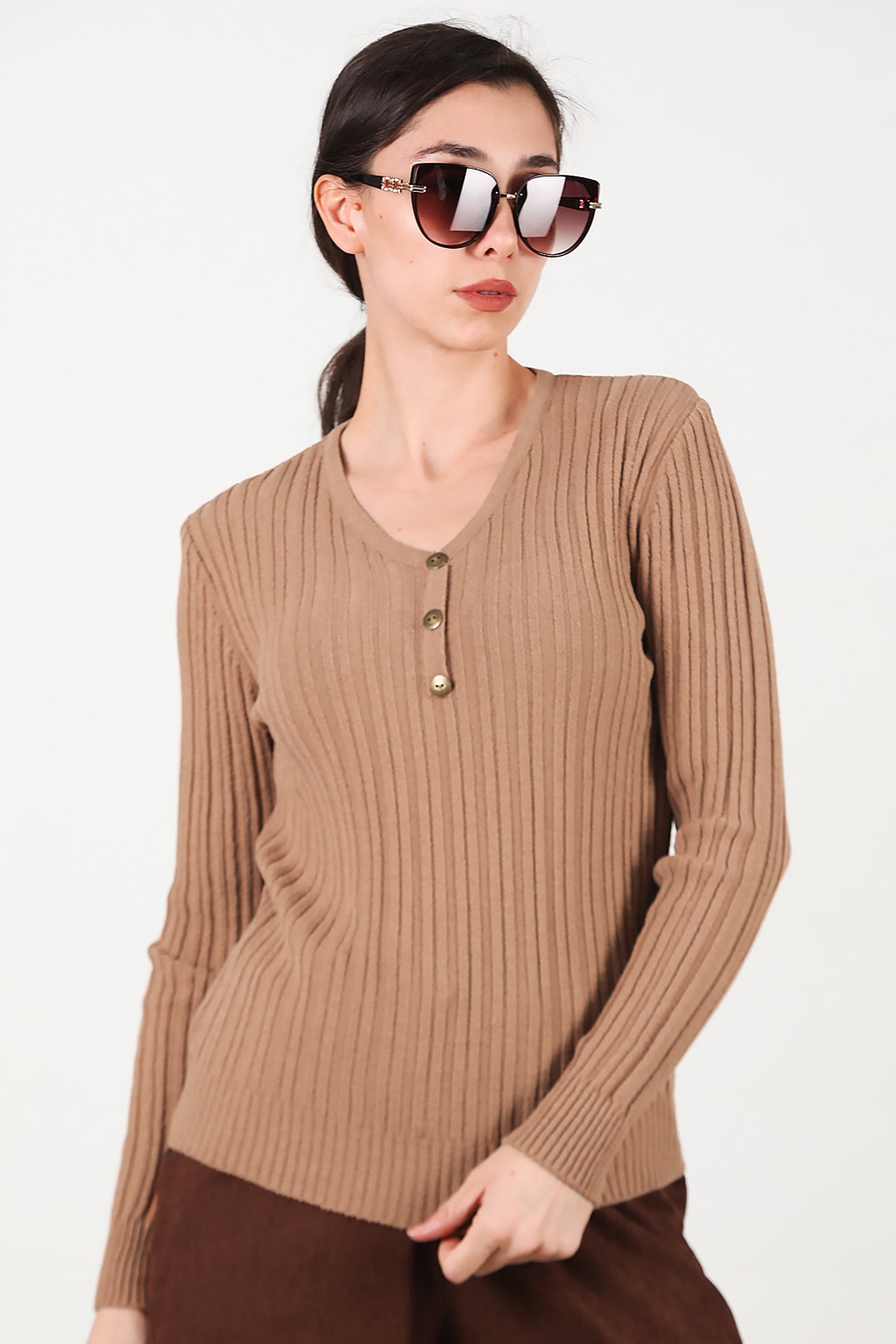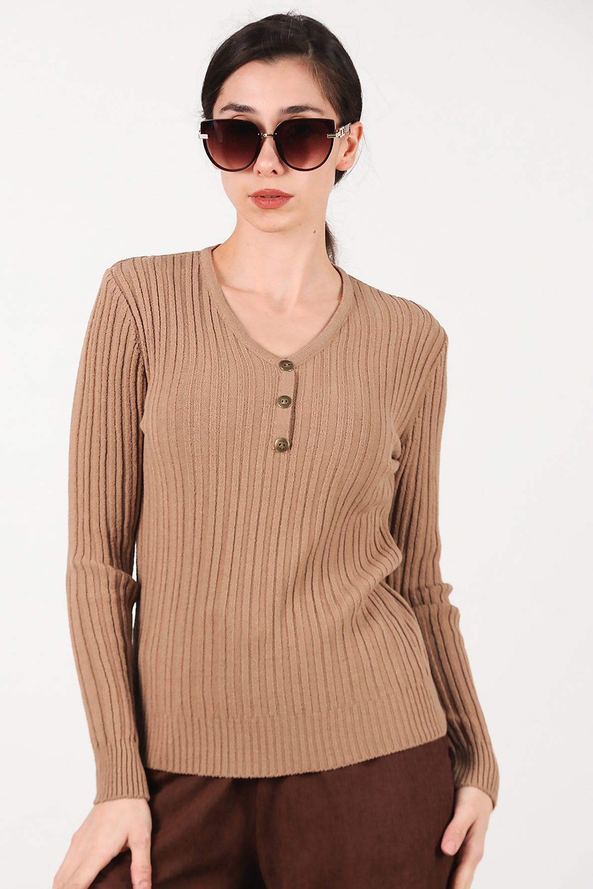 Kadın V Yaka Üç Düğmeli Triko Kazak Bej
