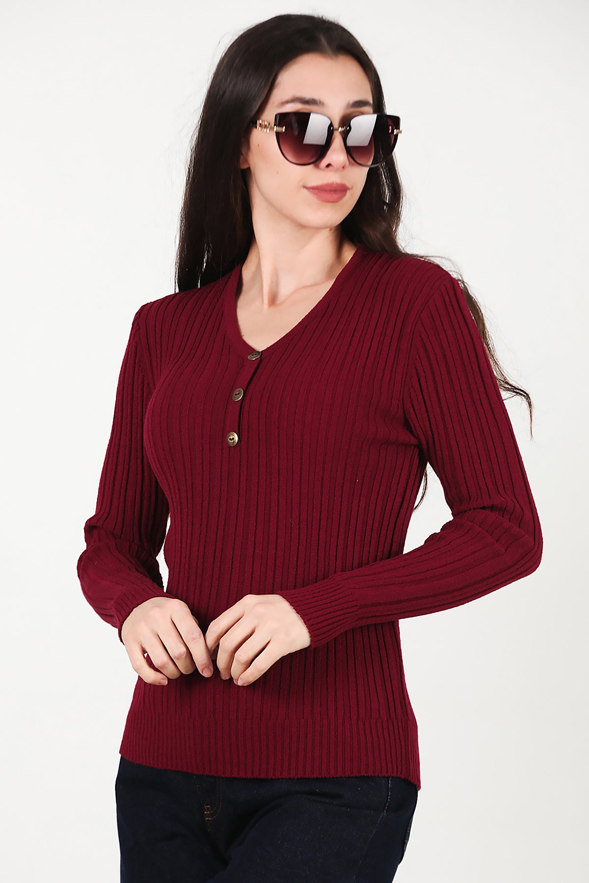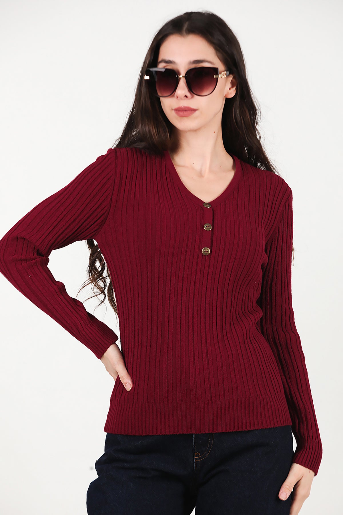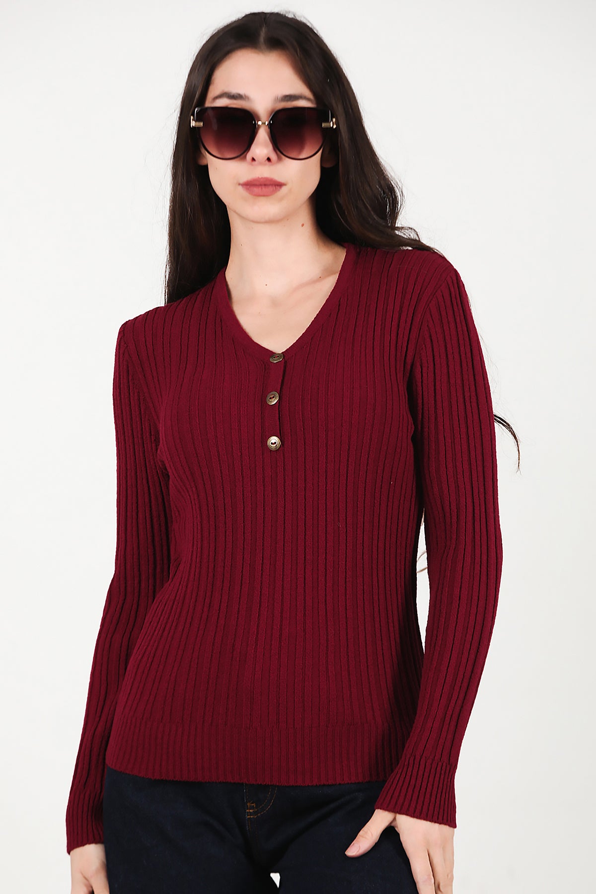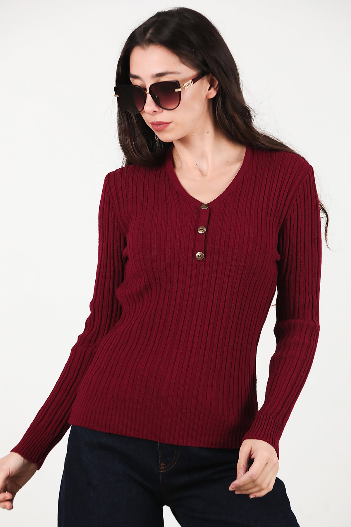 Kadın V Yaka Üç Düğmeli Triko Kazak Bordo