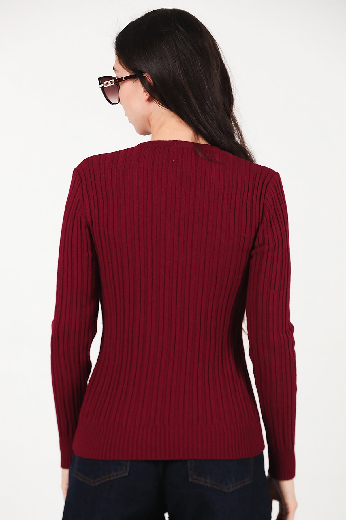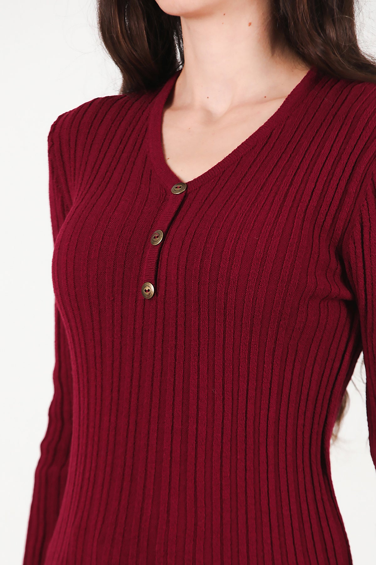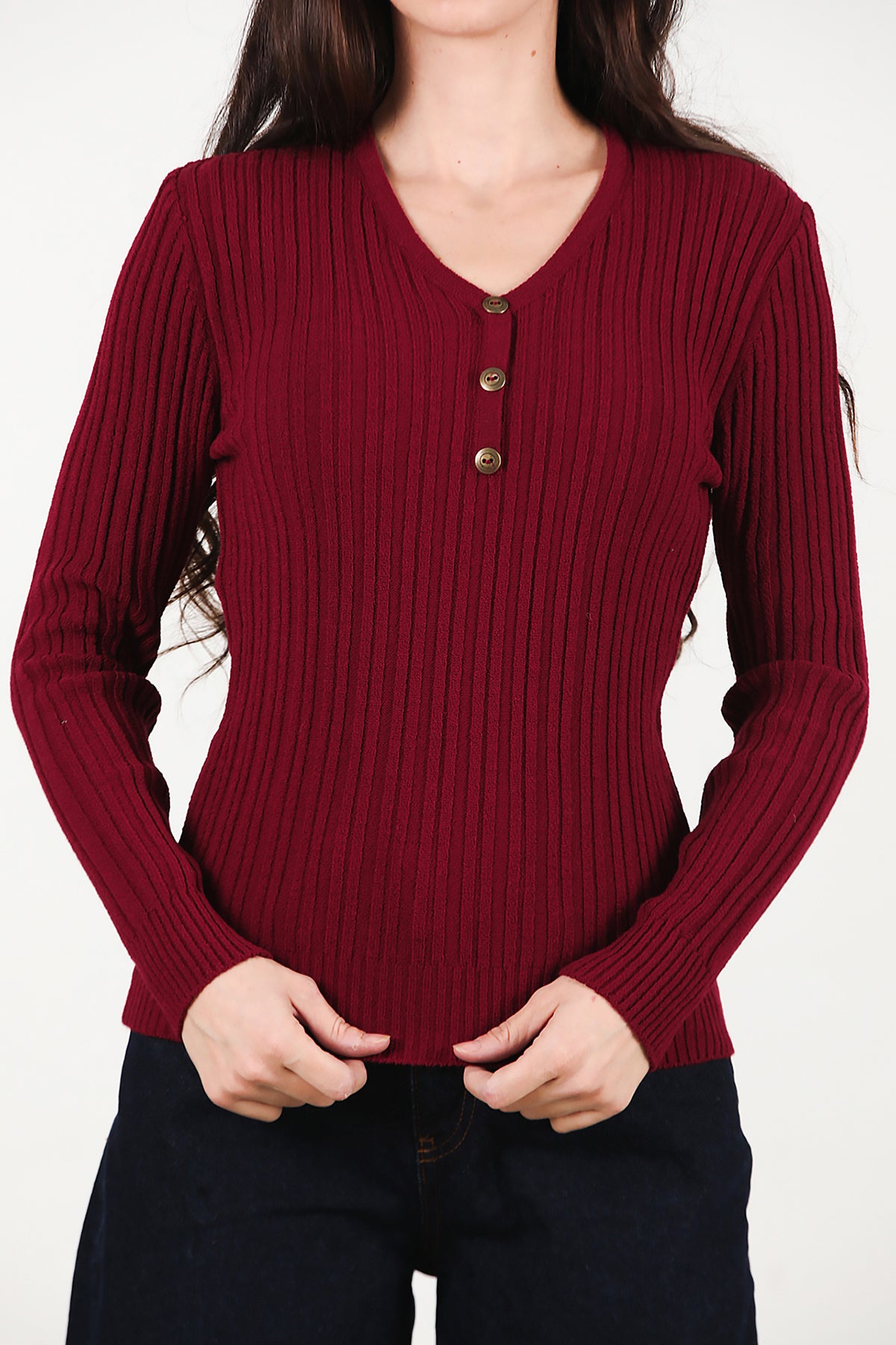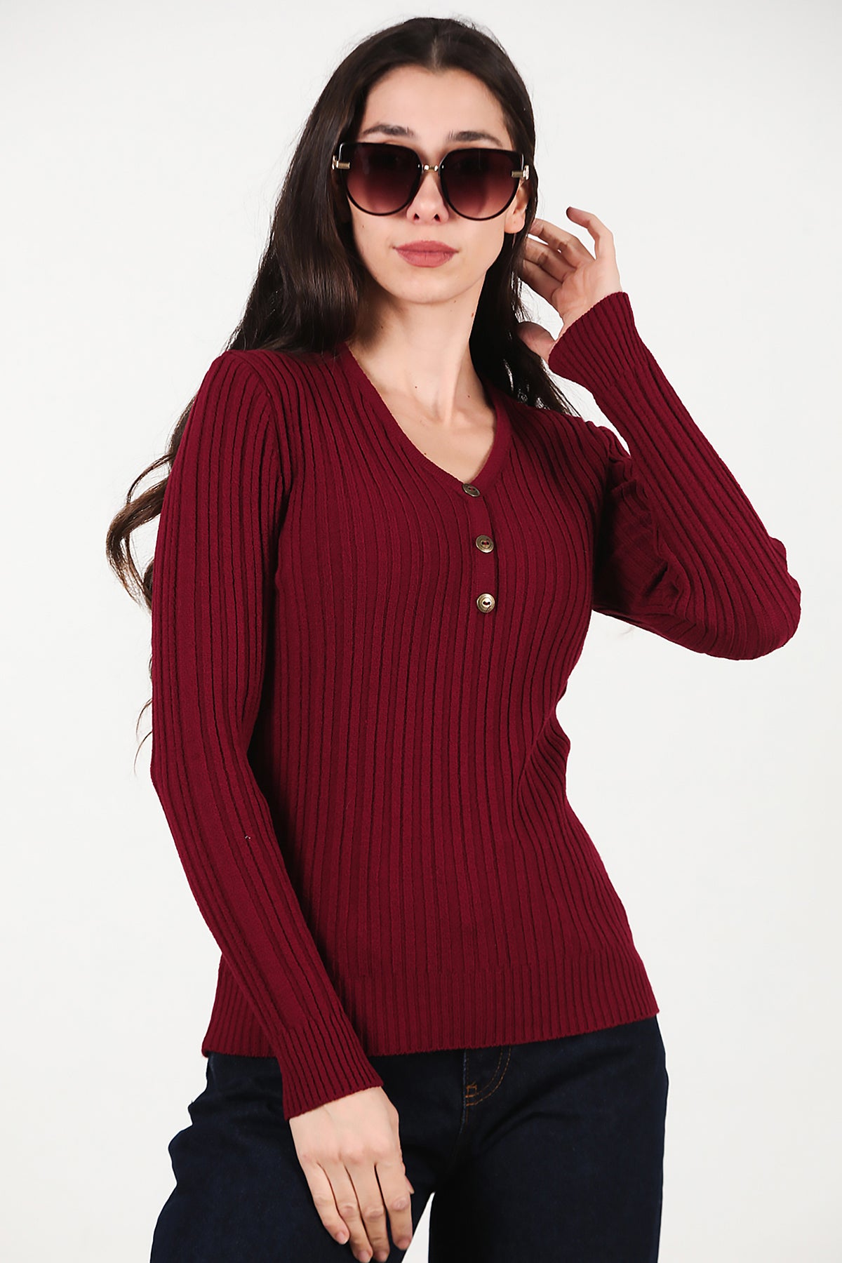 Kadın V Yaka Üç Düğmeli Triko Kazak Bordo