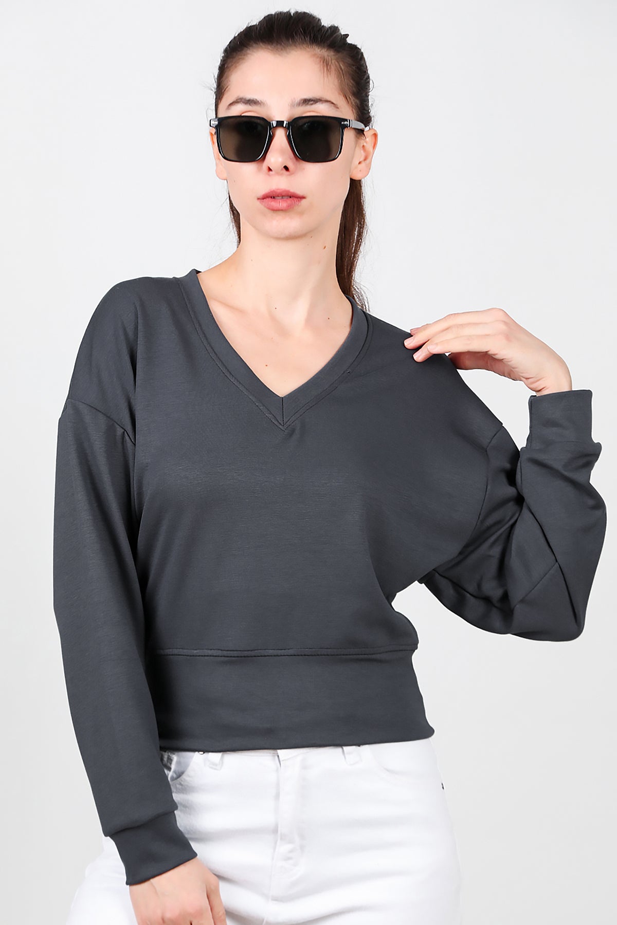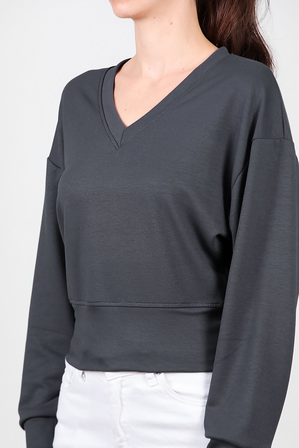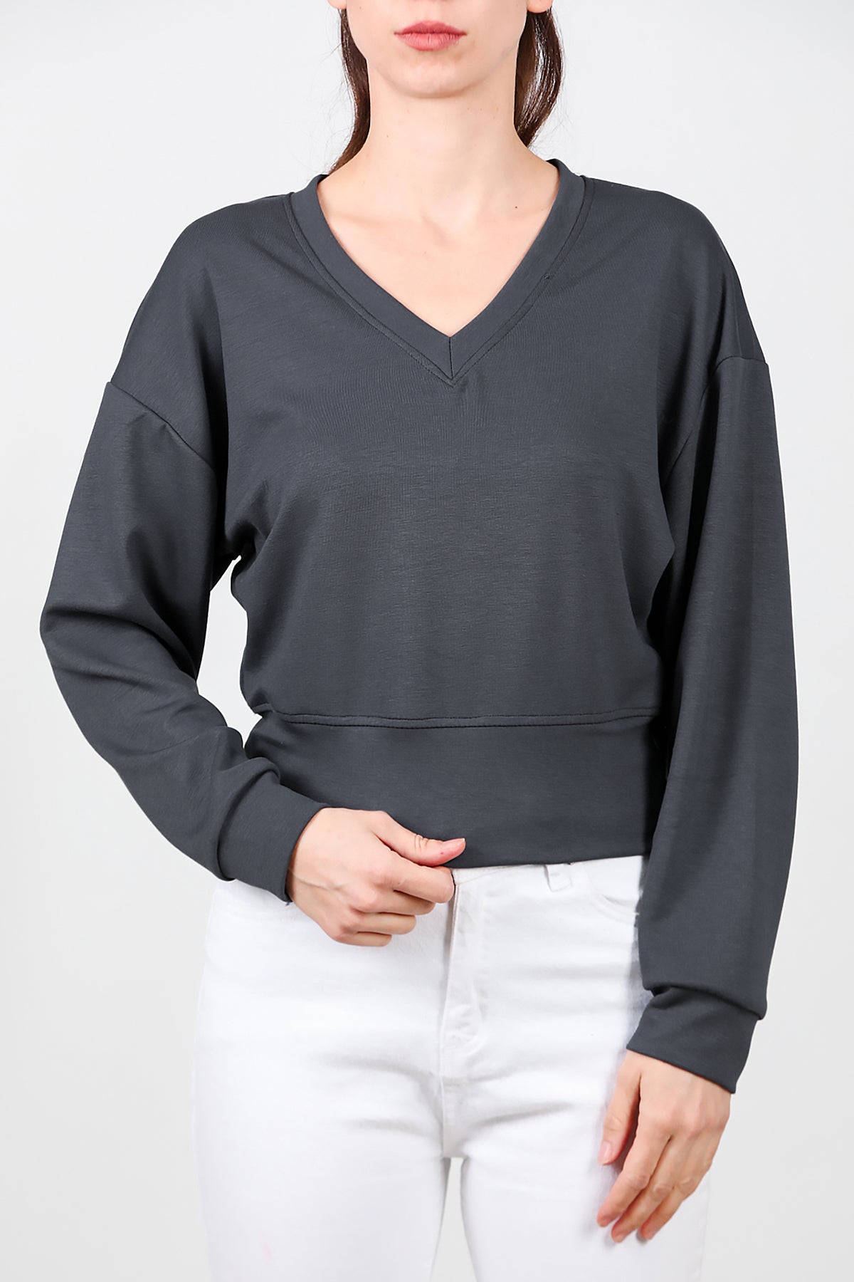 Kadın V Yaka Uzun Kol Sweat Füme