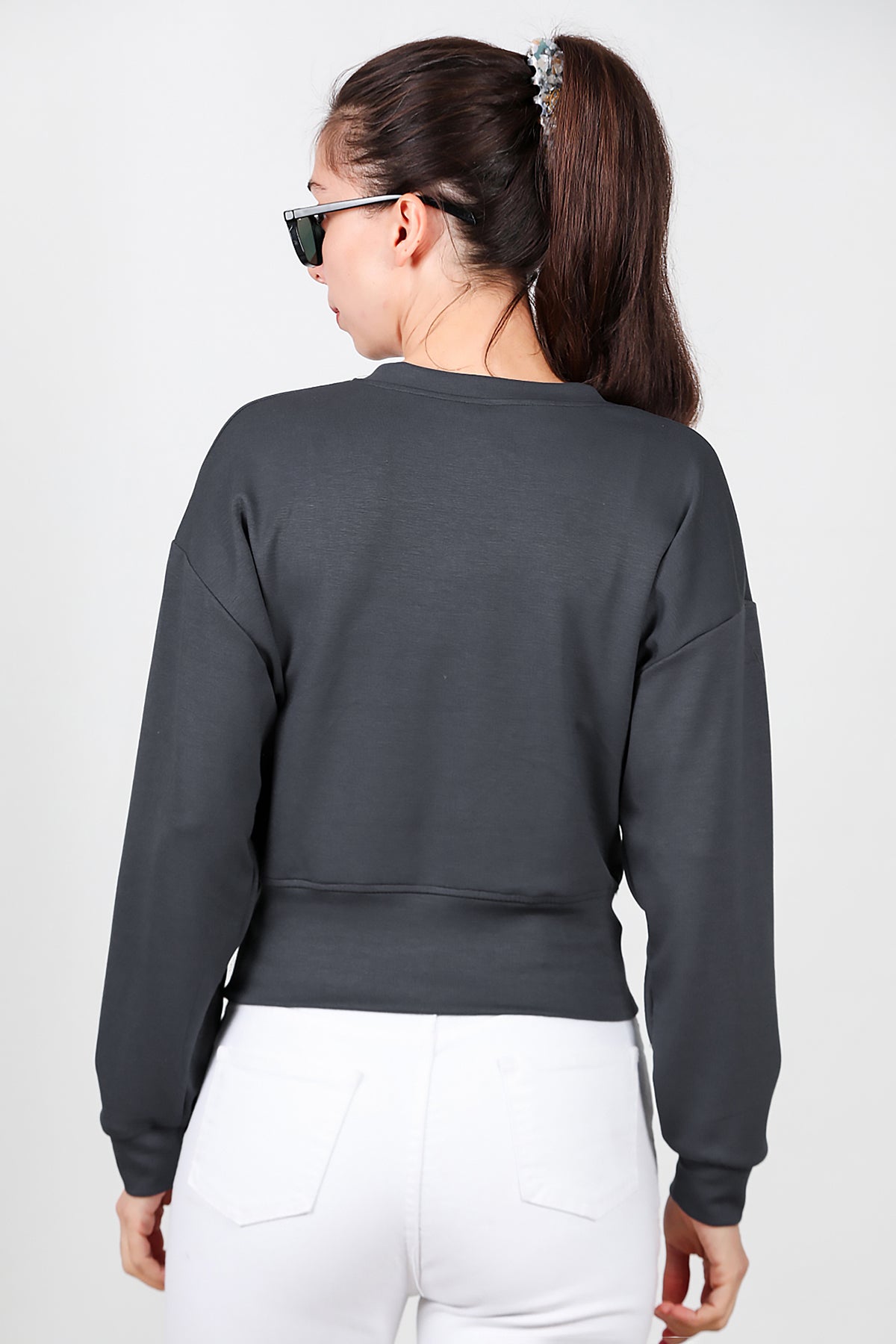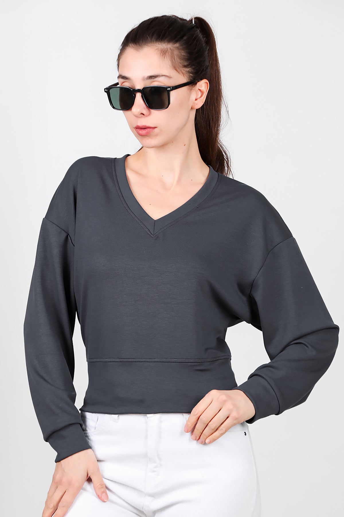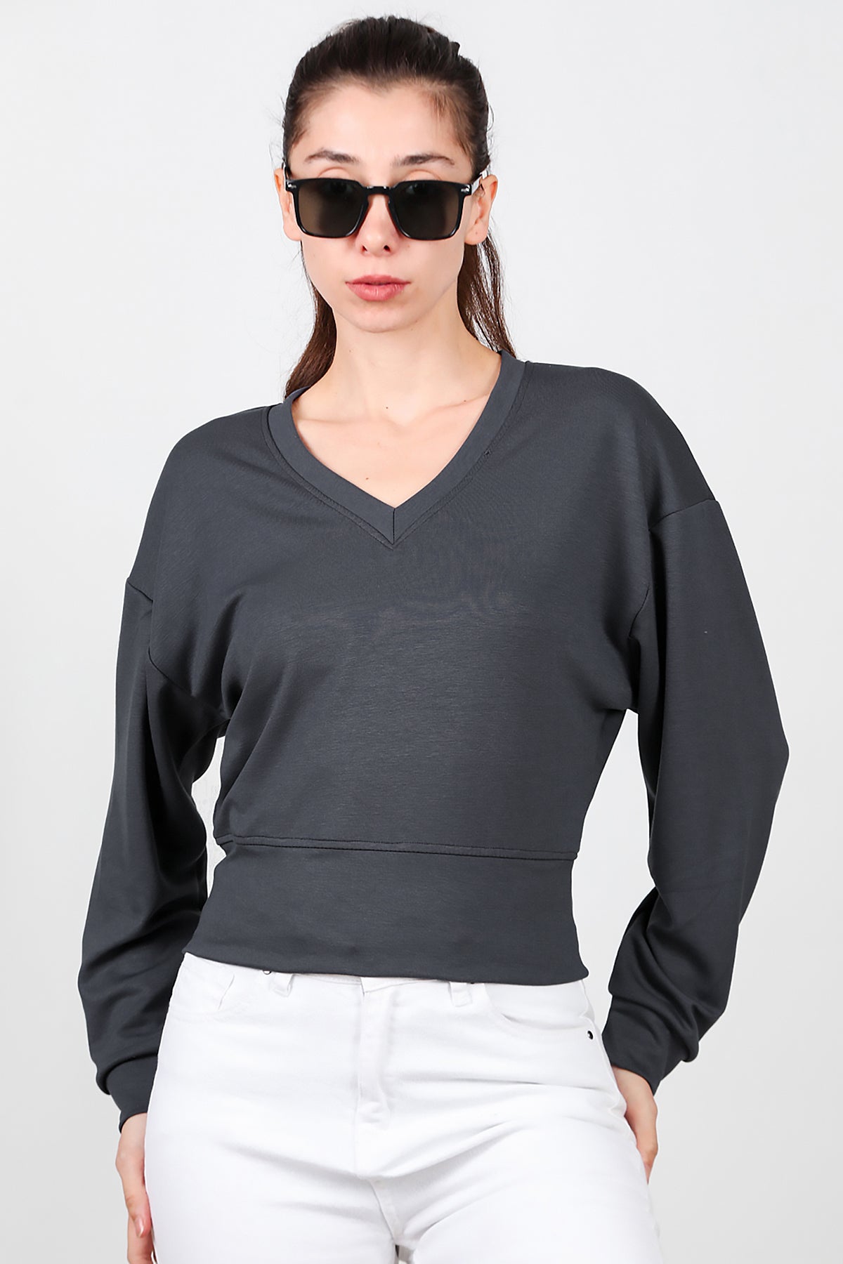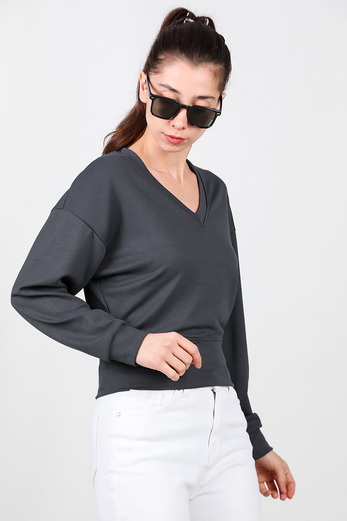 Kadın V Yaka Uzun Kol Sweat Füme