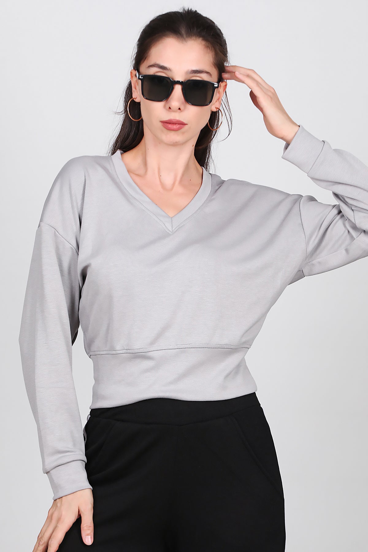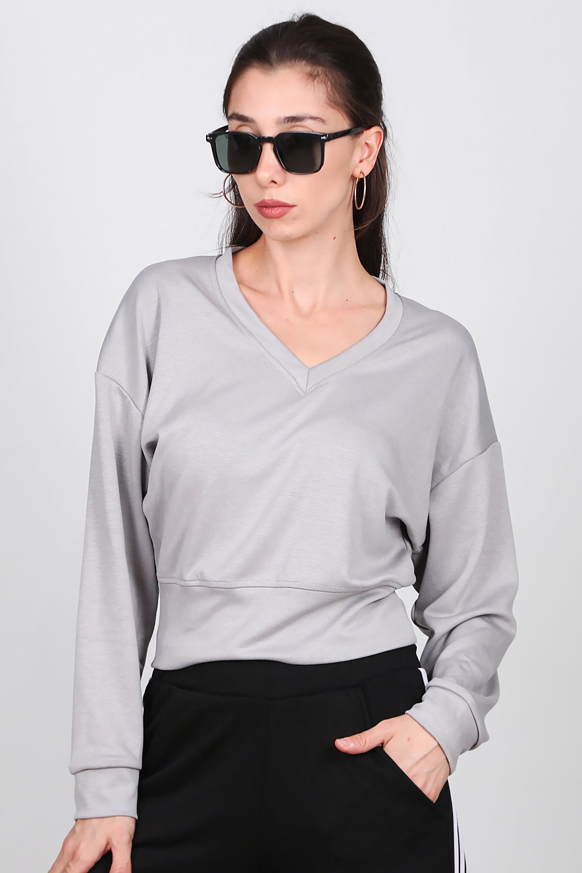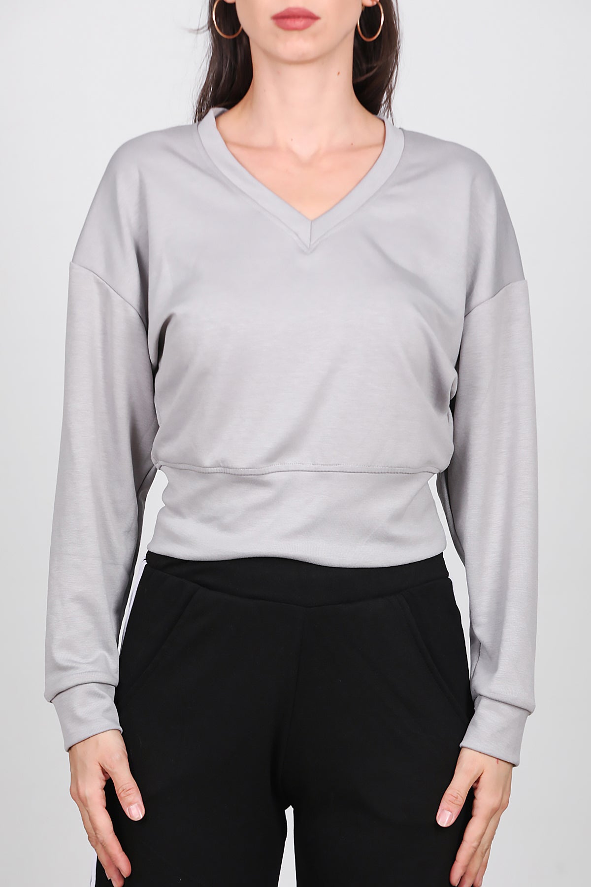 Kadın V Yaka Uzun Kol Sweat Gri