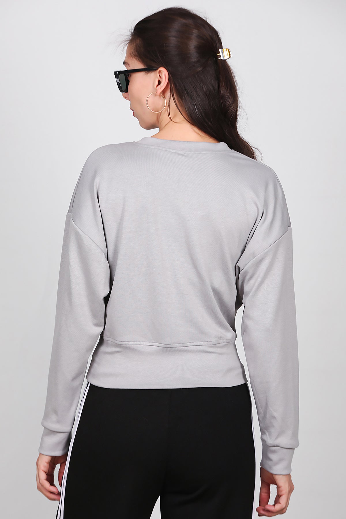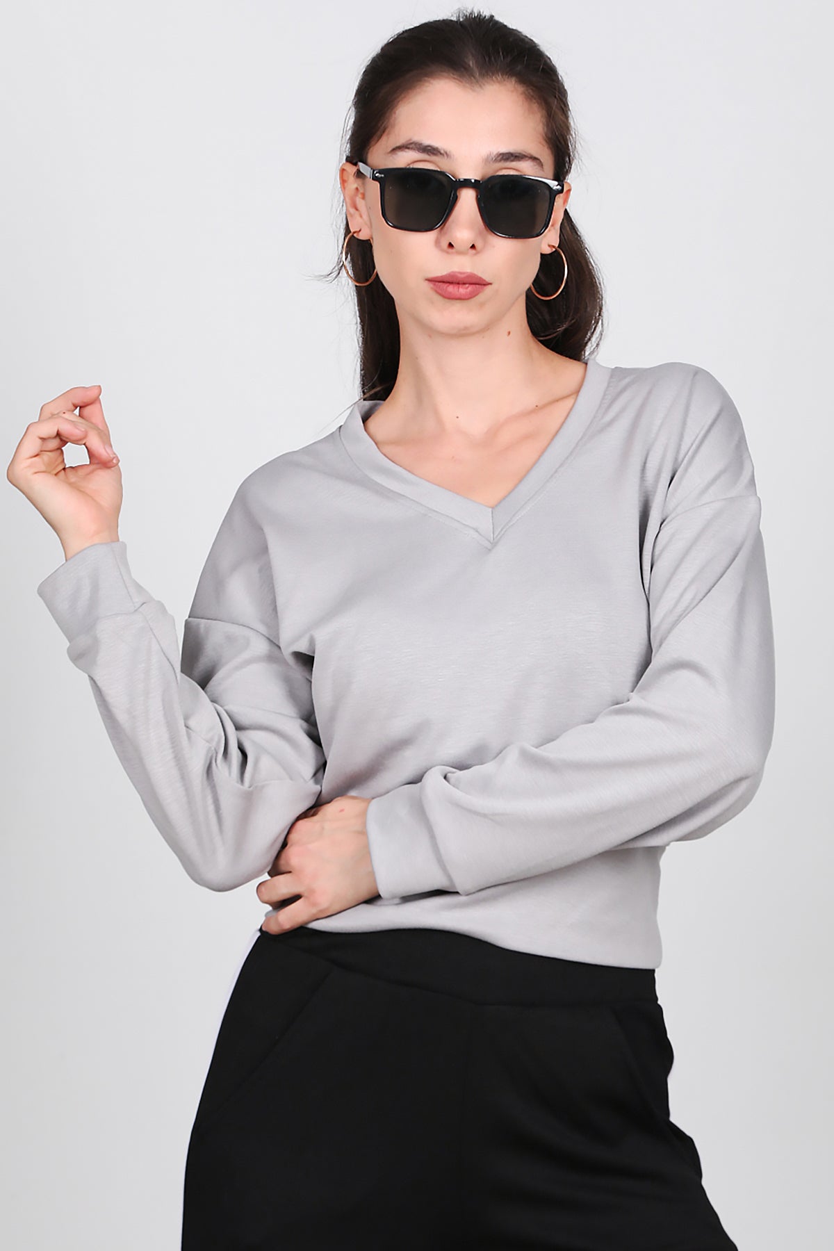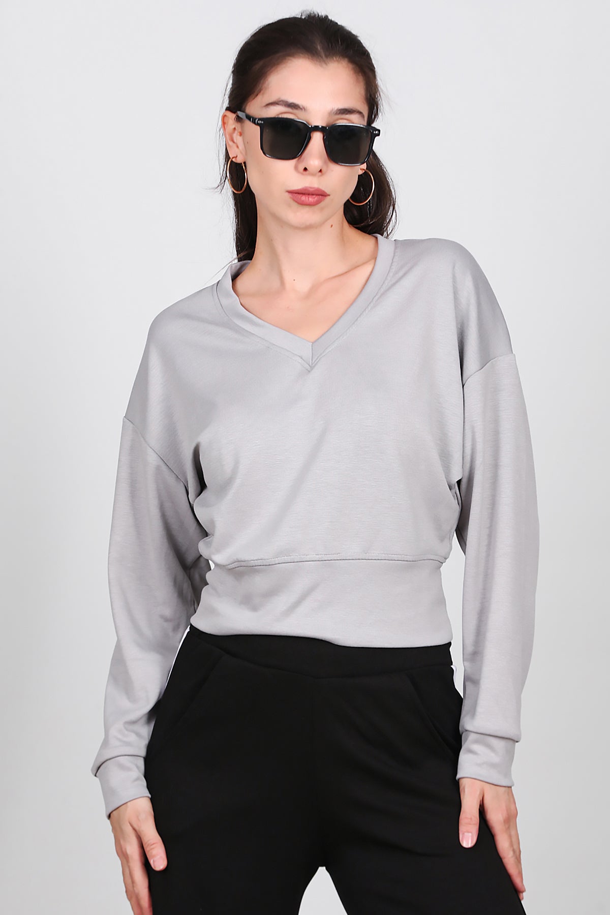 Kadın V Yaka Uzun Kol Sweat Gri