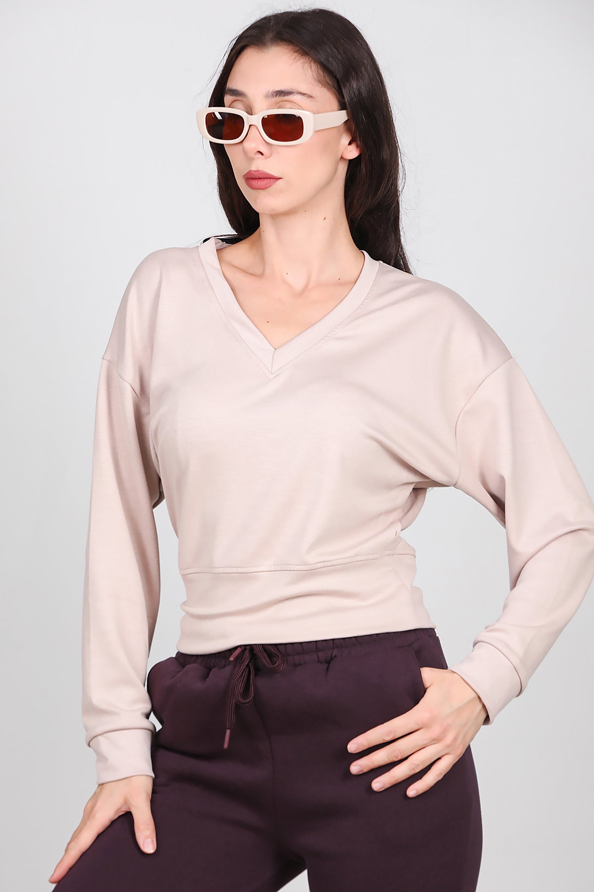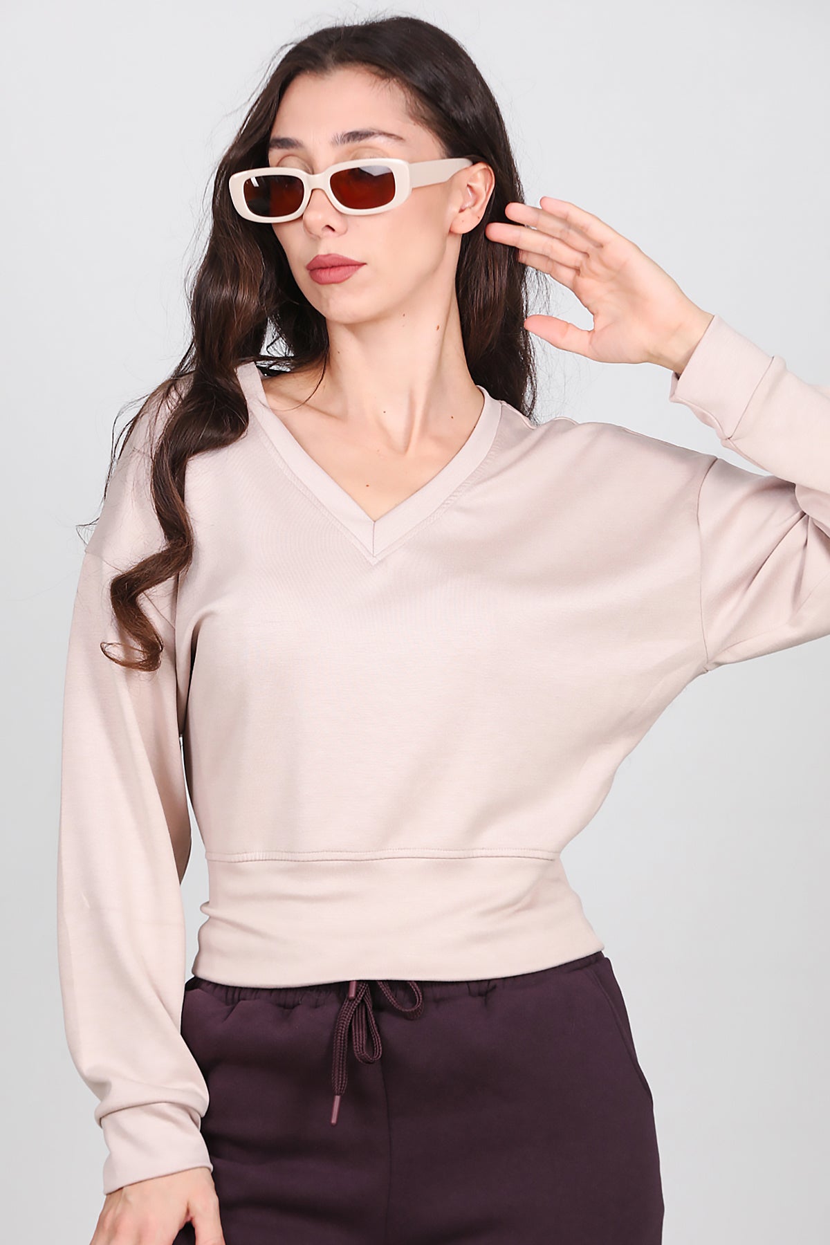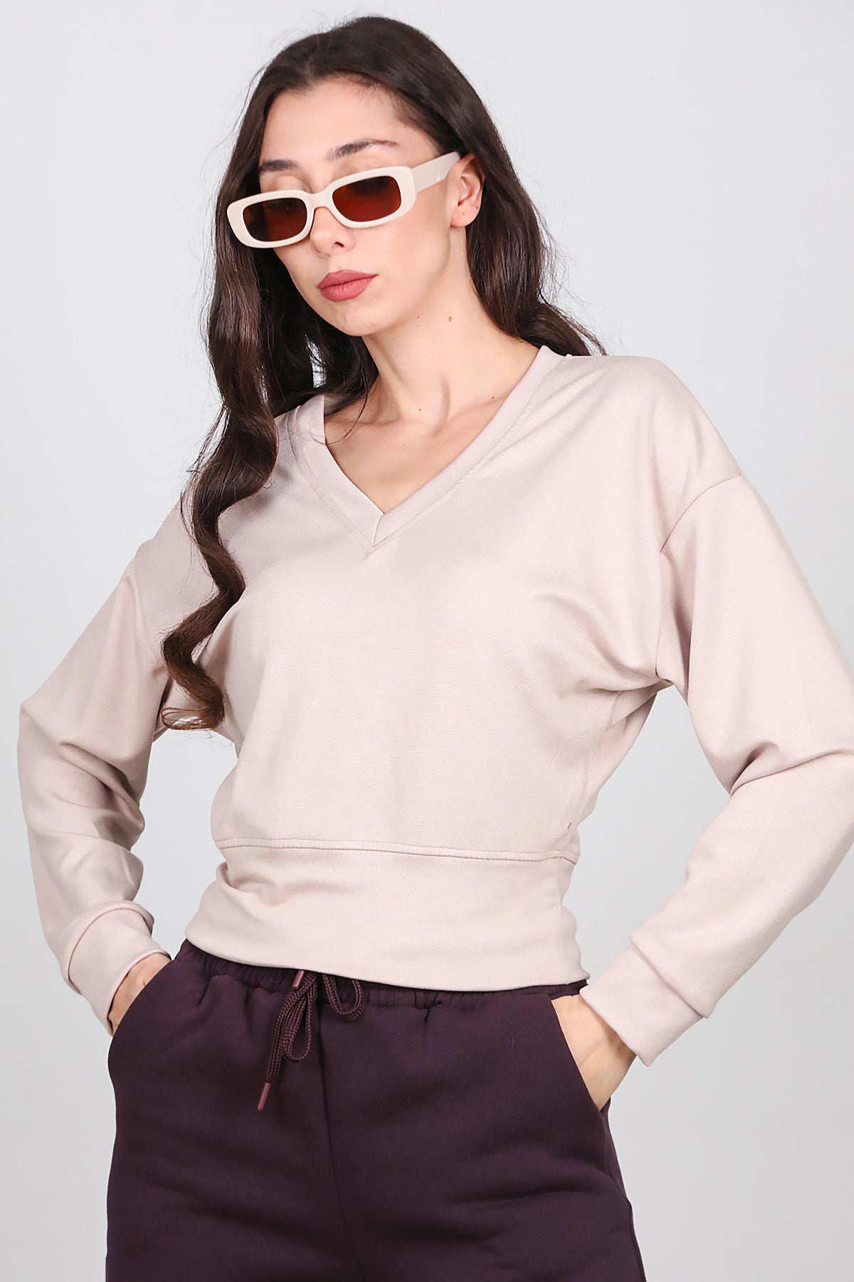 Kadın V Yaka Uzun Kol Sweat Vizon