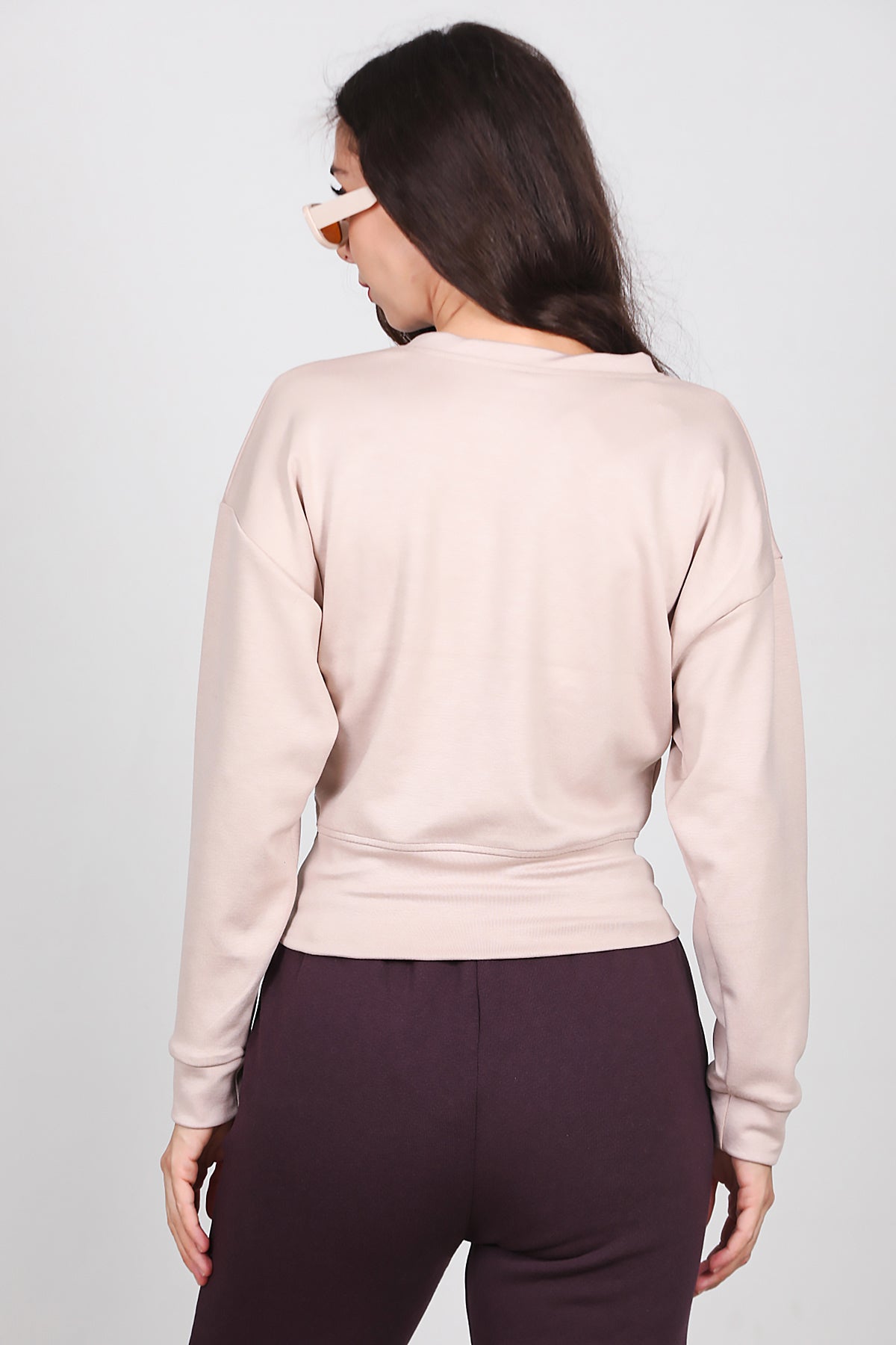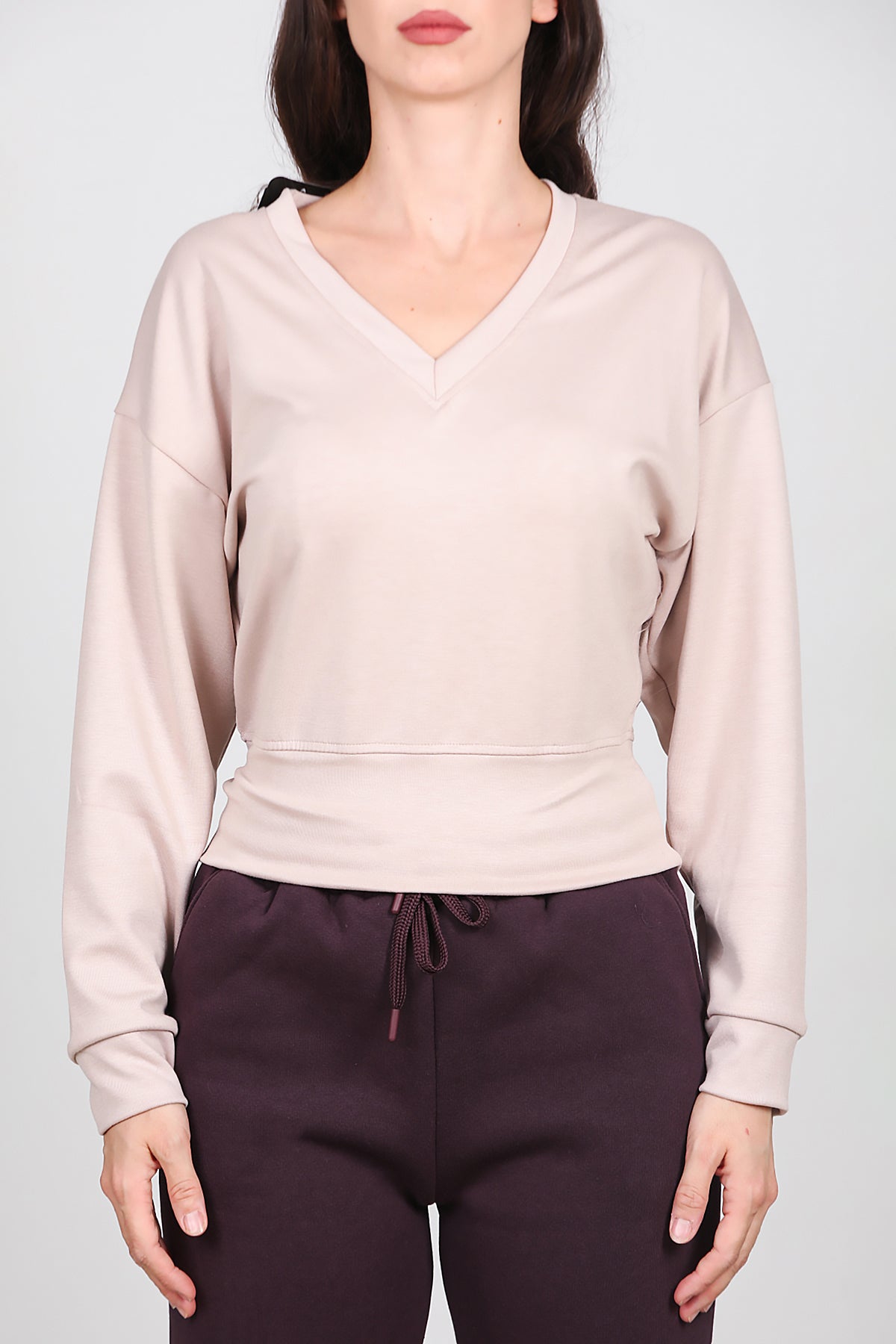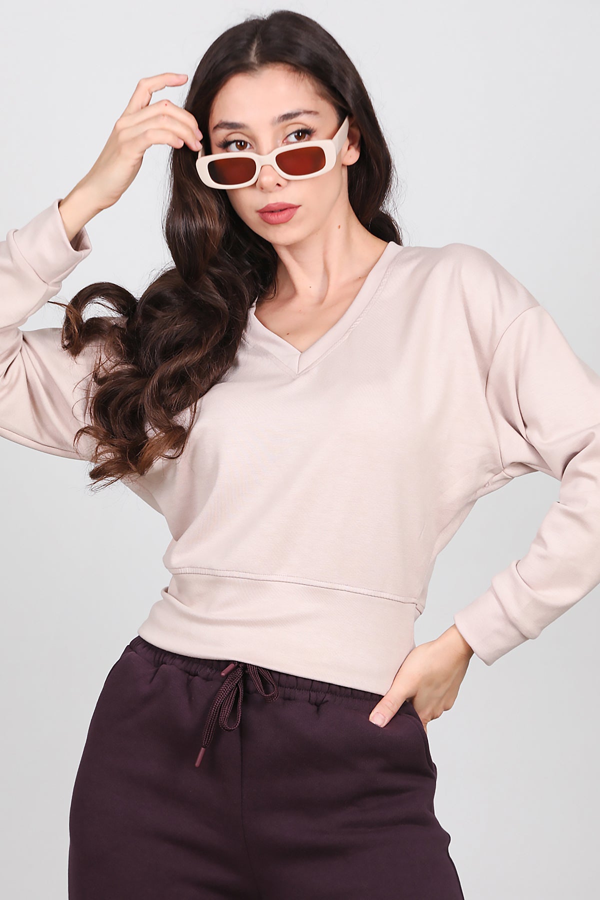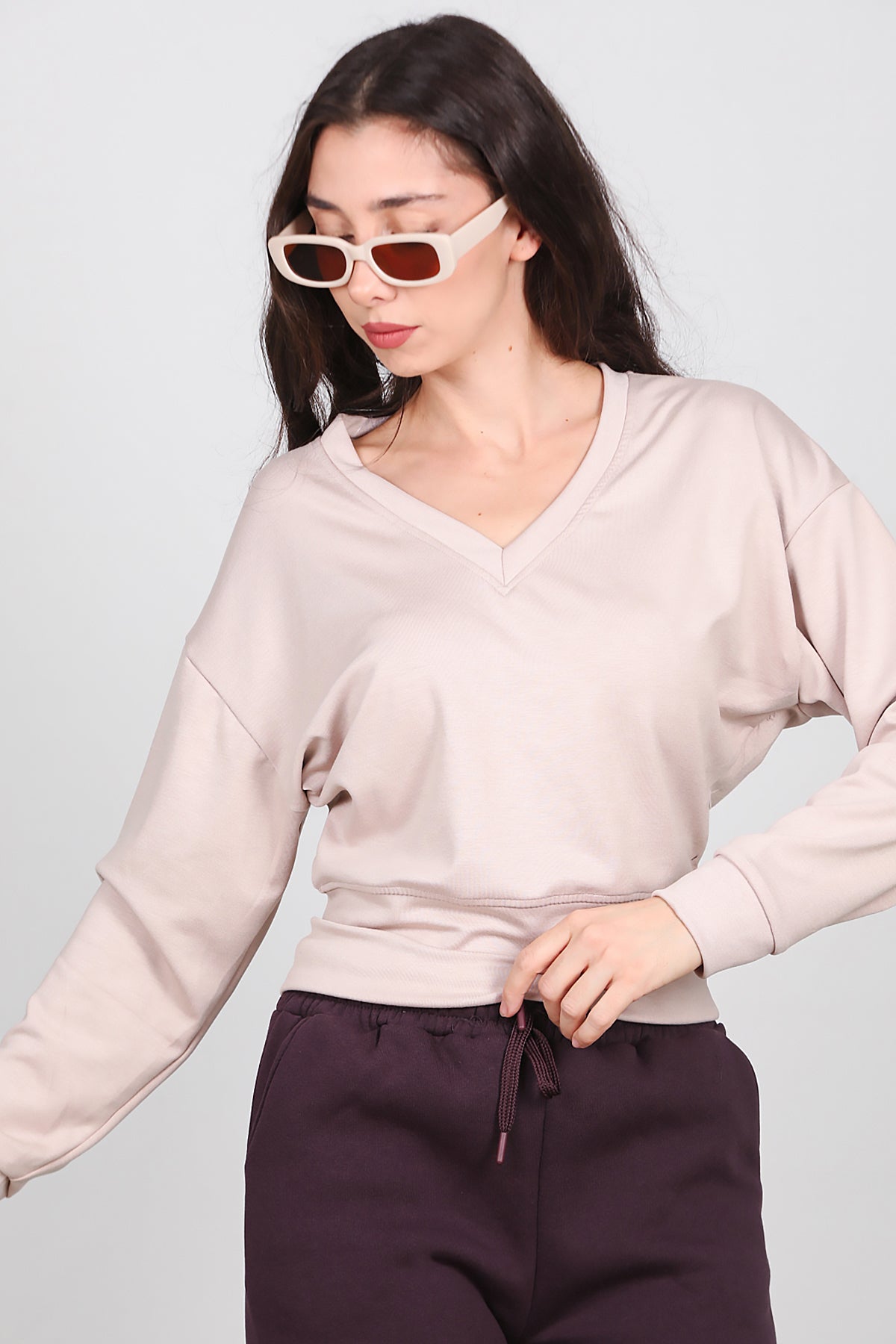 Kadın V Yaka Uzun Kol Sweat Vizon