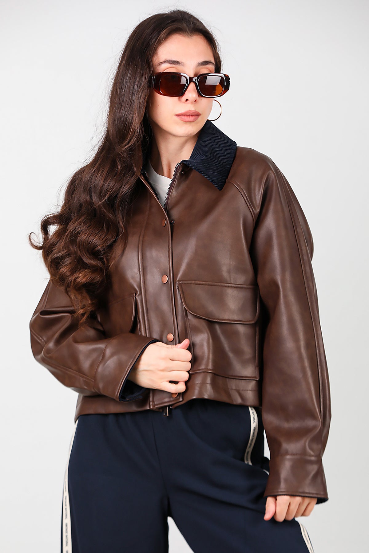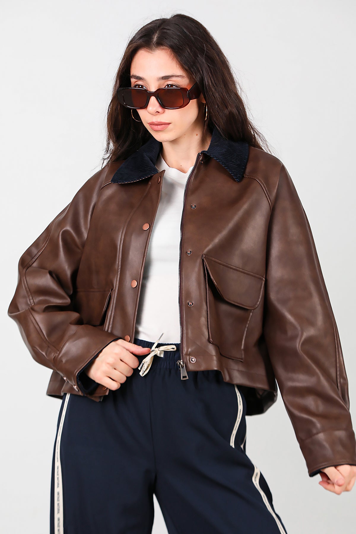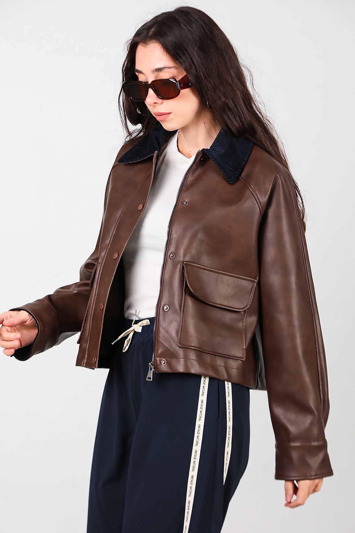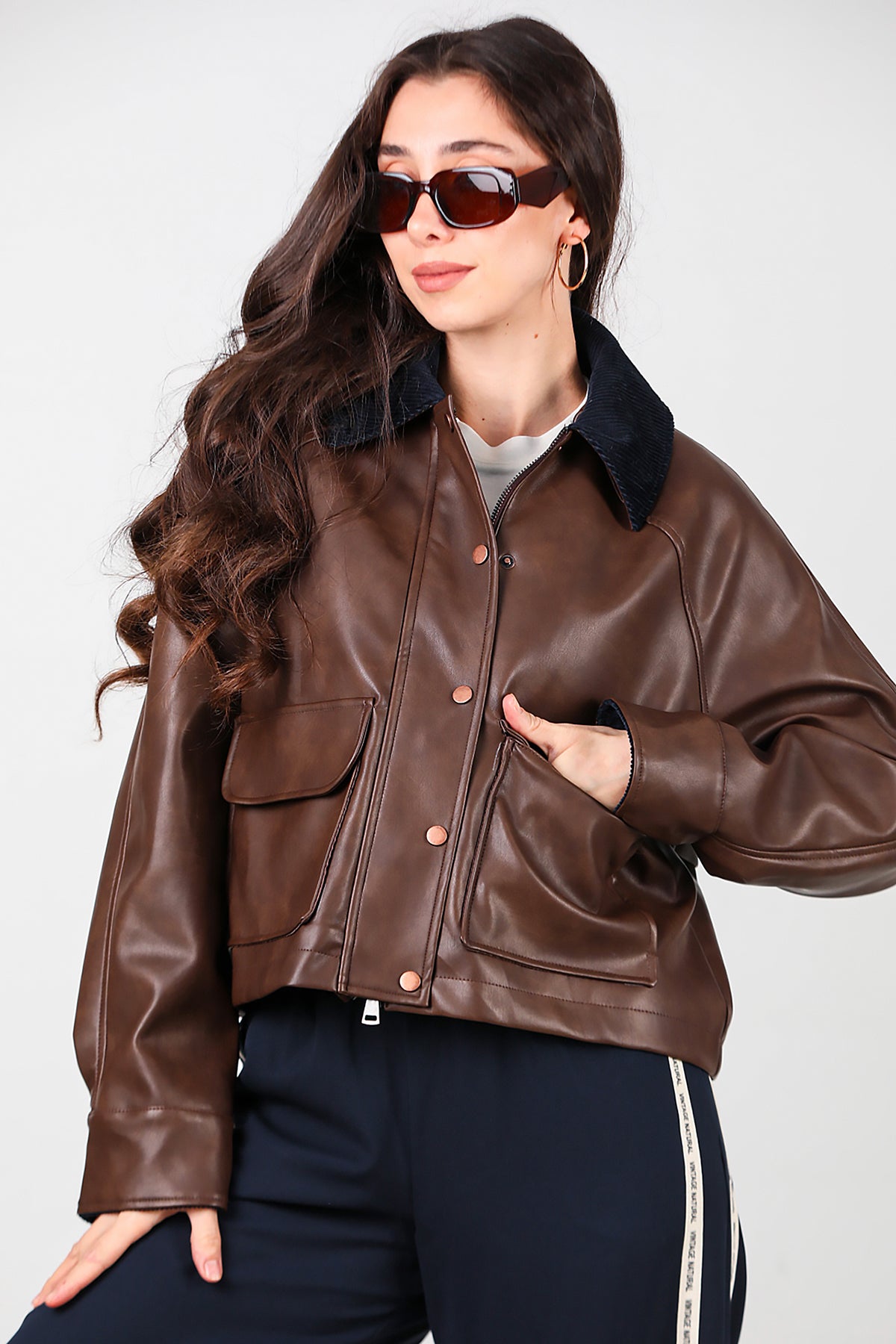 Kadın Yaka Kadife Detay Kısa Deri Ceket Kahverengi