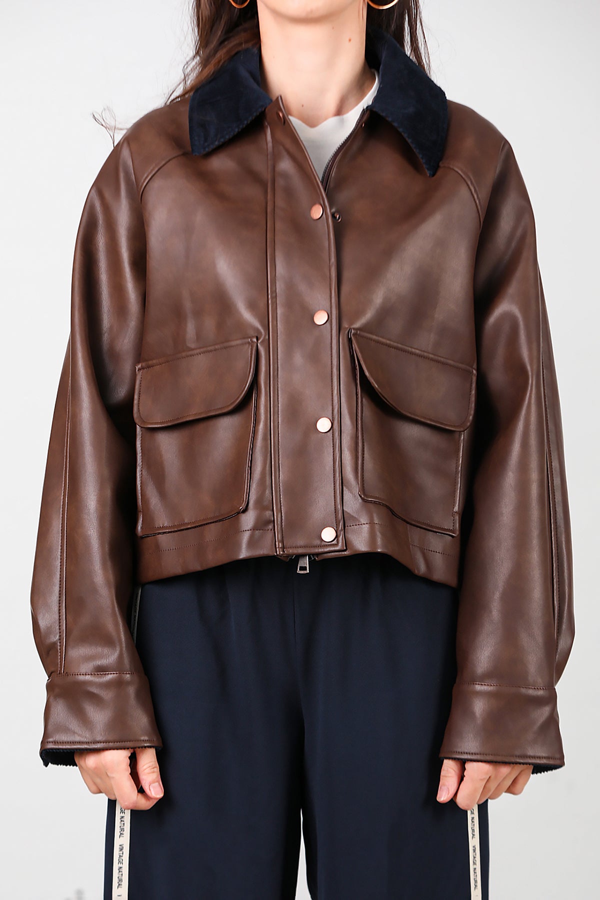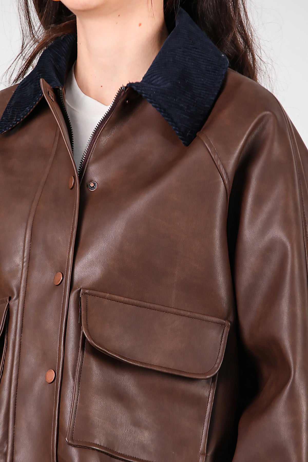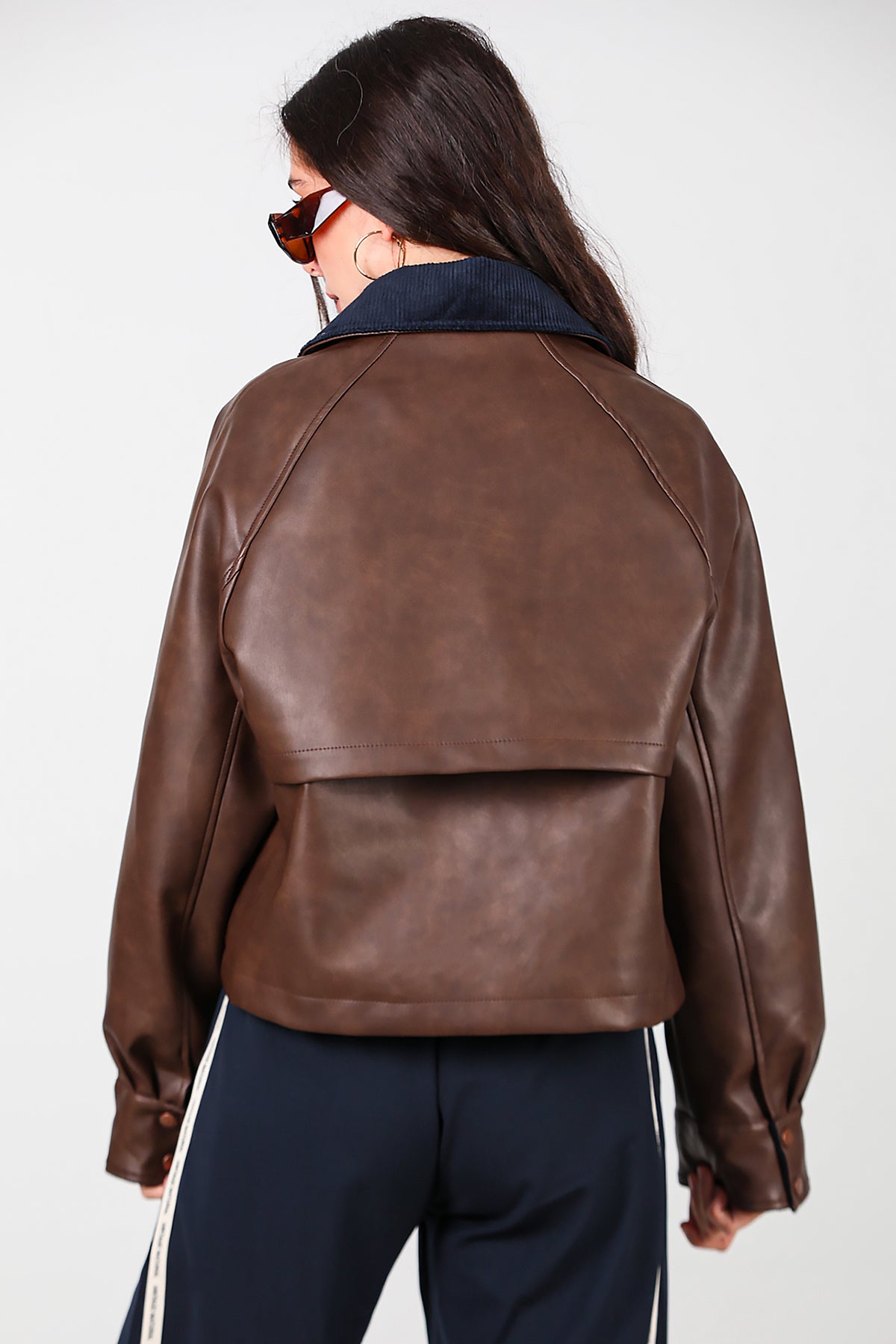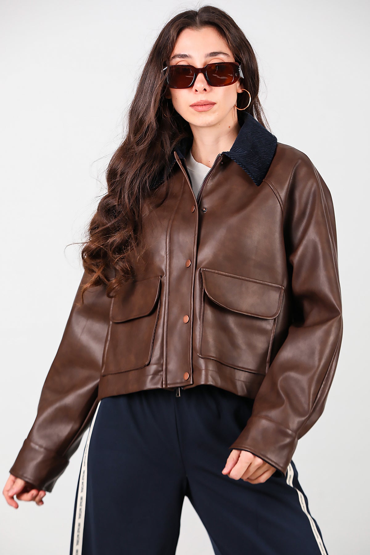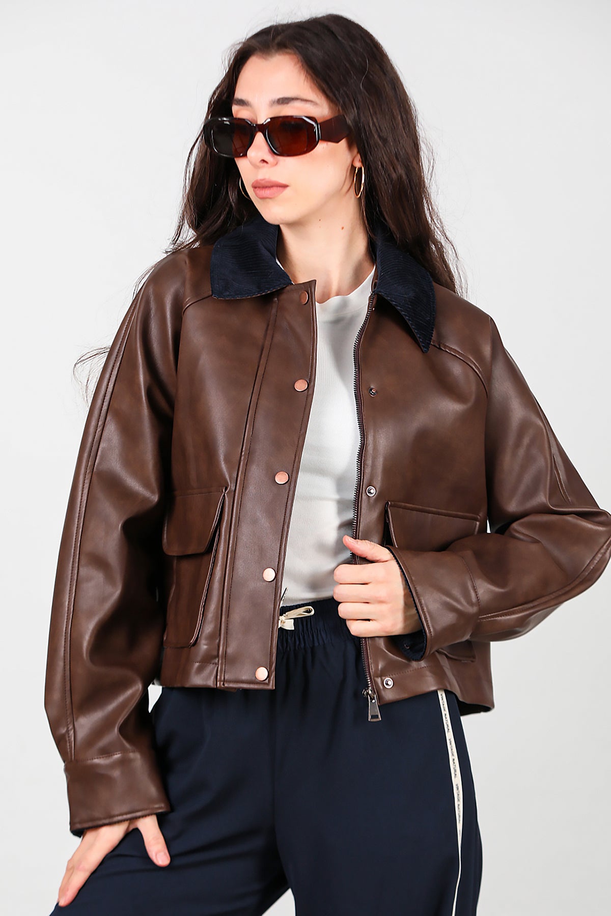 Kadın Yaka Kadife Detay Kısa Deri Ceket Kahverengi