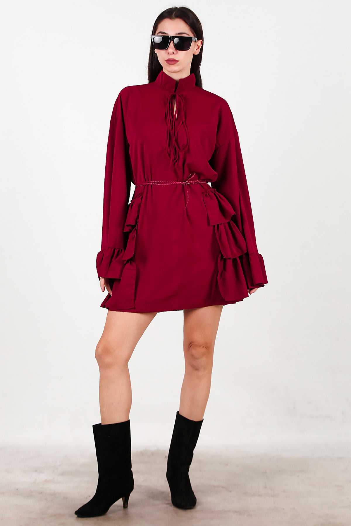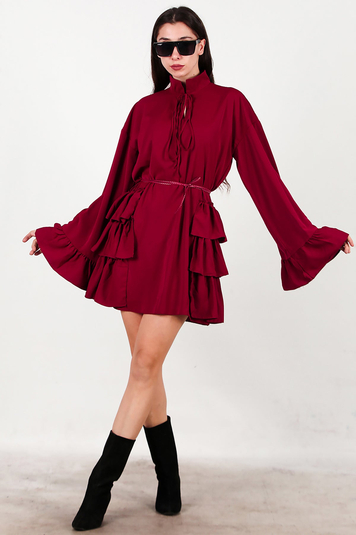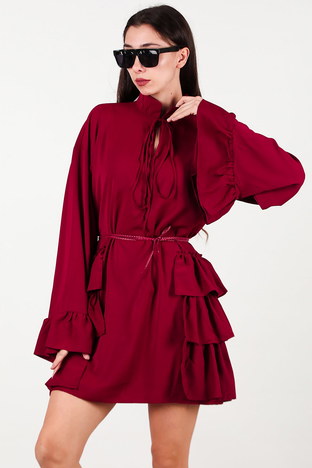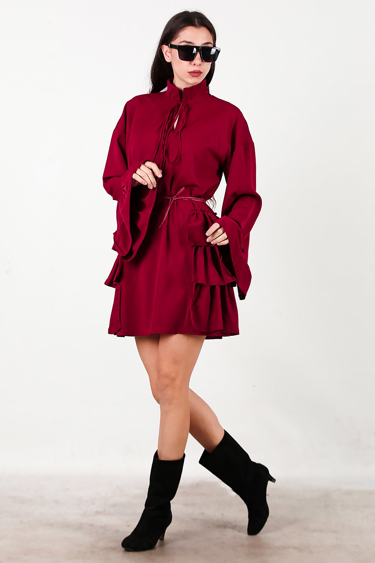 Kadın Yan Ve Kol Ucu Fırfırlı Saten Elbise Bordo