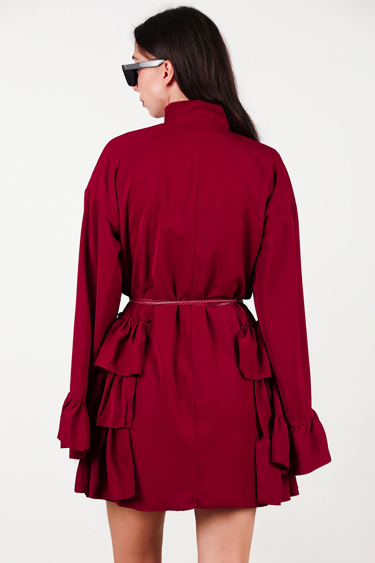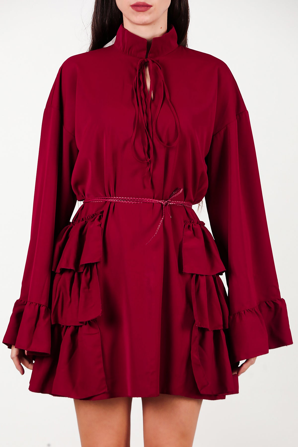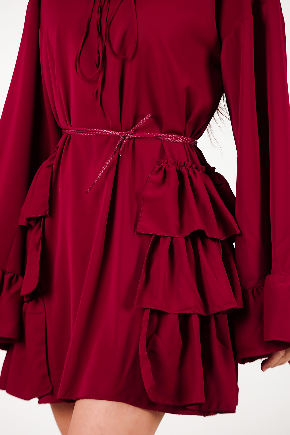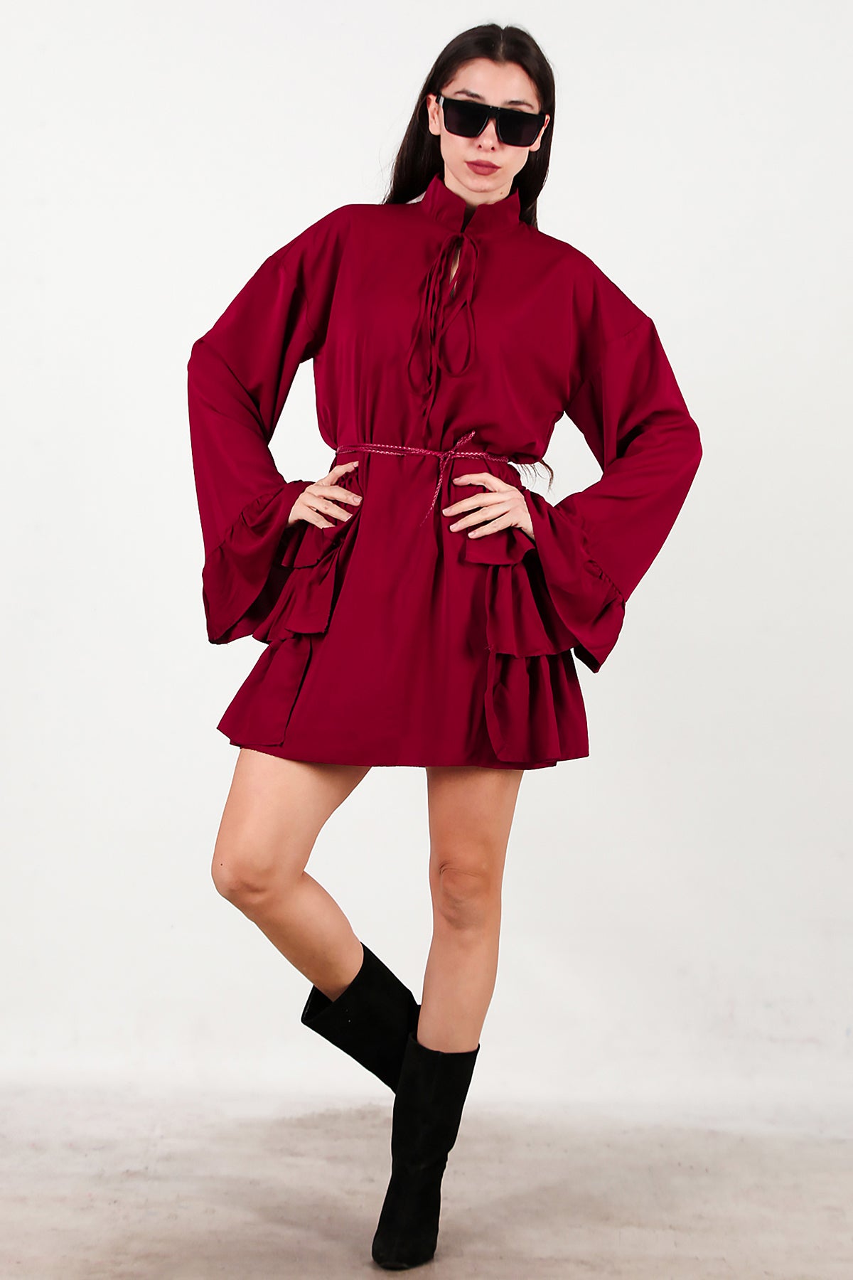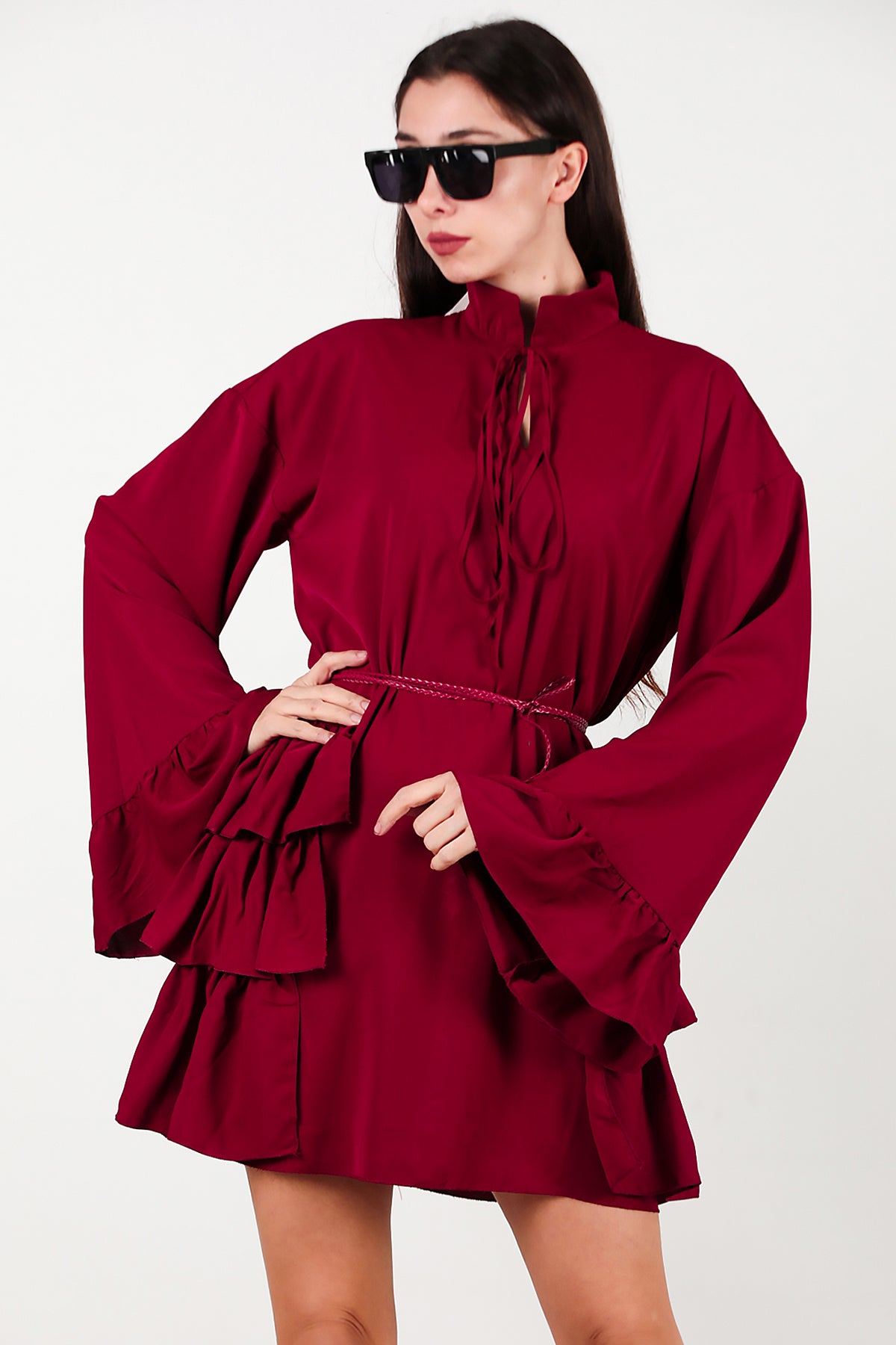 Kadın Yan Ve Kol Ucu Fırfırlı Saten Elbise Bordo