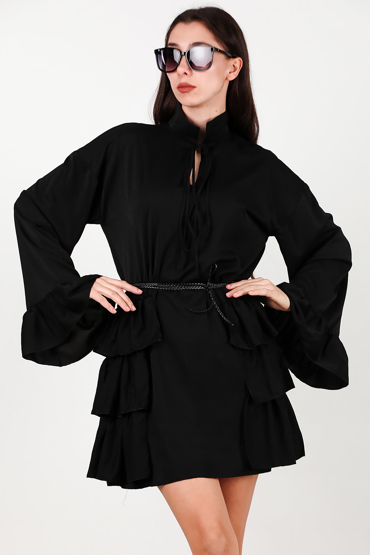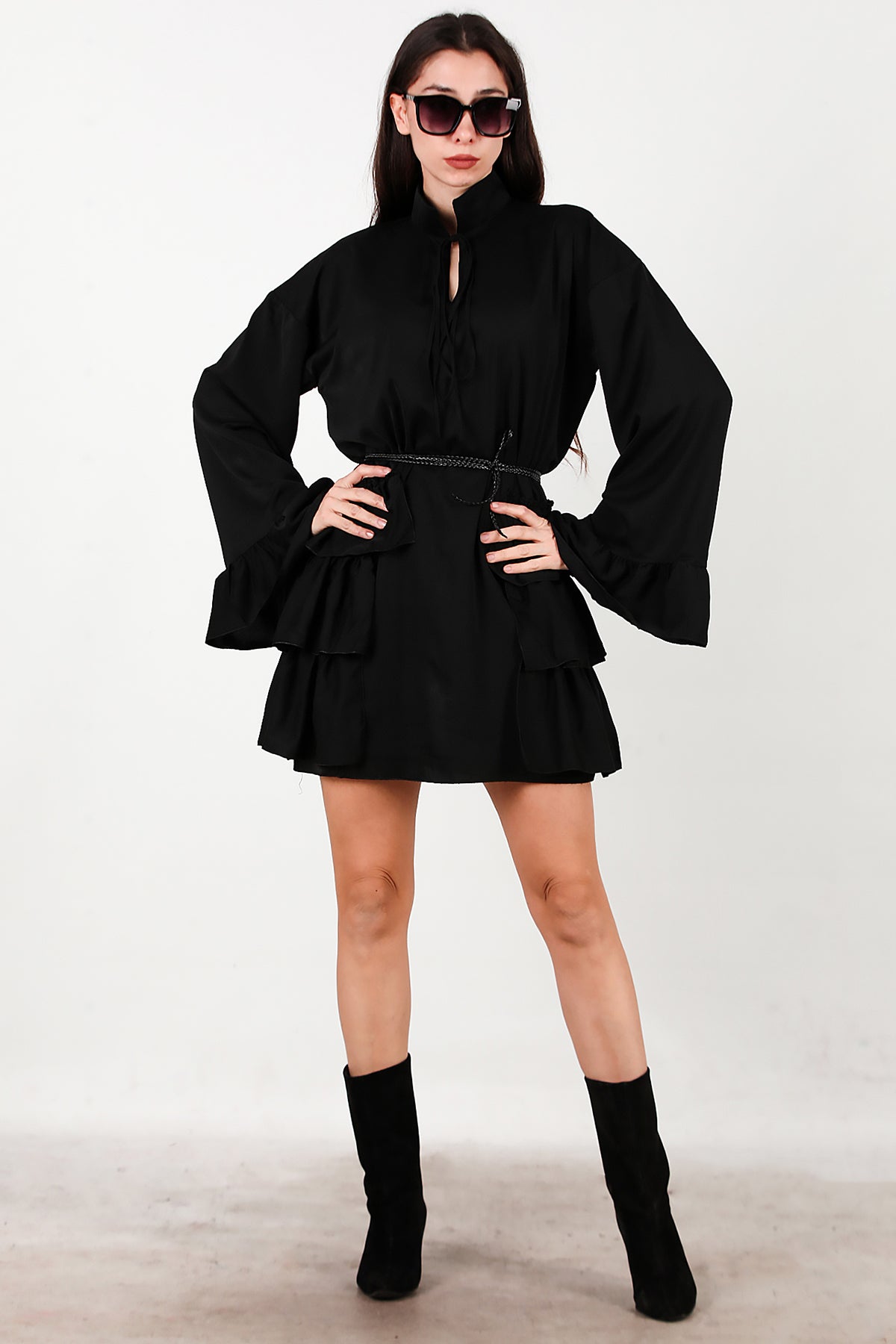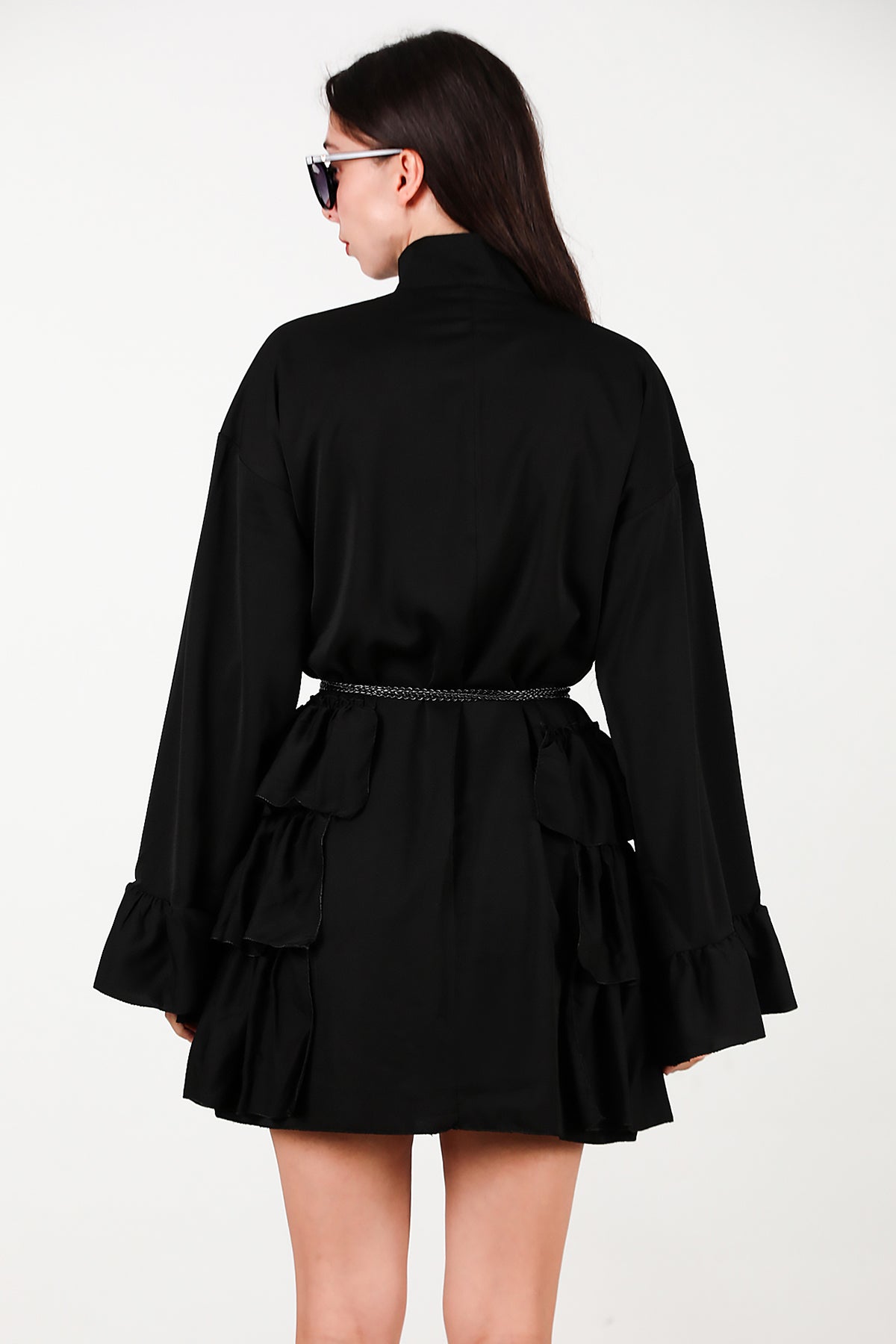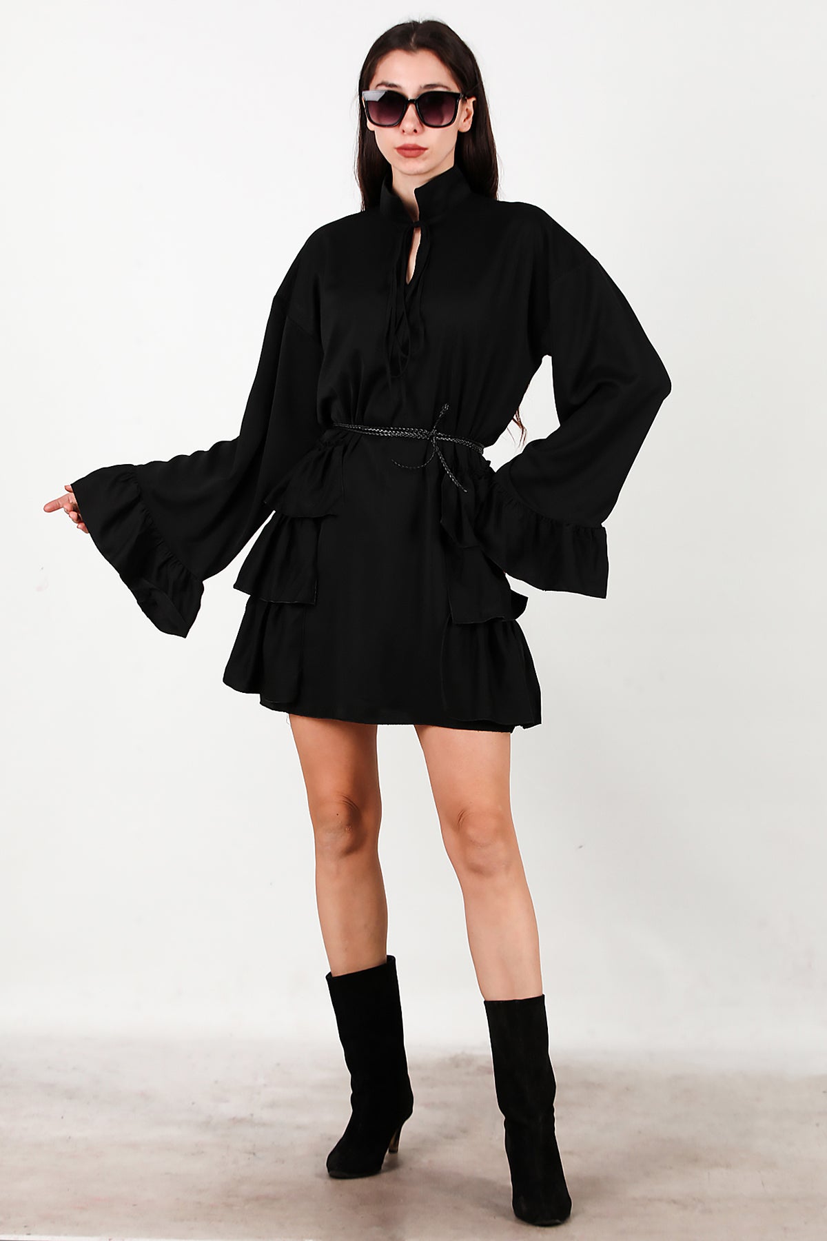 Kadın Yan Ve Kol Ucu Fırfırlı Saten Elbise Siyah
