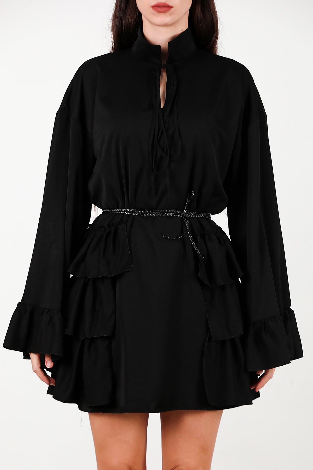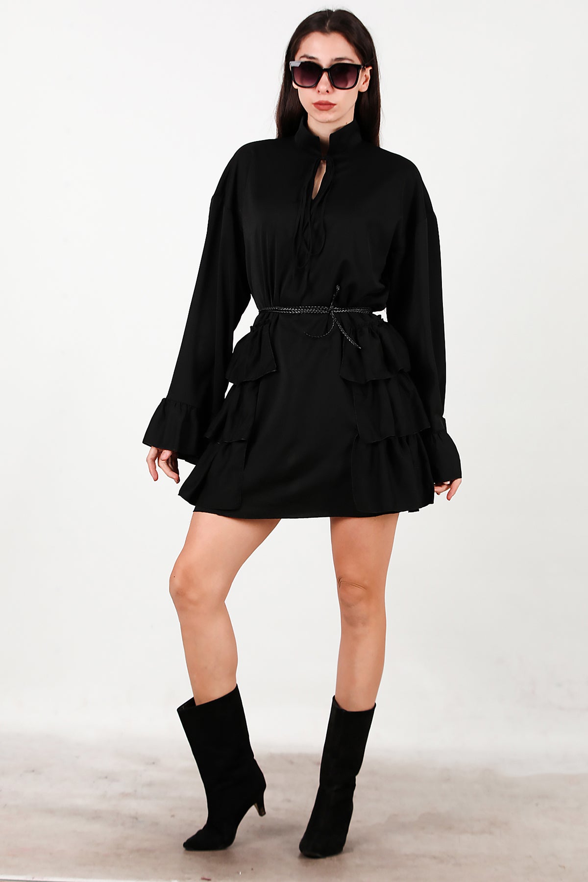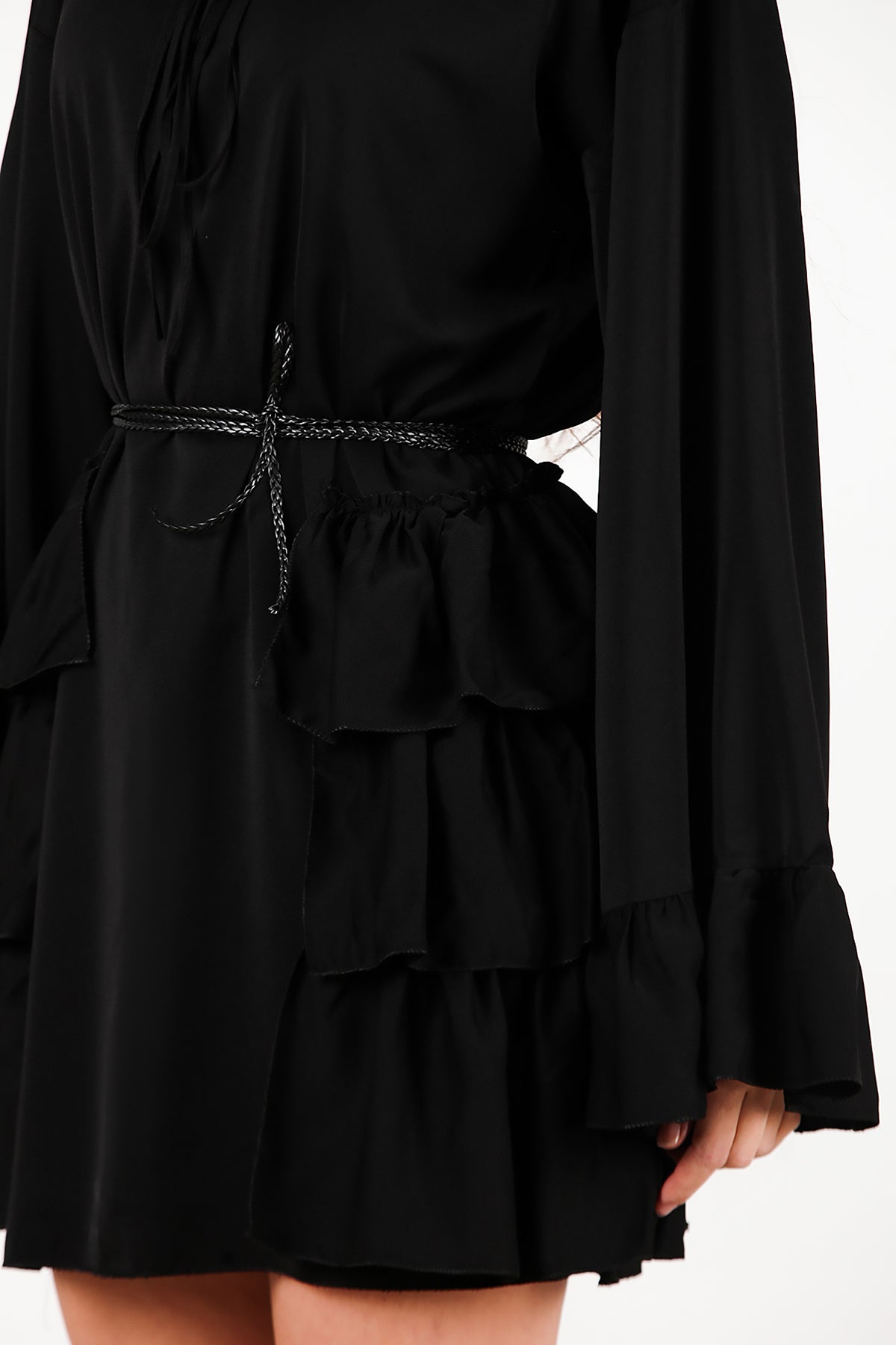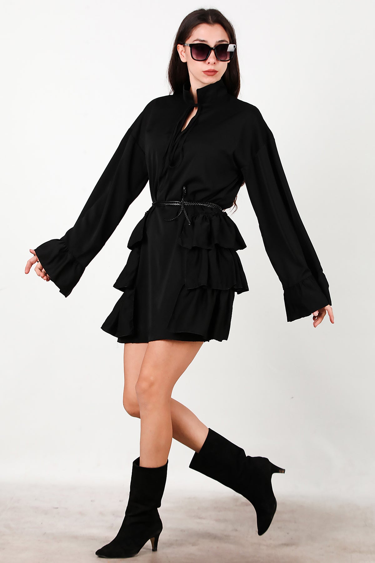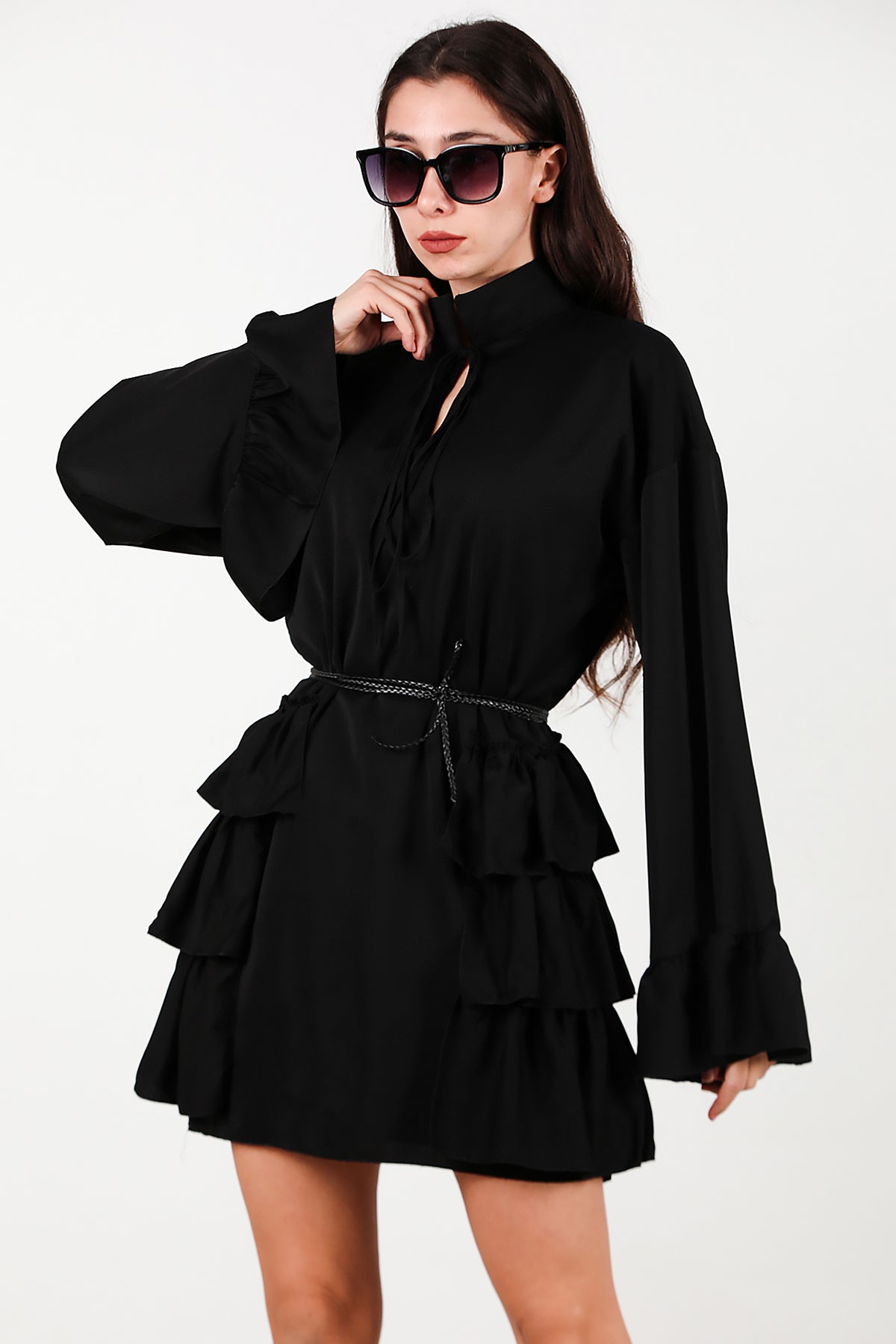 Kadın Yan Ve Kol Ucu Fırfırlı Saten Elbise Siyah