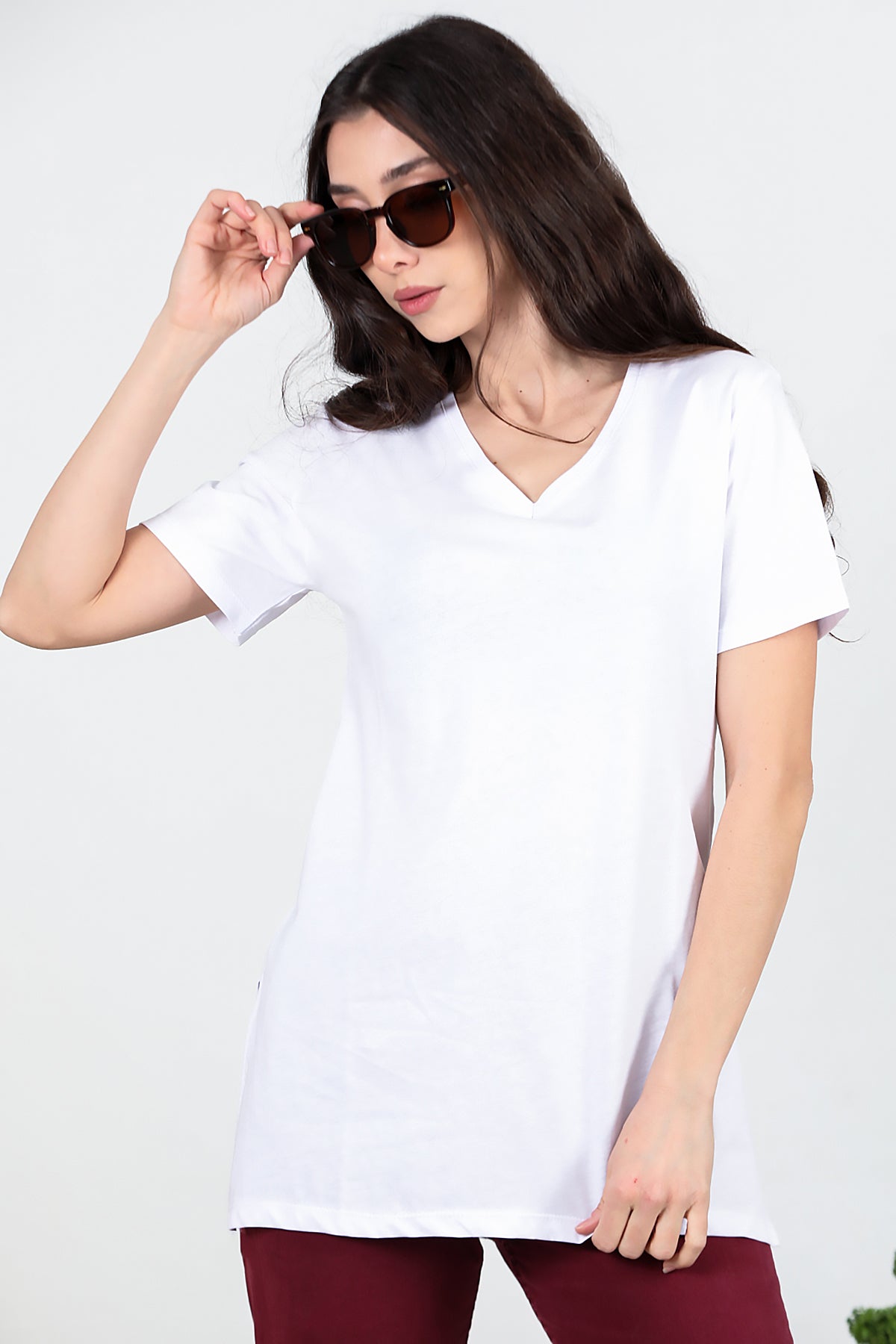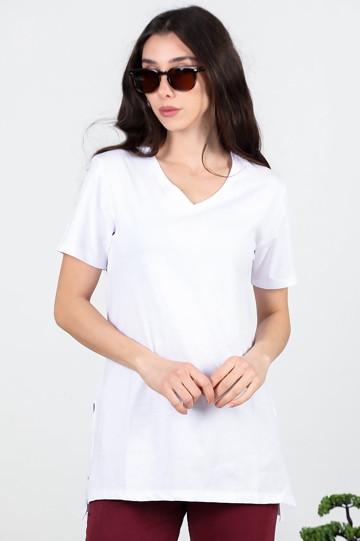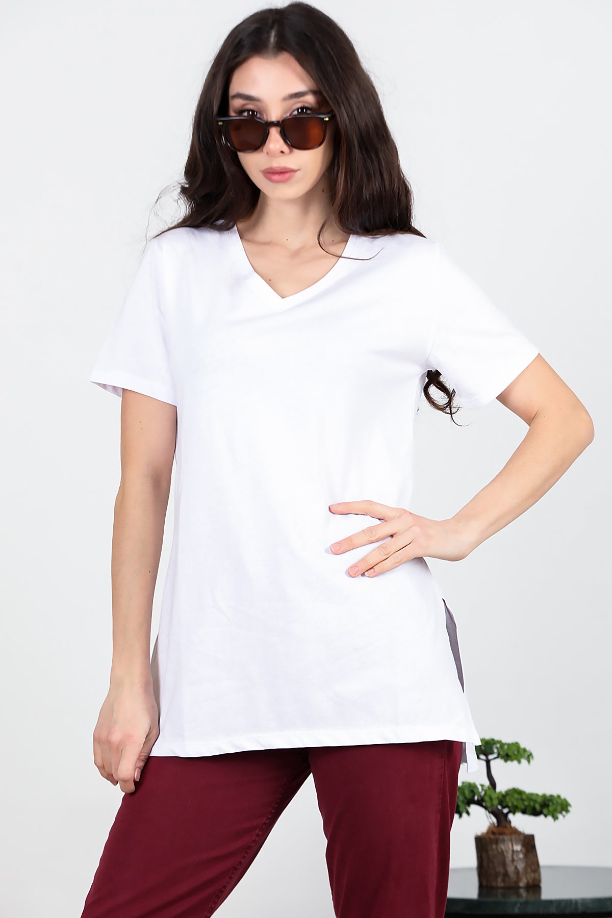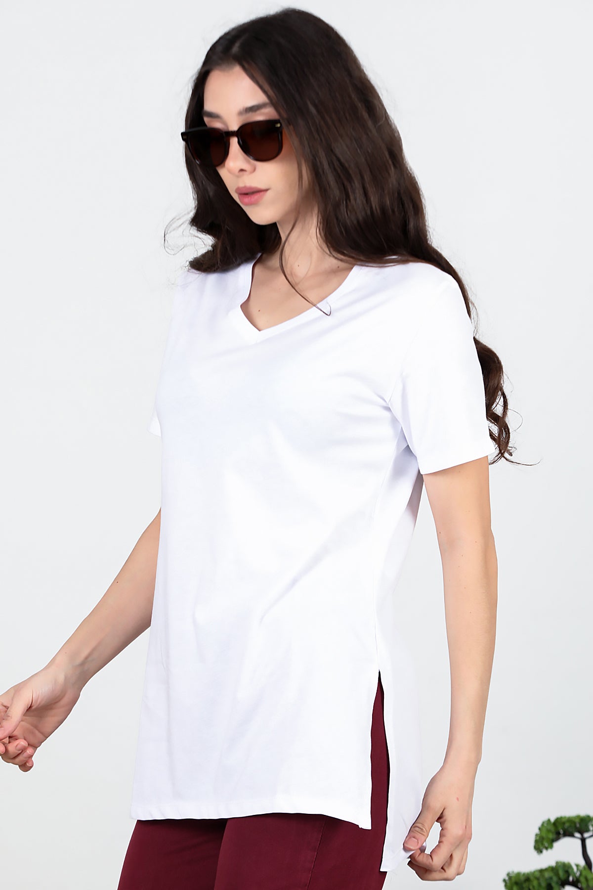 Kadın Yan Yırtmaçlı V Yaka T-shırt Beyaz
