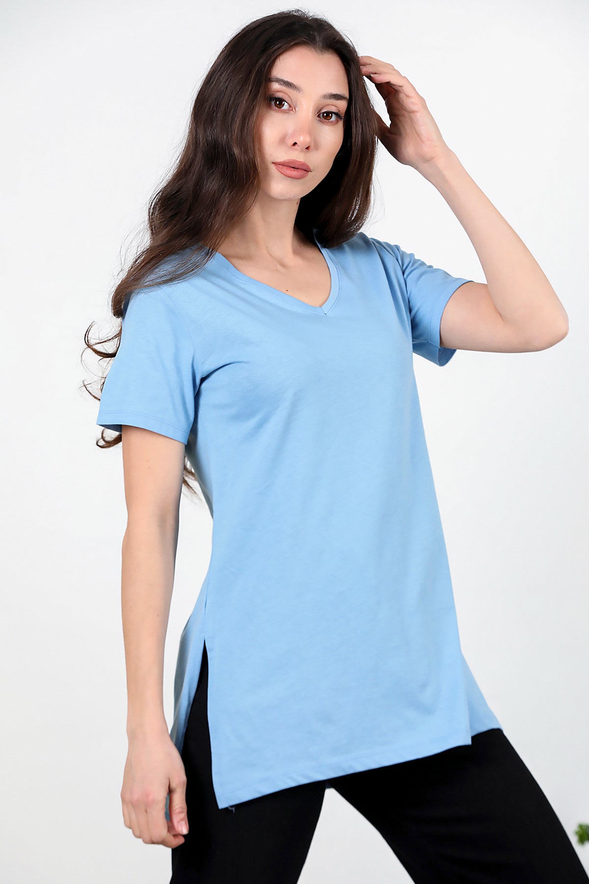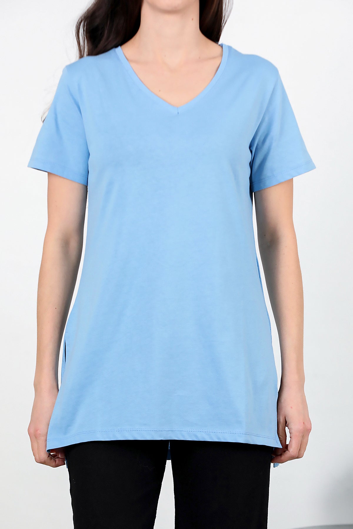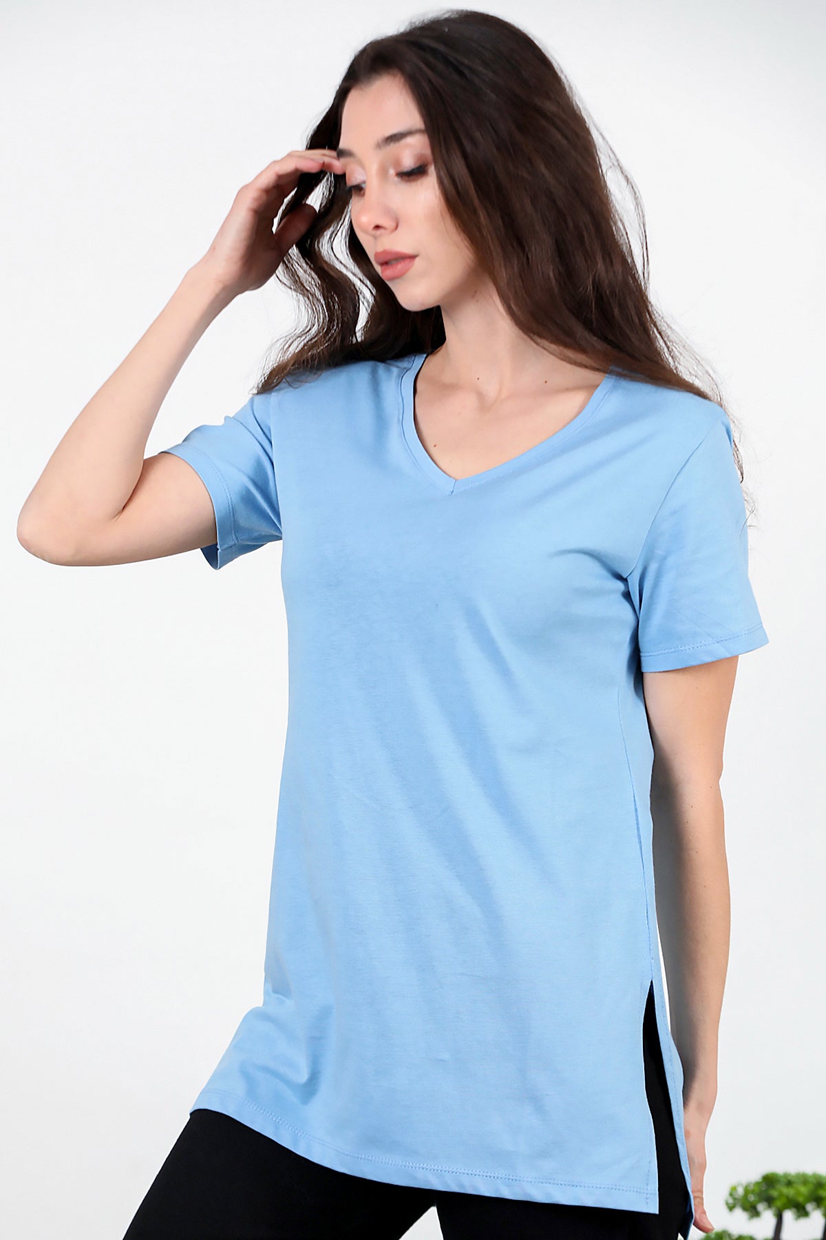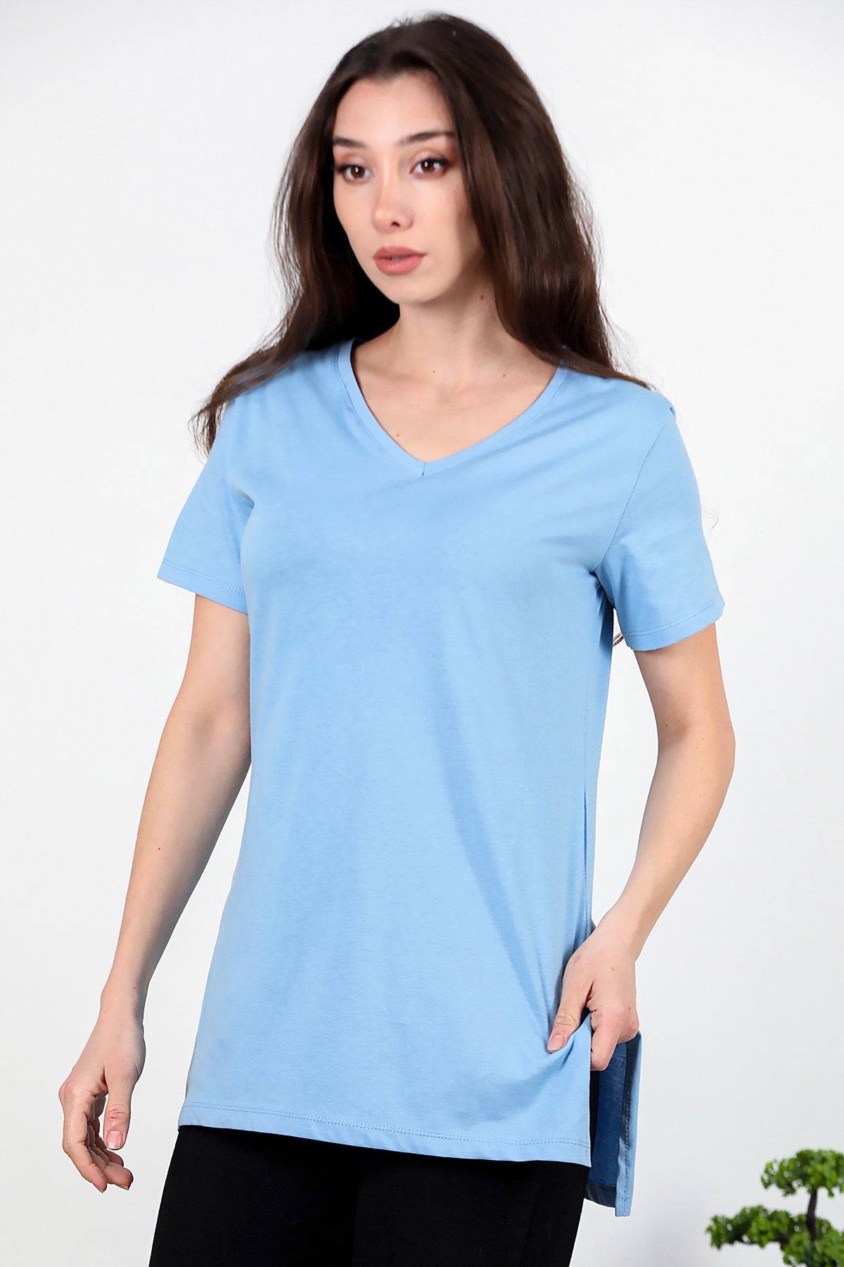 Kadın Yan Yırtmaçlı V Yaka T-shırt Mavi