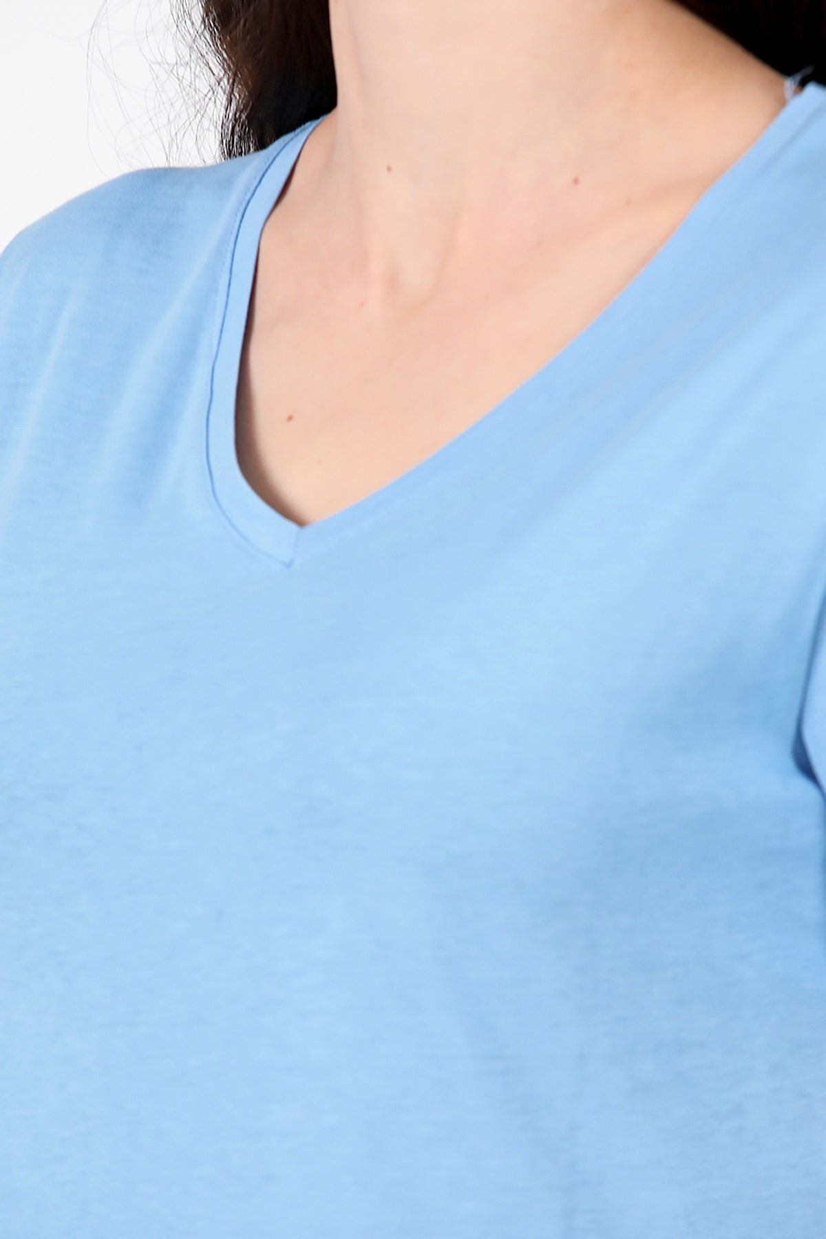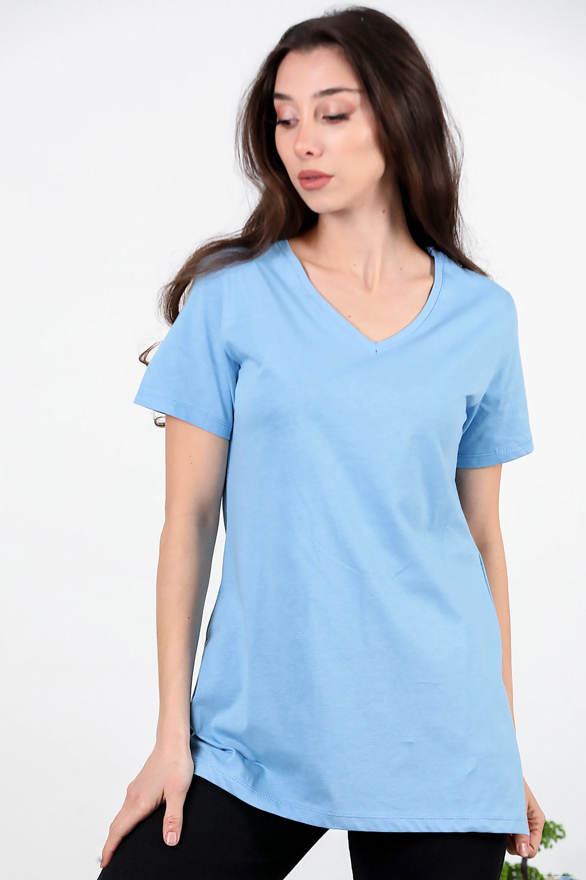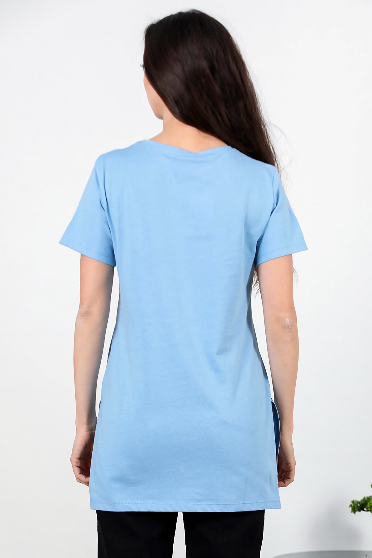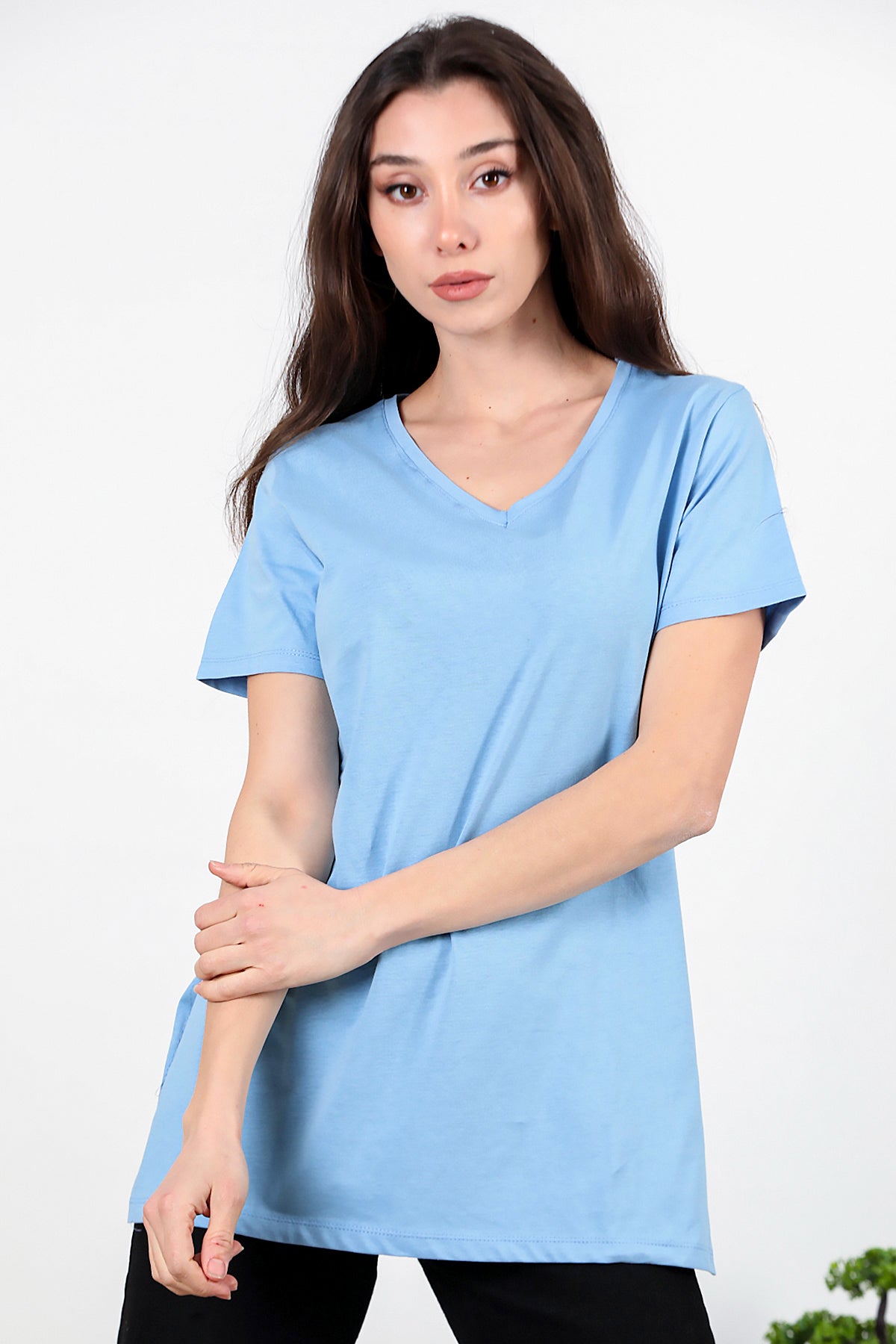 Kadın Yan Yırtmaçlı V Yaka T-shırt Mavi
