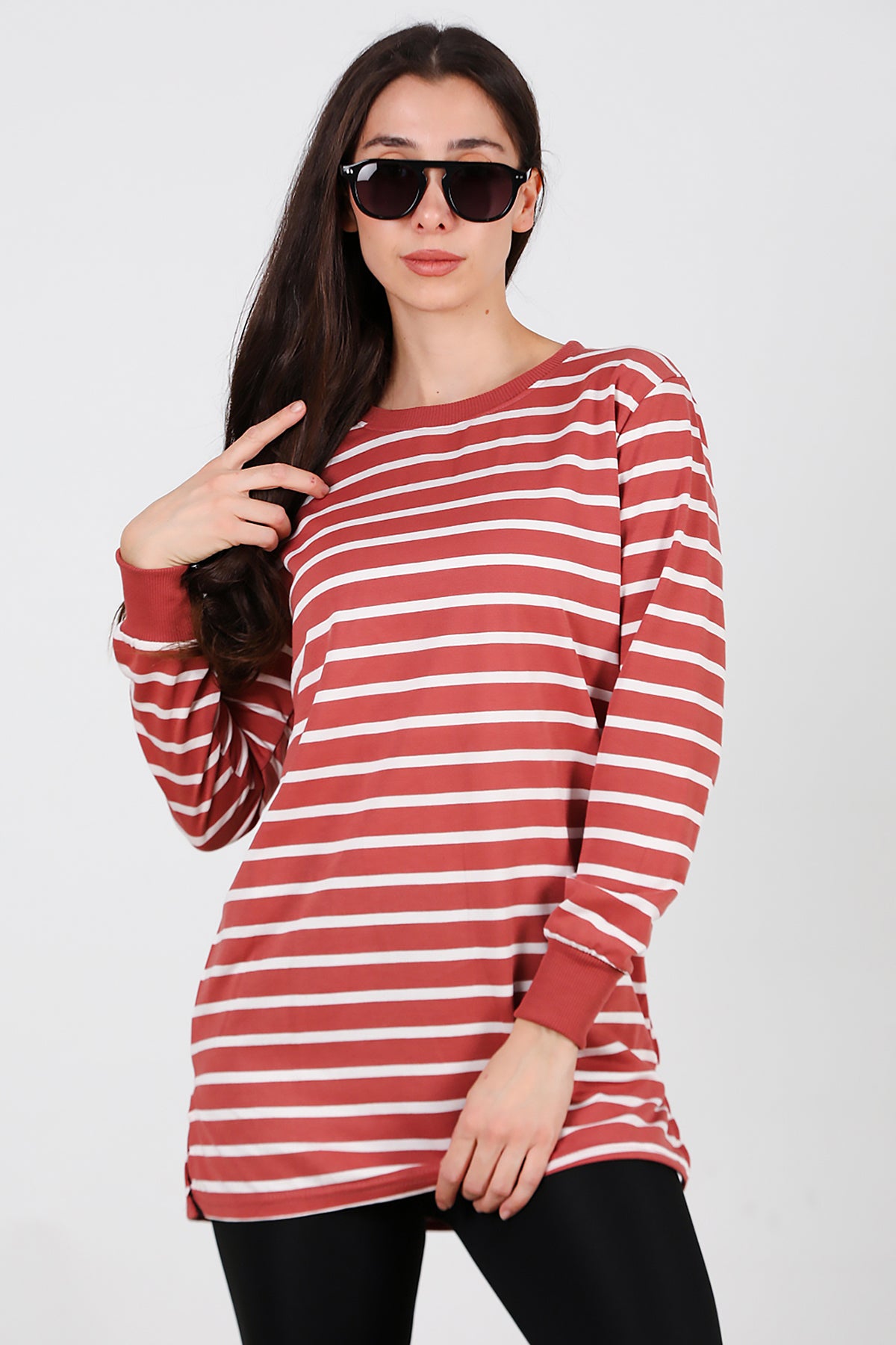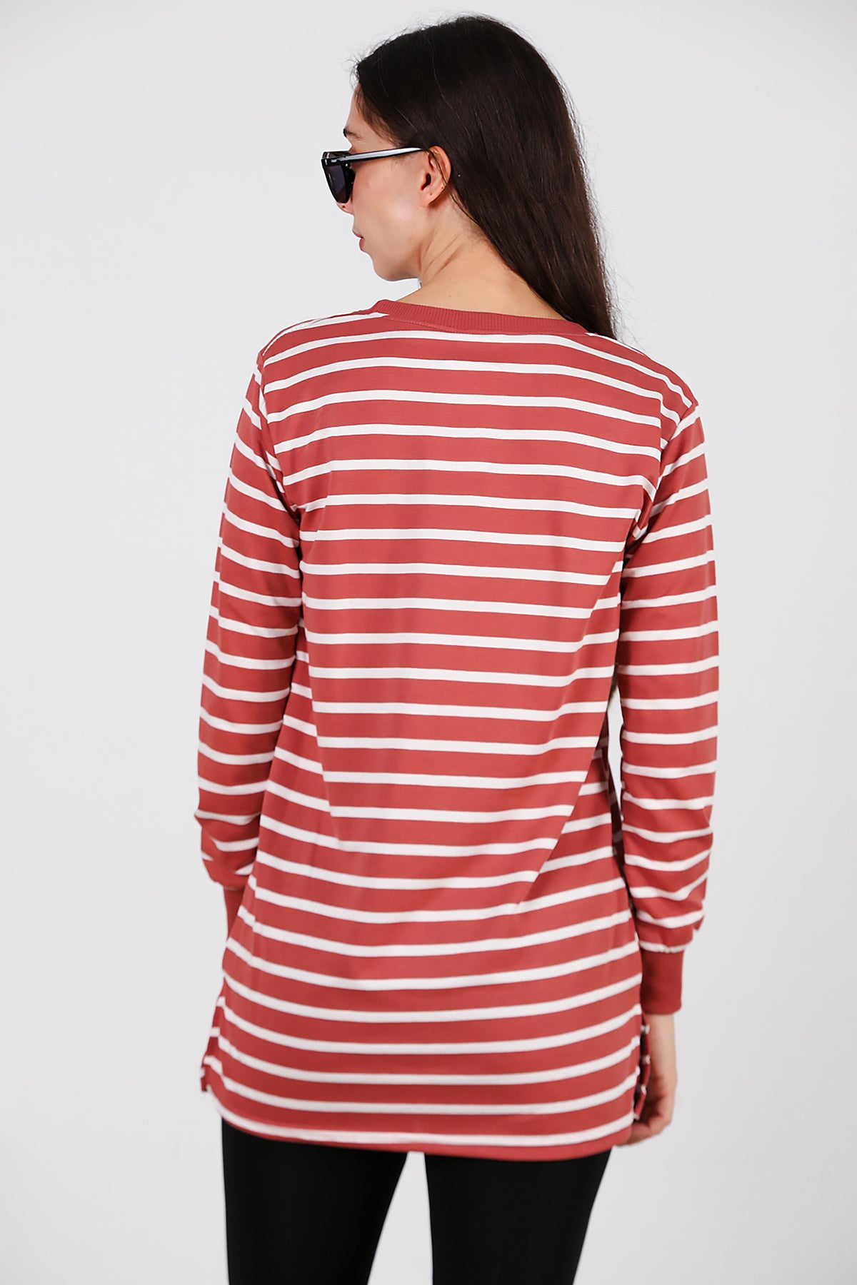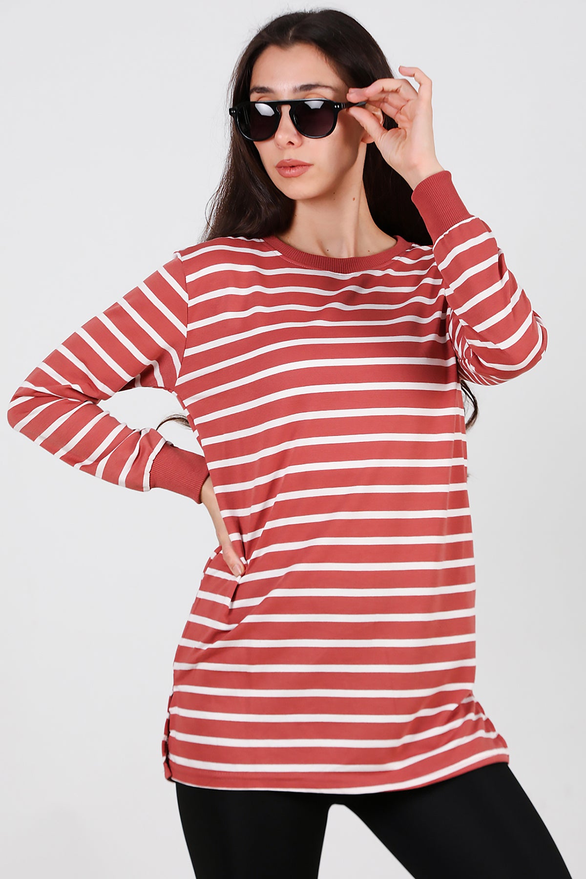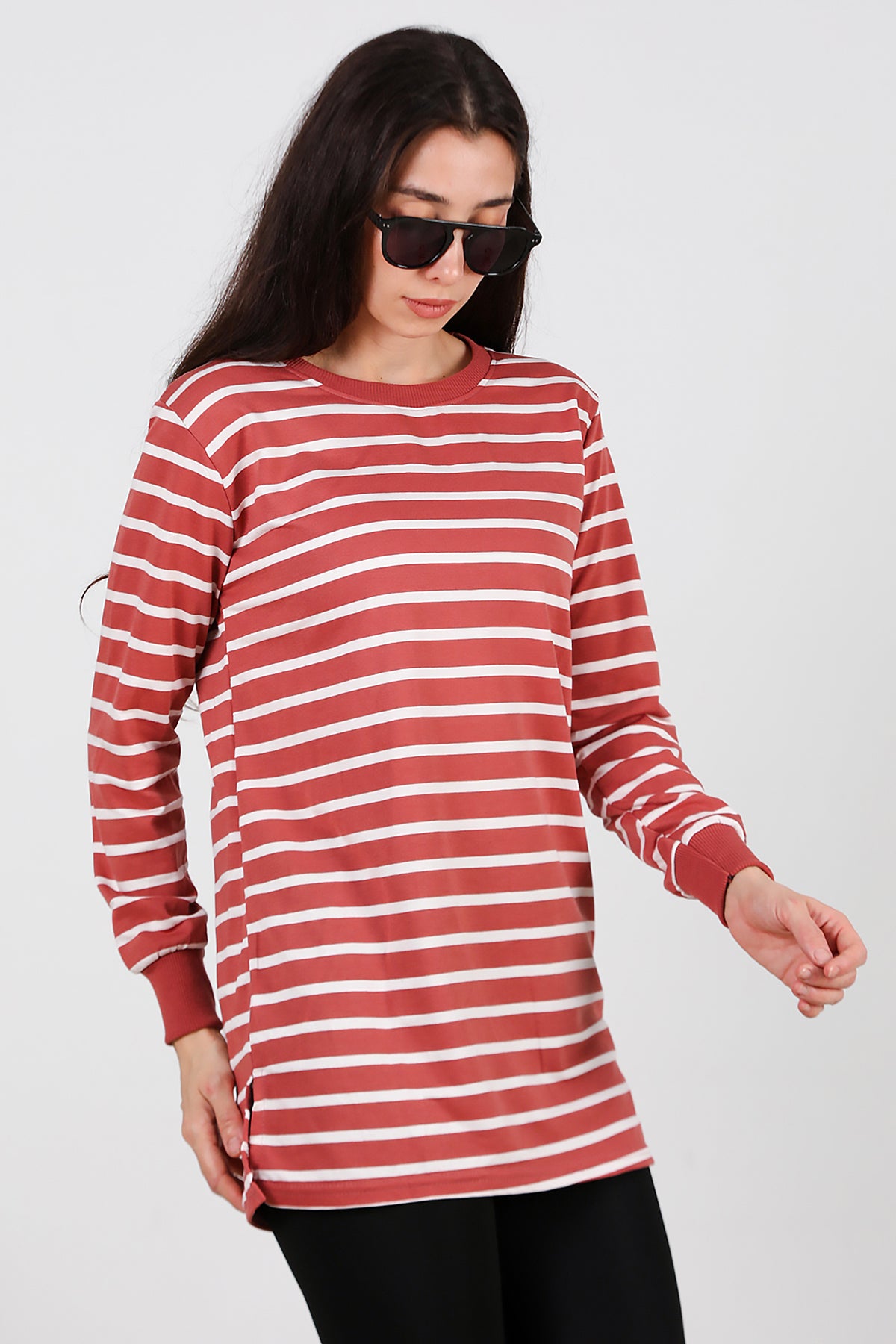 Kadın Yanı Yırtmaçlı Çizgili Tunik Gül Kurusu