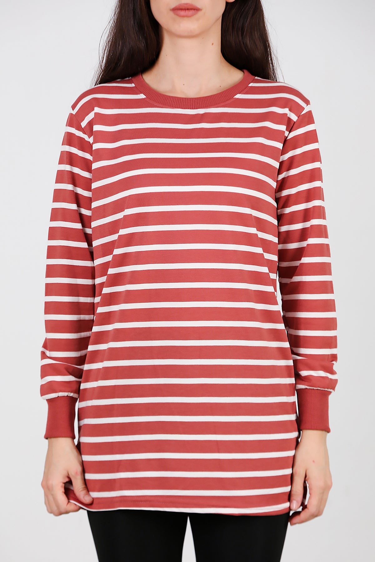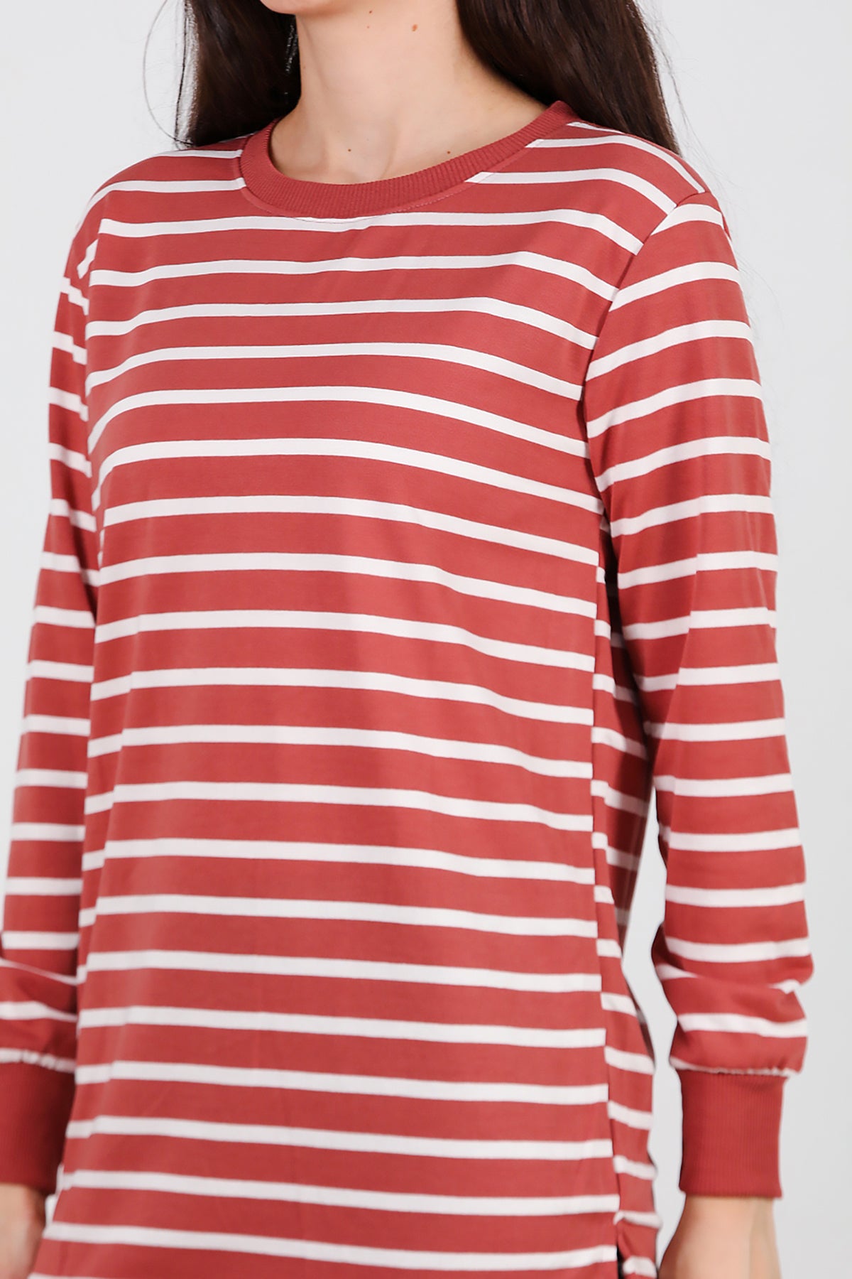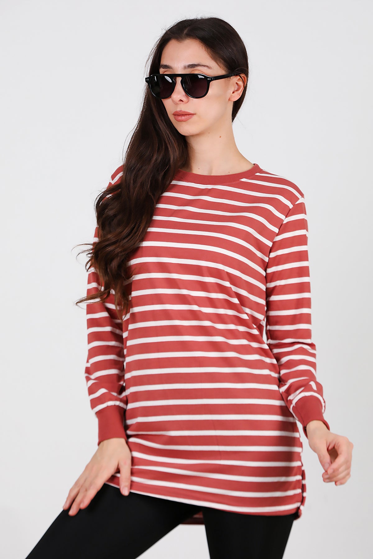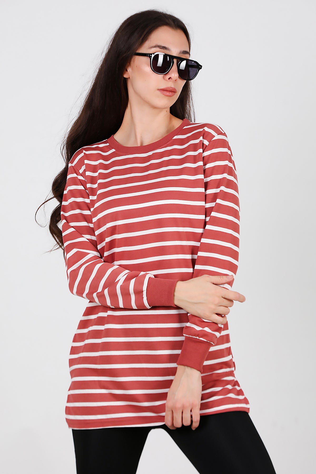 Kadın Yanı Yırtmaçlı Çizgili Tunik Gül Kurusu