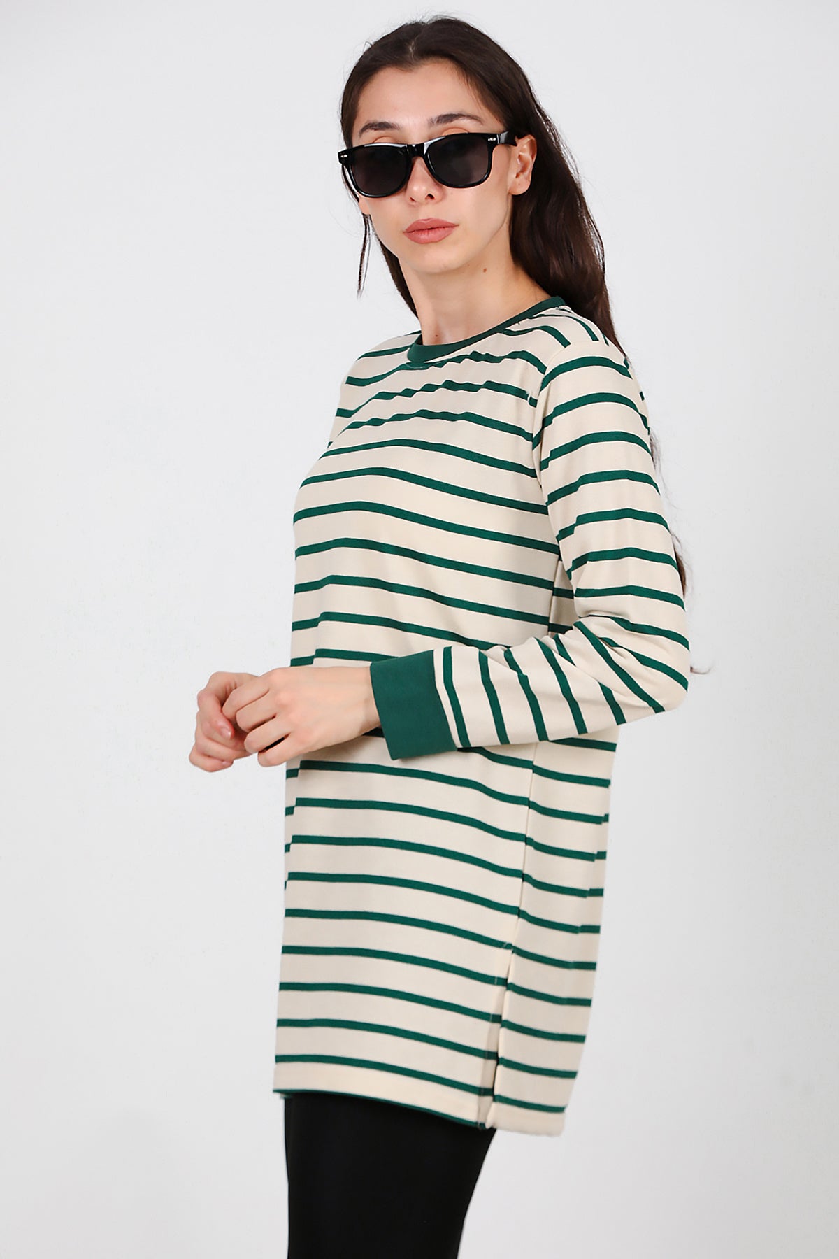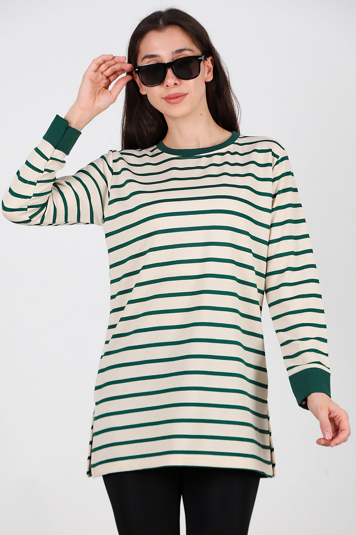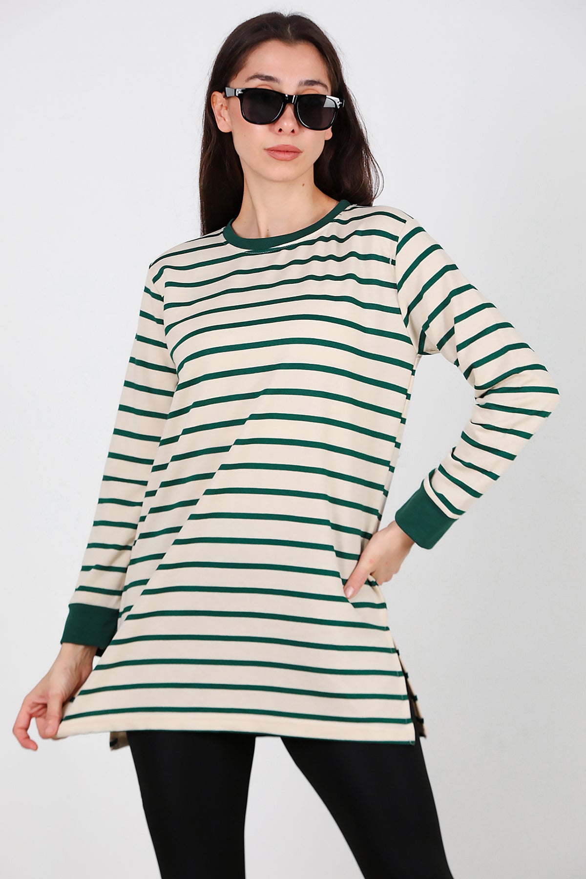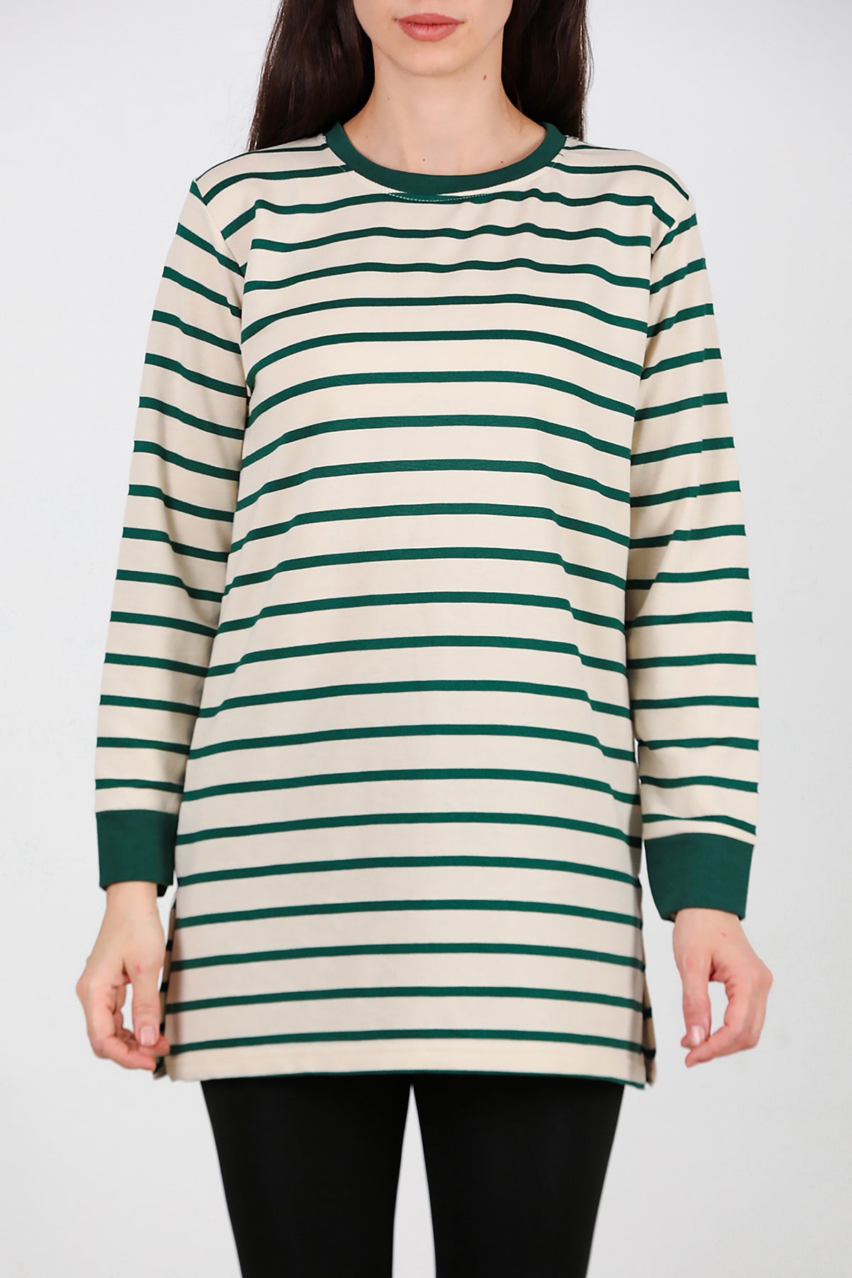 Kadın Yanı Yırtmaçlı Çizgili Tunik Yeşil
