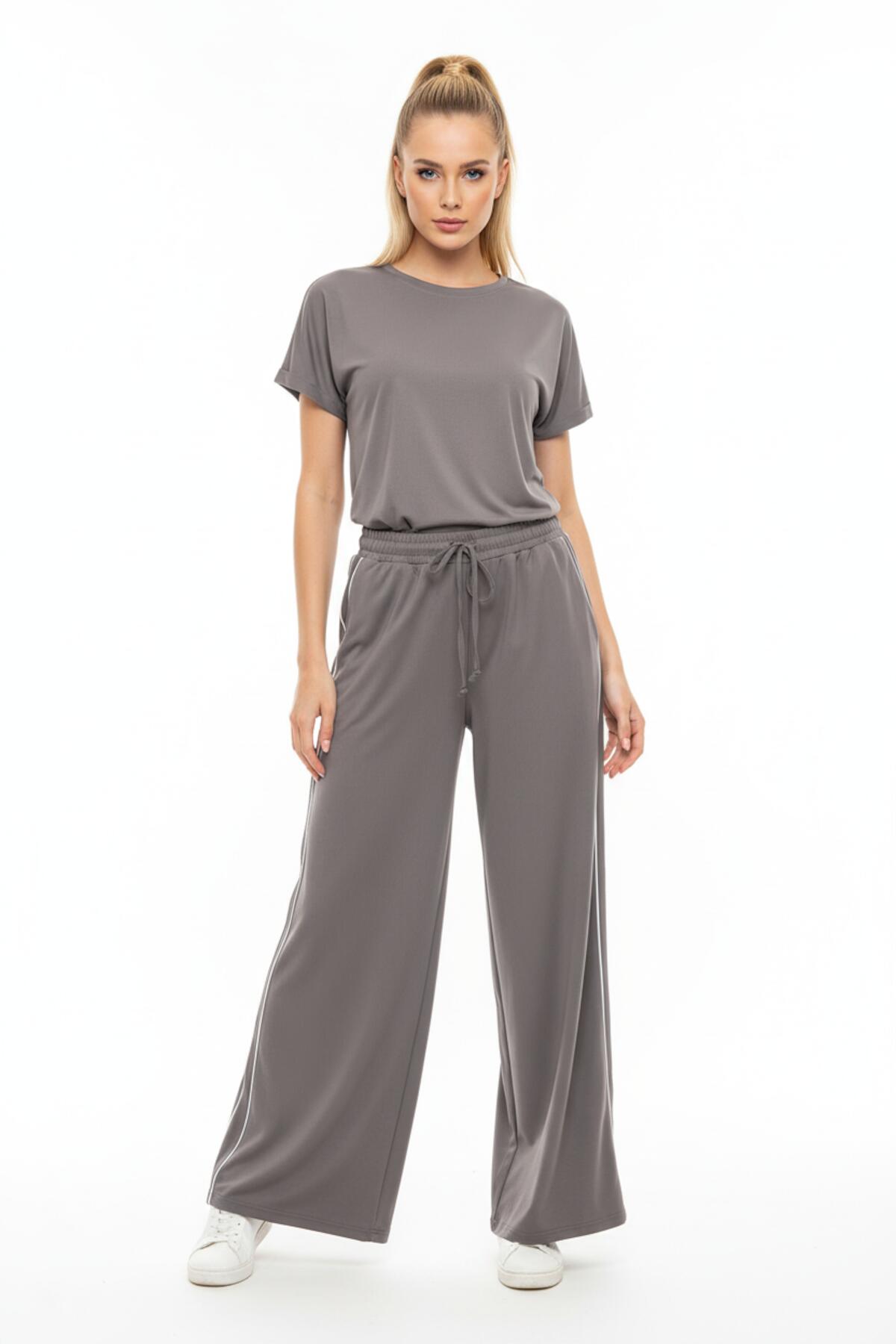 Kadın Yanları Biyeli Cepli Bol Paça Pantolon Gri