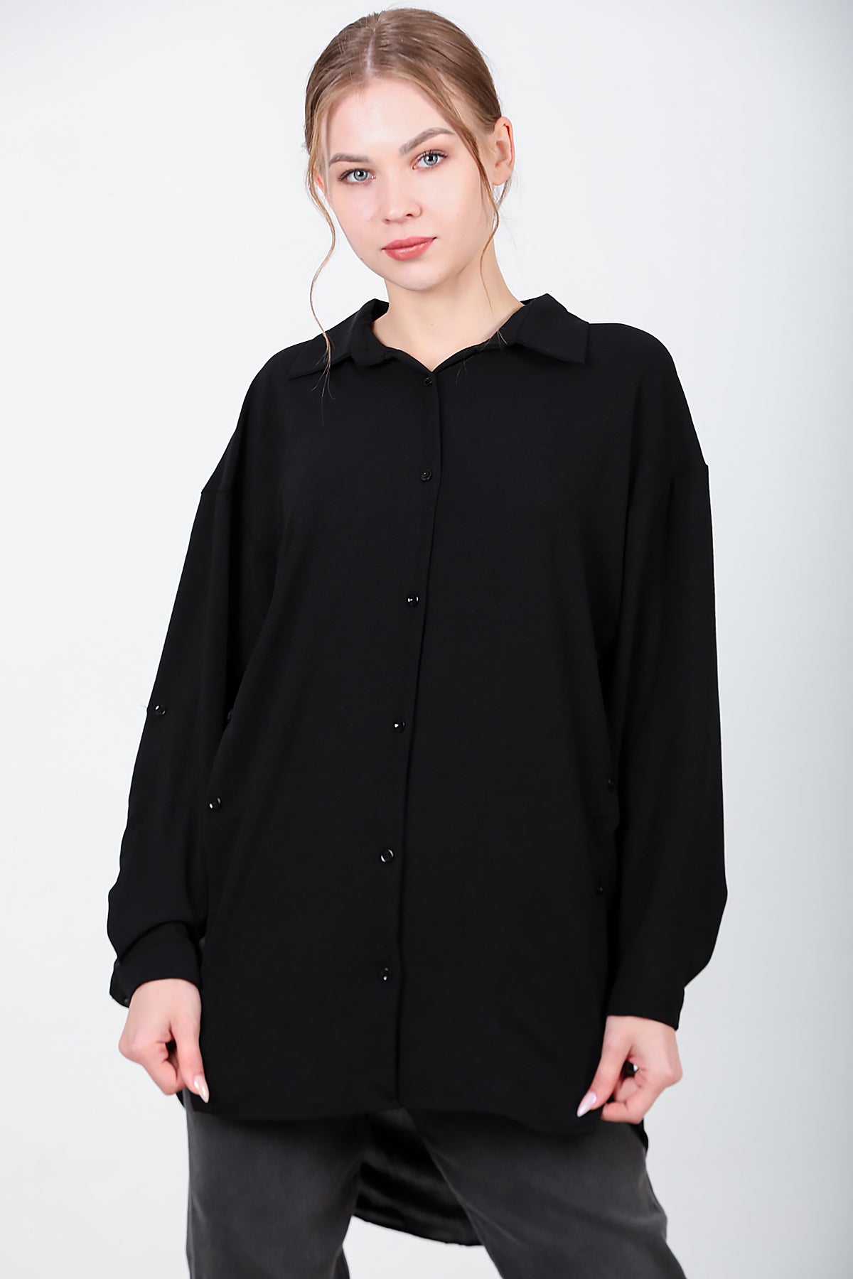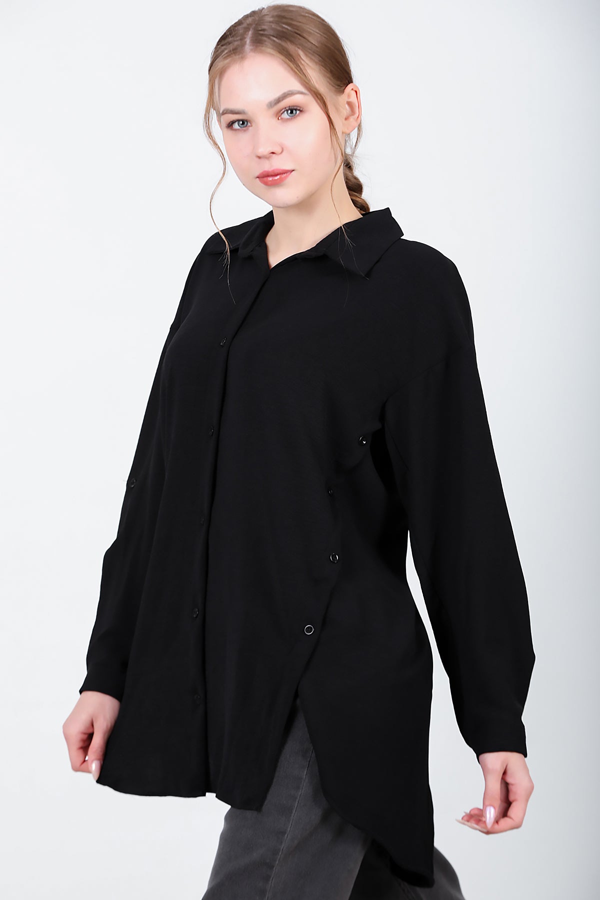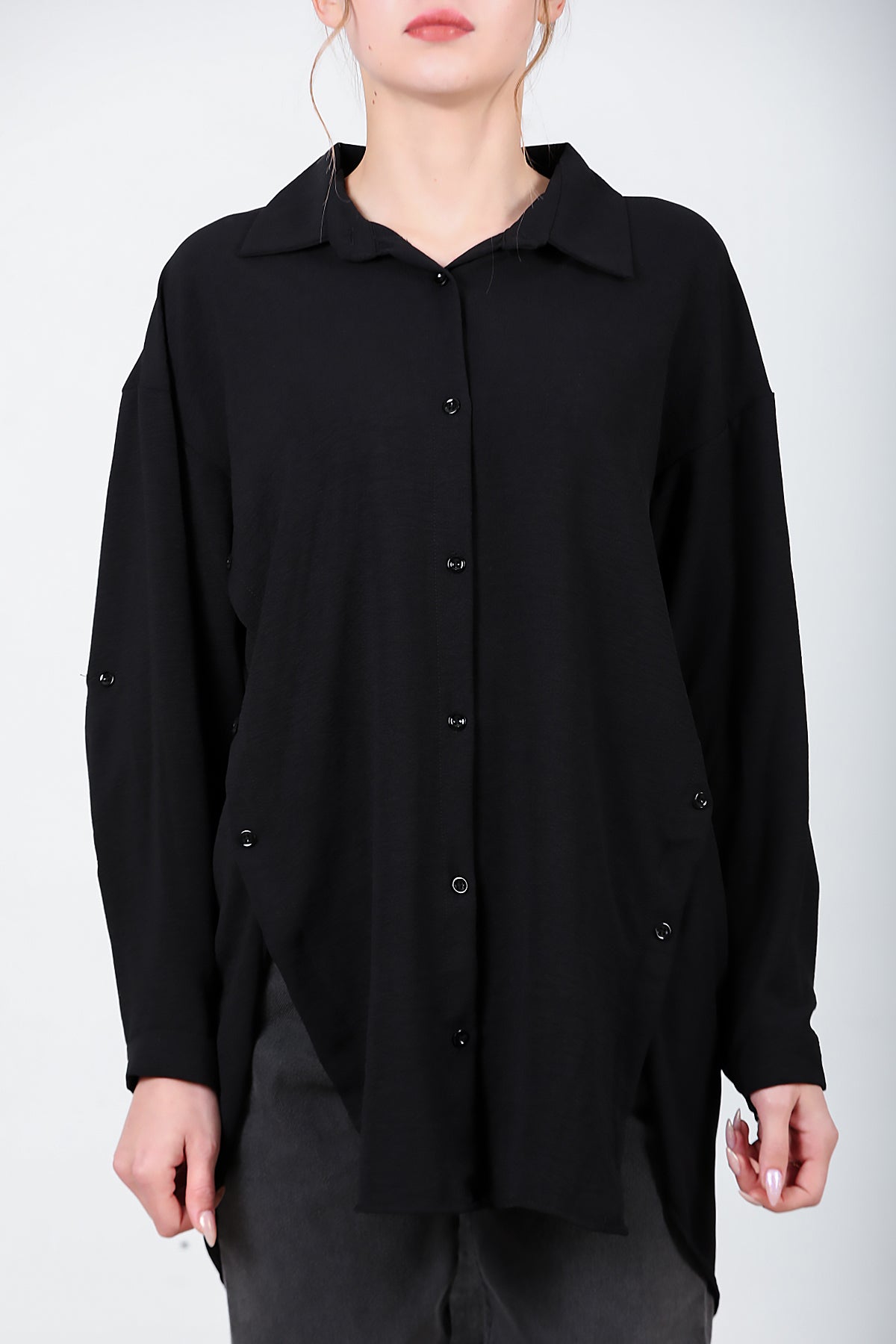 Kadın Yanları Düğmeli Gömlek Siyah