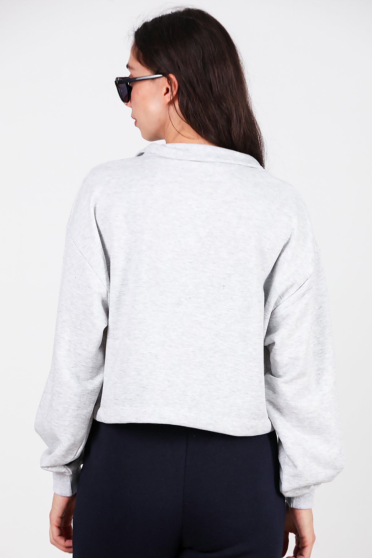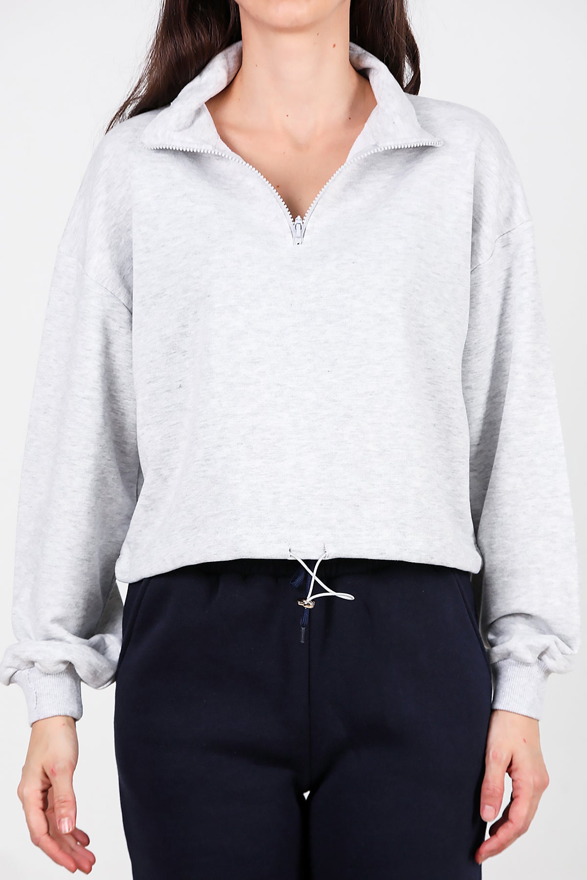 Kadın Yarım Fermuar Dik Yaka Bel Lastikli Sweat Gri