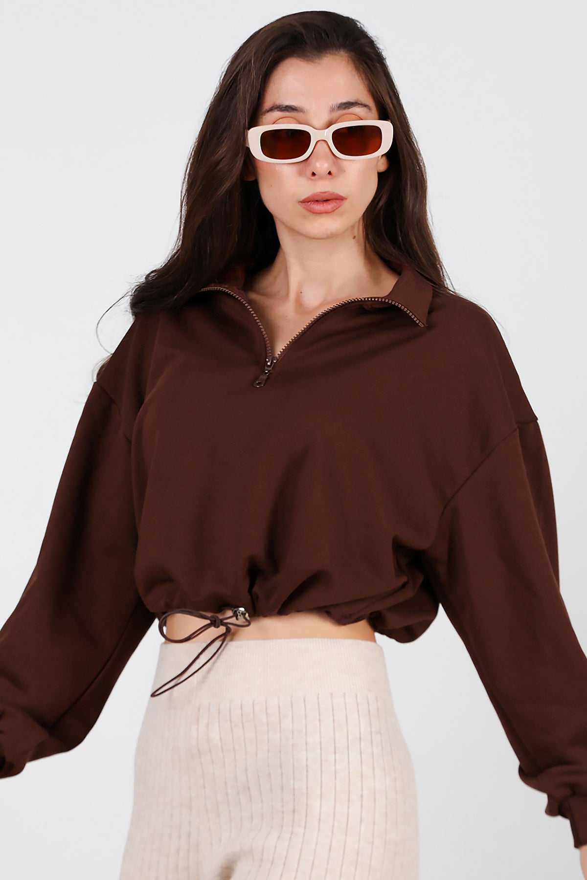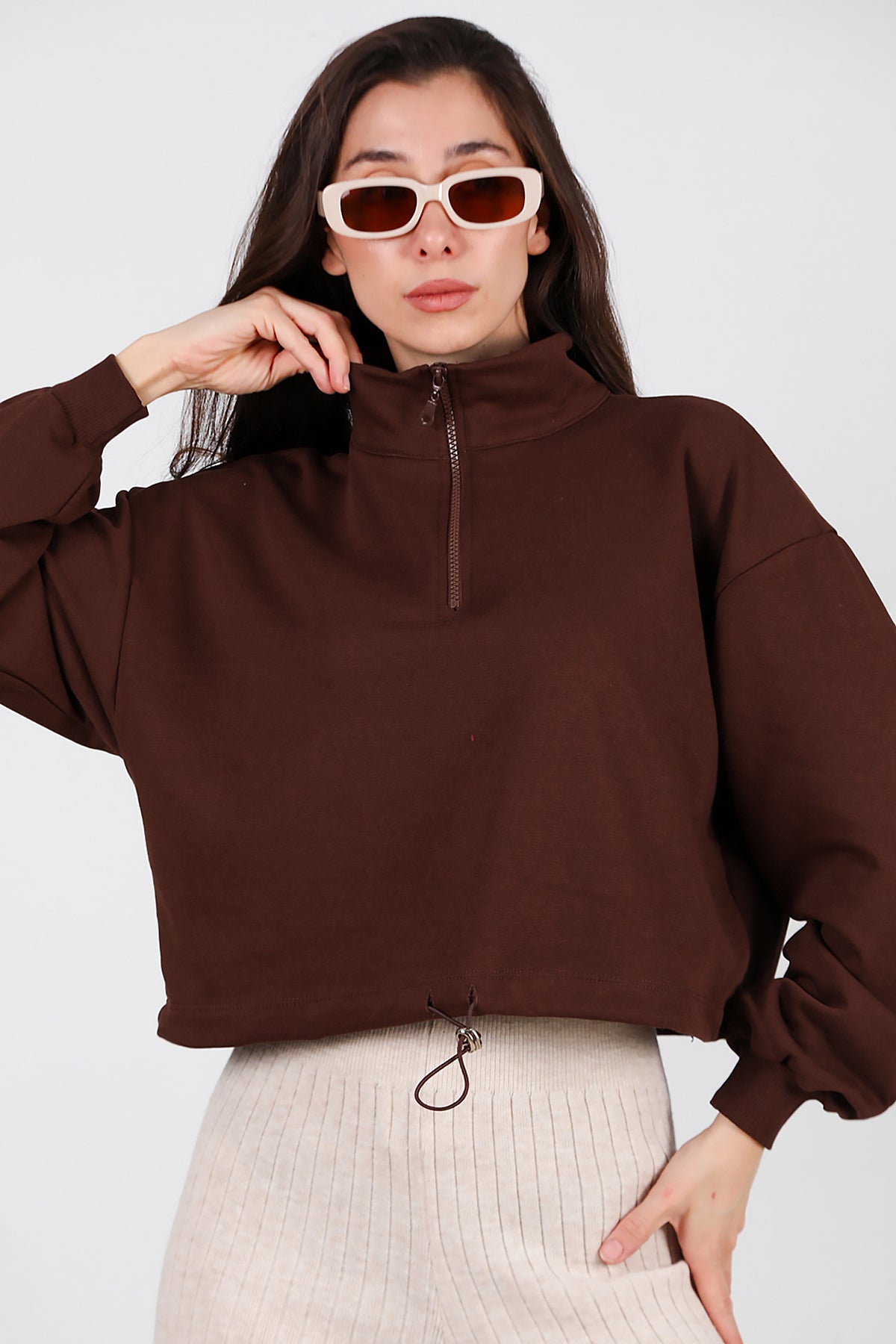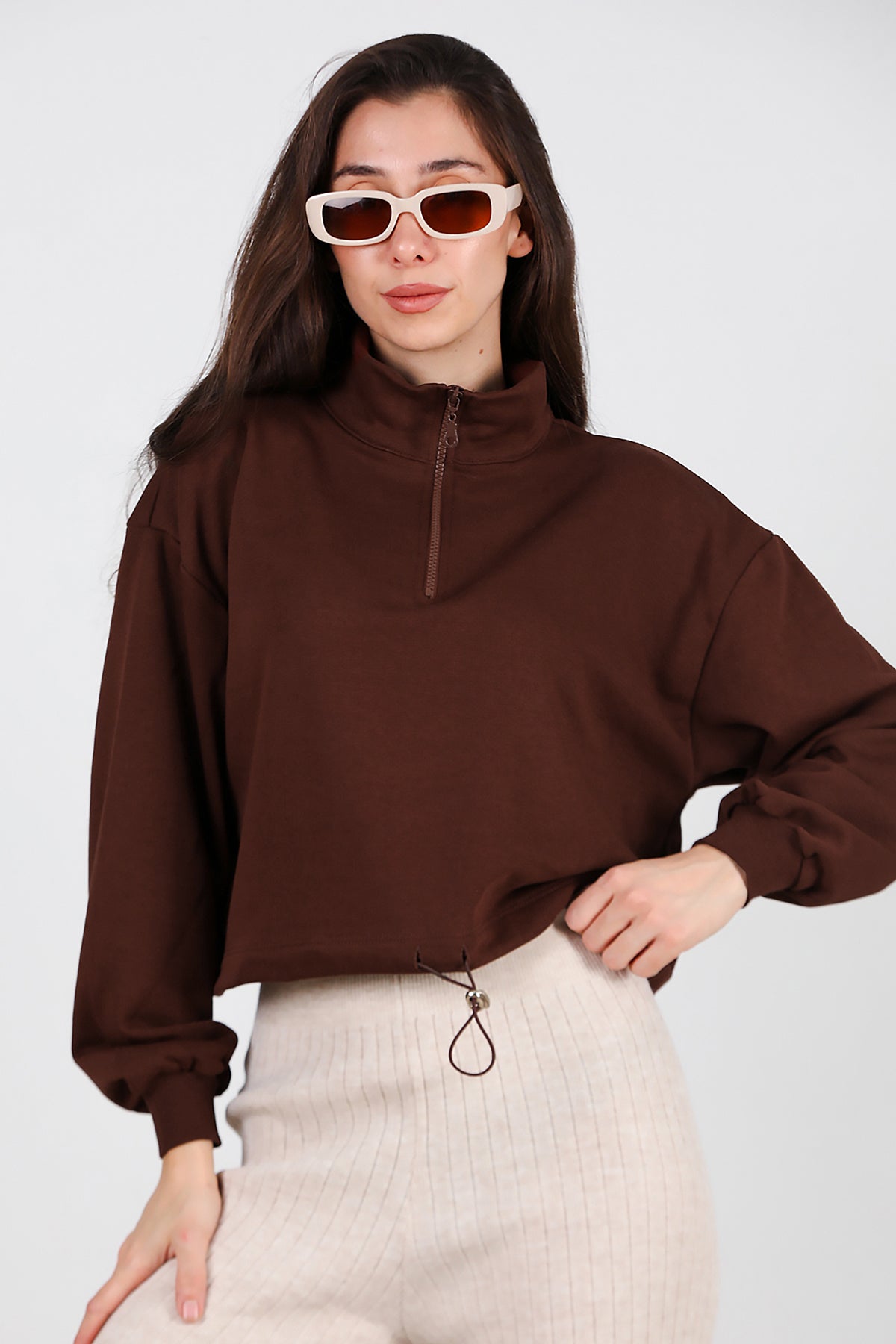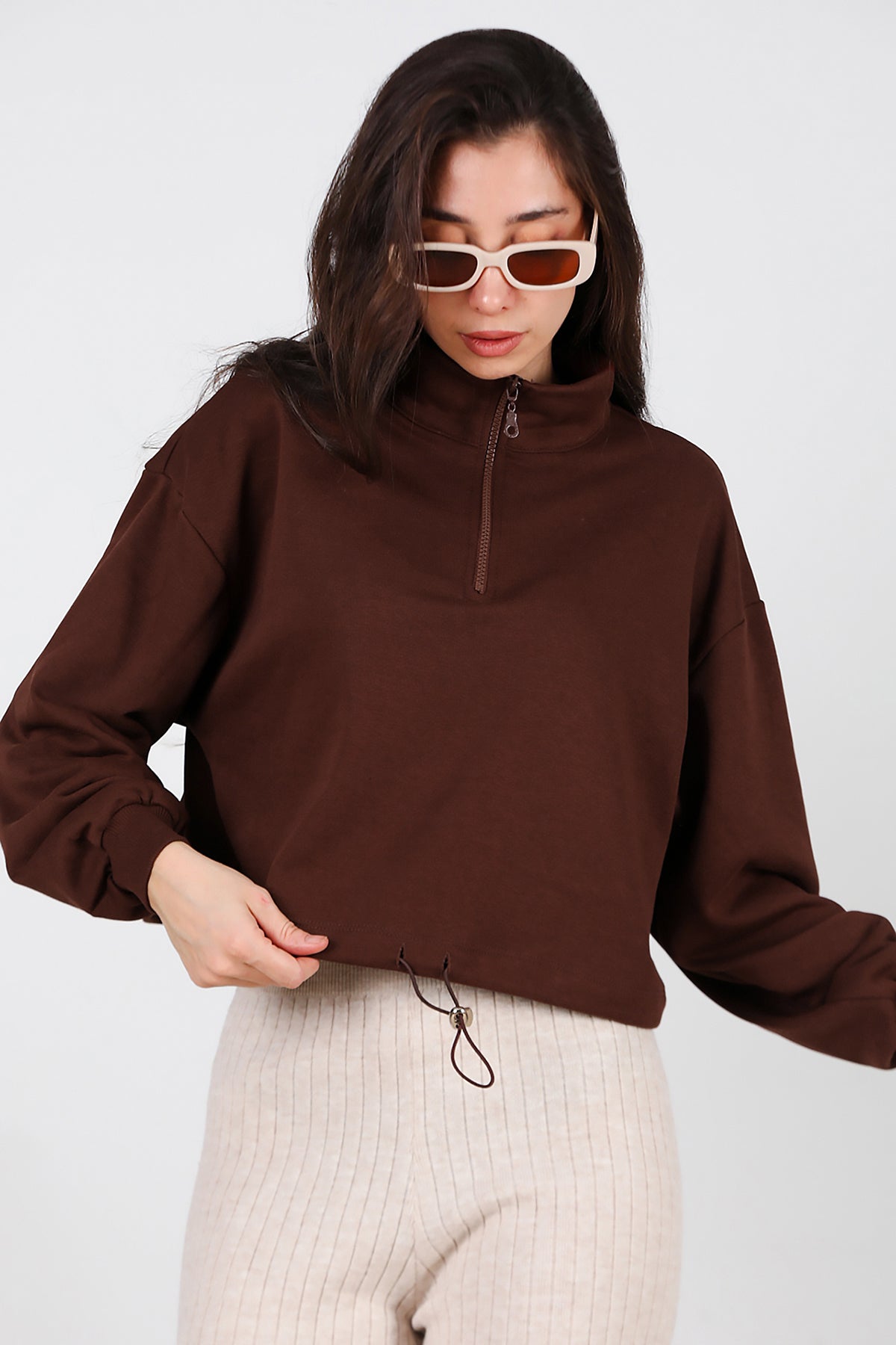 Kadın Yarım Fermuar Dik Yaka Bel Lastikli Sweat Kahverengi