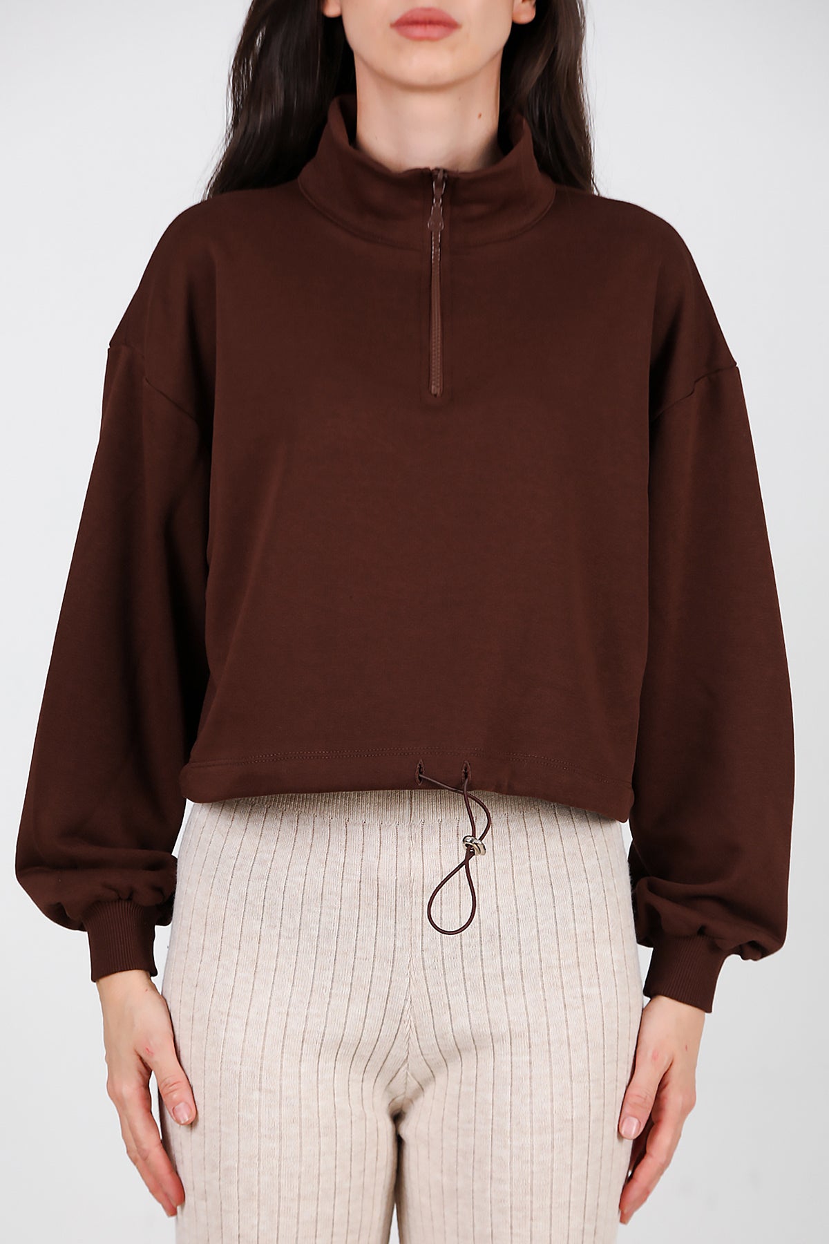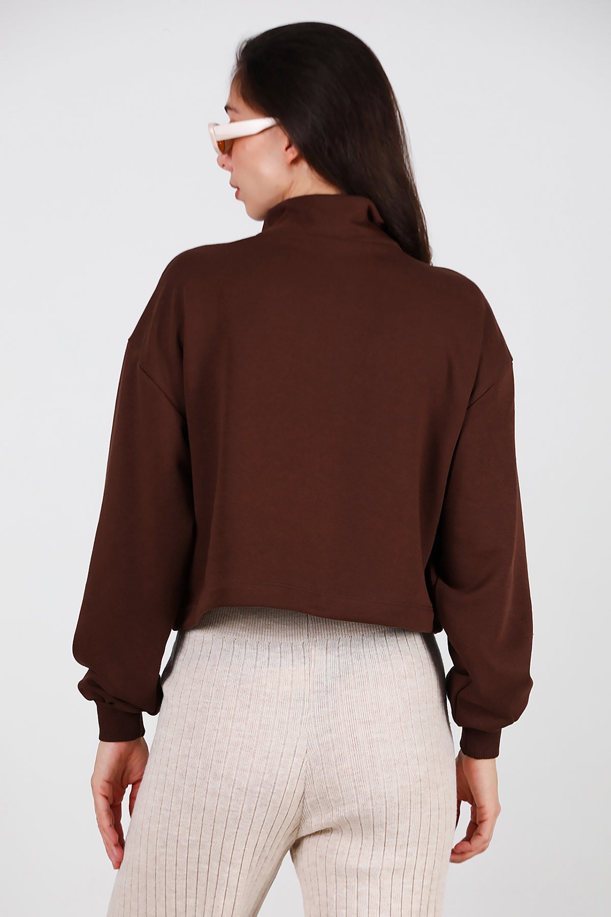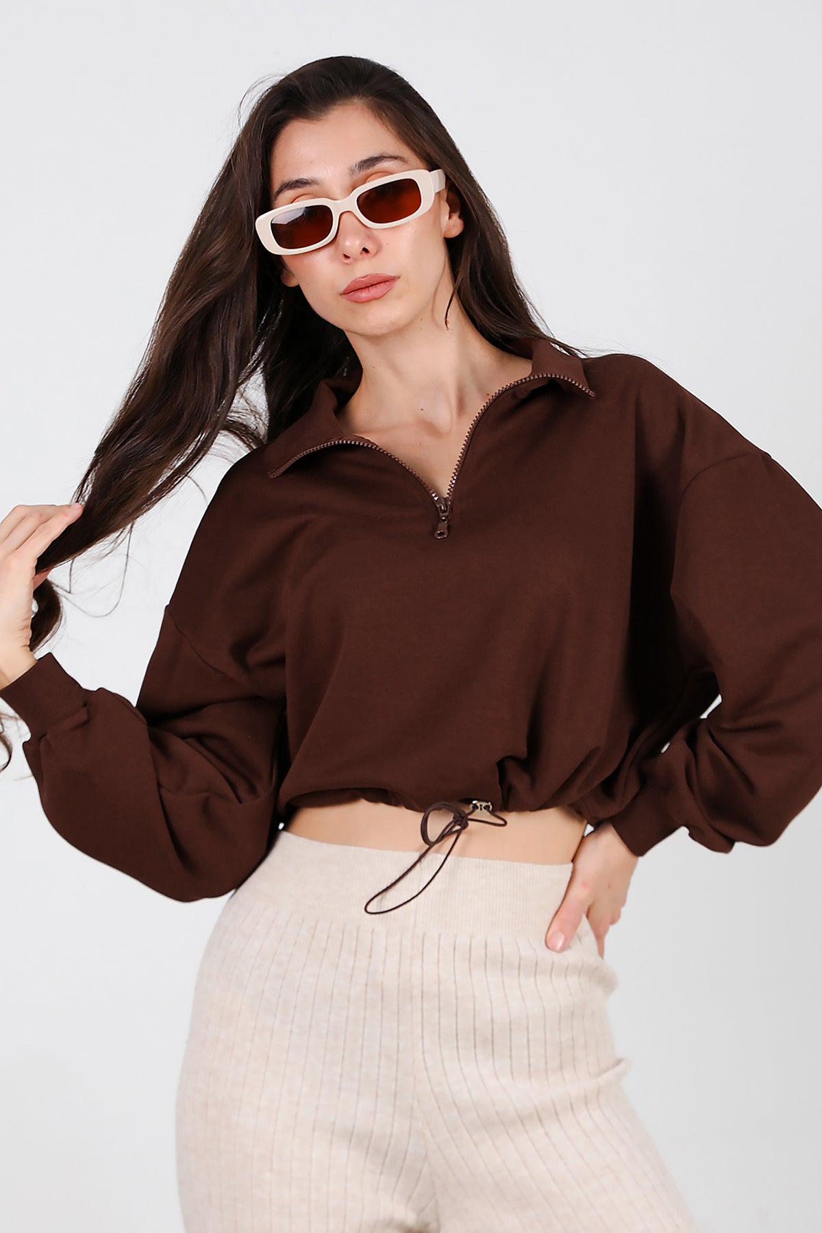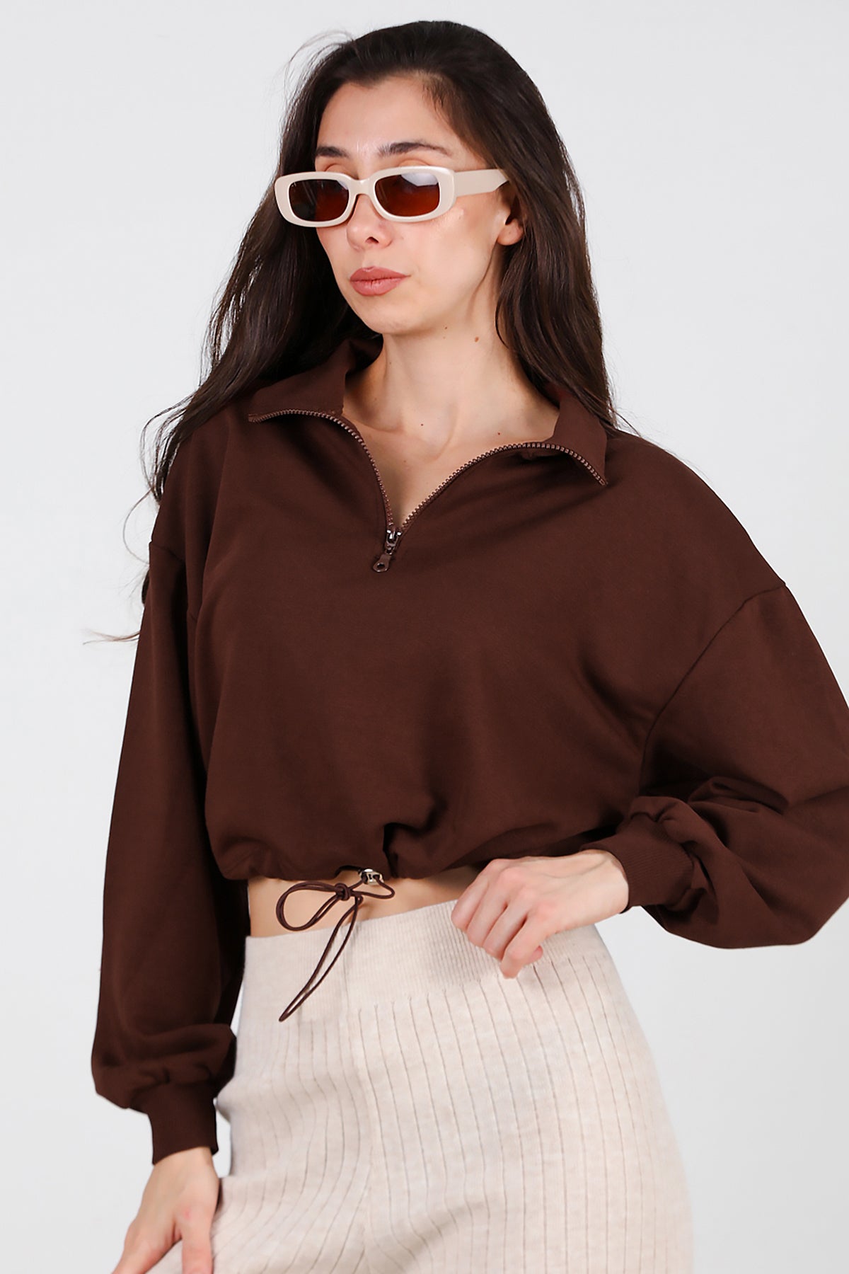 Kadın Yarım Fermuar Dik Yaka Bel Lastikli Sweat Kahverengi