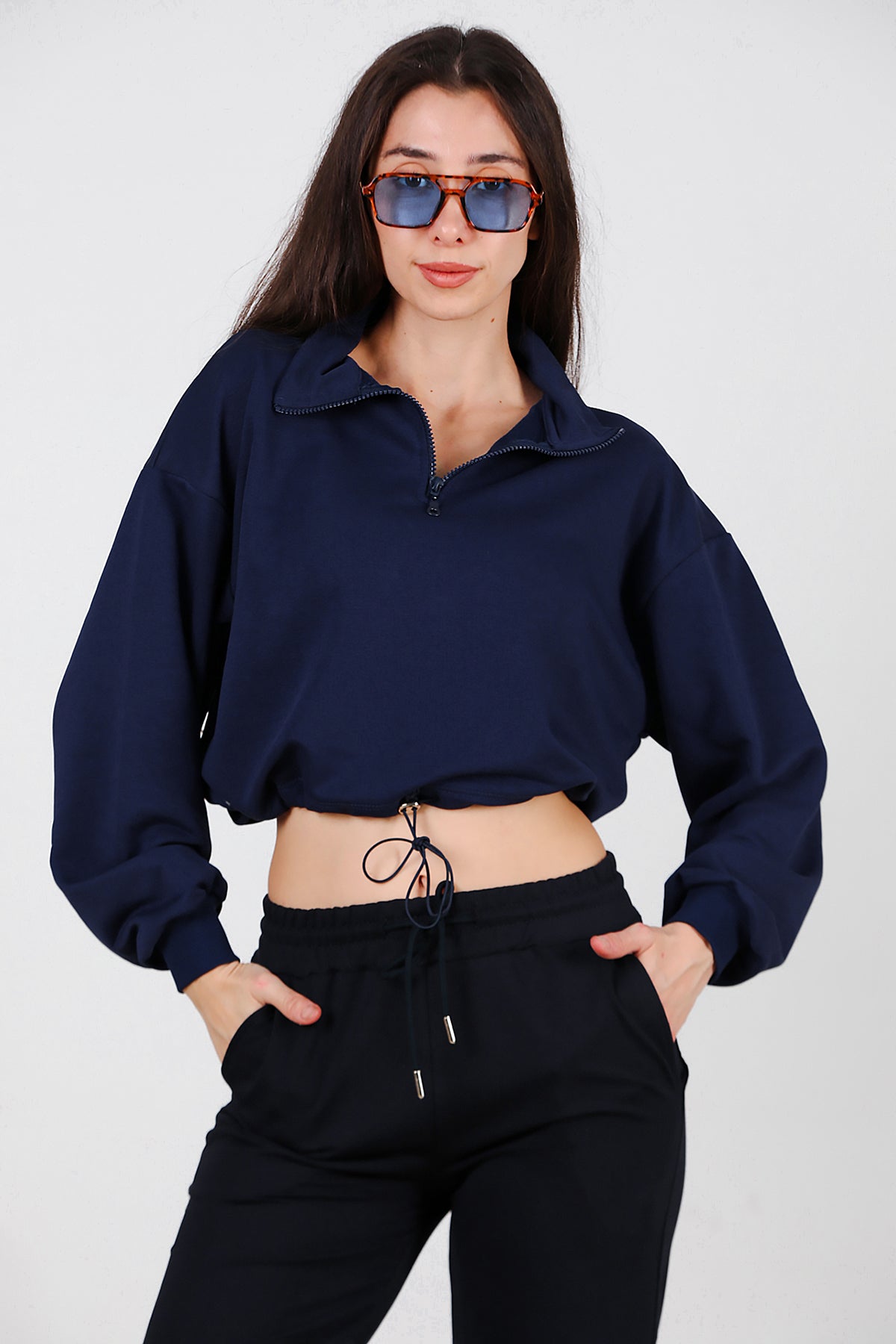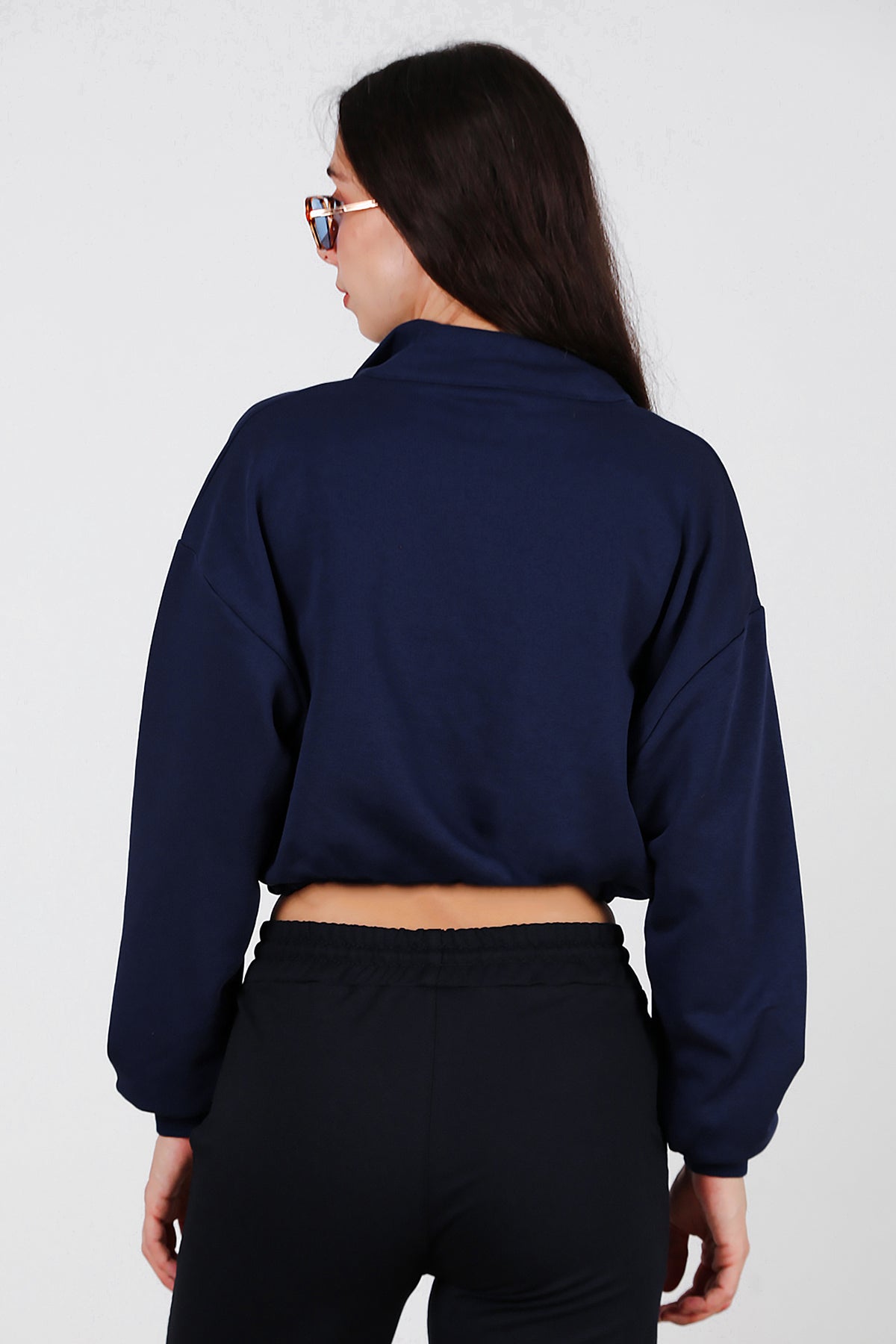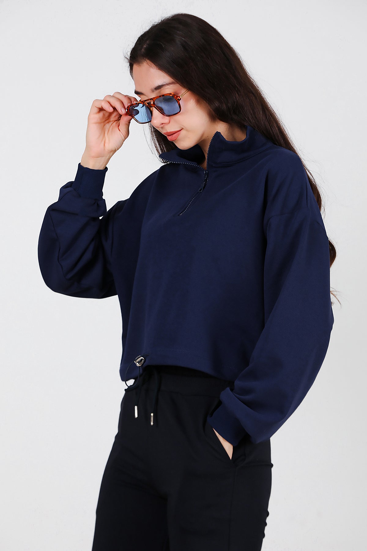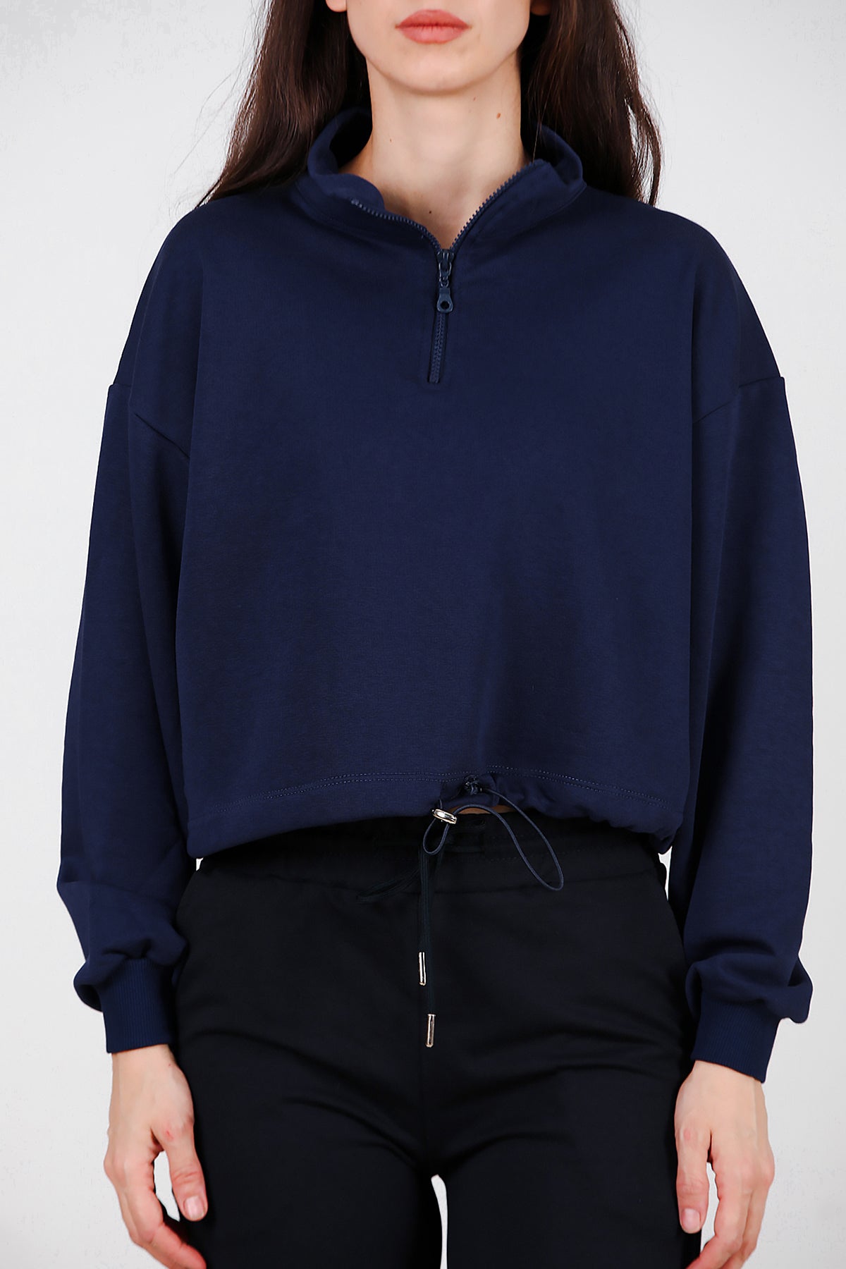 Kadın Yarım Fermuar Dik Yaka Bel Lastikli Sweat Lacivert